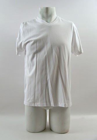 Will Caster (Johnny Depp) screen worn, black knit with shawl collar button front cardigan sweater, white long sleeve button front 'John Varvatos' dress shirt, white cotton aged and worn short sleeve v-neck 'Banana Republic' t-shirt, (size M) and double's grey ankle suede lace up with stitching 'John Varvatos' shoes.