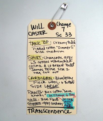 Will Caster (Johnny Depp) screen worn, hero, blue/grey fleck wool six button cardigan sweater, (size L) charcoal grey long sleeve cotton 'James Perse' shirt, (size 2) and cream teched ribbed cotton 'Zimmerli' tank top. (size M) Includes wardrobe tag!