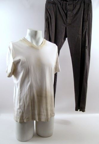 Will Caster (Johnny Depp) screen worn, white cotton aged and worn short sleeve v-neck 'Banana Republic' t-shirt, (size M) and grey cotton salt and pepper aged and torn pants.