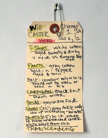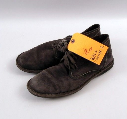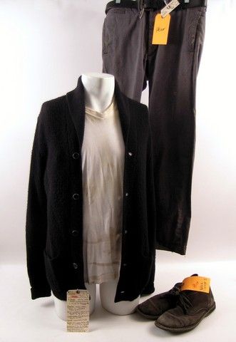 Will Caster (Johnny Depp) screen worn, hero, black knit with shawl collar button front cardigan sweater, white cotton aged and worn short sleeve v-neck 'Banana Republic' t-shirt, (size M) black leather belt, grey cotton salt and peper aged and torn pants, and grey ankle suede lace up with stiching 'John Varvatos' shoes. Includes wardrobe tag!