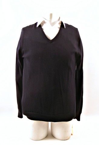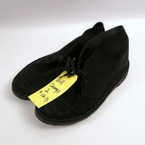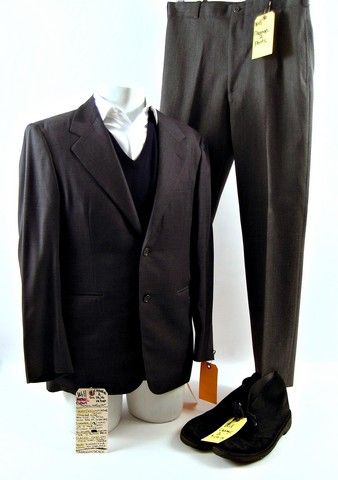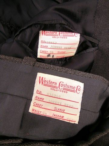 Will Caster (Johnny Depp) screen worn, hero, charcoal grey two button single breasted notch lapel 'Western Costume Company' custom made jacket, (Western Costume Company label inside with Mr. Depp's name on stitched) navy blue long sleeve v-neck 'J. Crew' wool sweater, (size M) white textured cotton long sleeve with attached collar 'John Varvatos' dress shirt, (size 15 32/33) grey fleck wool flat front with belt loops with light creases 'Western Costume Company' custom made pants, (Western Costume Company label inside with Mr. Depp's name on stitched) and black suede ankle lace ups with black rubber sole 'Clarks Desert Boot' shoes. (size 10) Includes wardrobe tags!