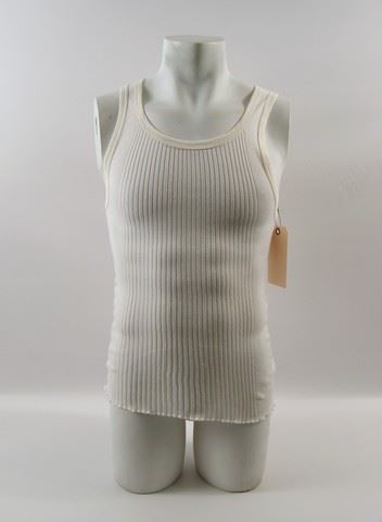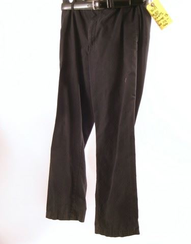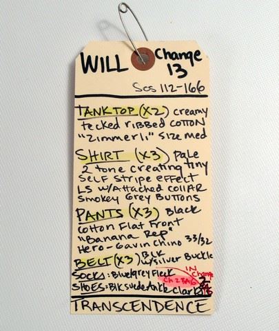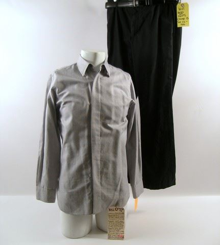 Will Caster (Johnny Depp) screen worn, hero, pale grey two tone grey tiny self stripe long sleeve button front shirt, creamy tecked ribbed cotton 'Zimmerli' tank top, black smooth leather 'Bloomingdales' belt, and black cotton flat front zip front 'Banana Republic' pants. Includes wardrobe tag!