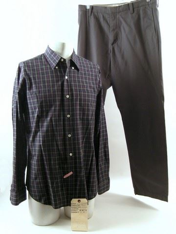Joseph Tagger (Morgan Freeman) screen worn, hero, navy and green with red and white pinstripes plaid long sleeve button front 'Ralph Lauren' shirt, (size XL) and grey flat front 'Banana Republic' pants. Includes wardrobe tag!