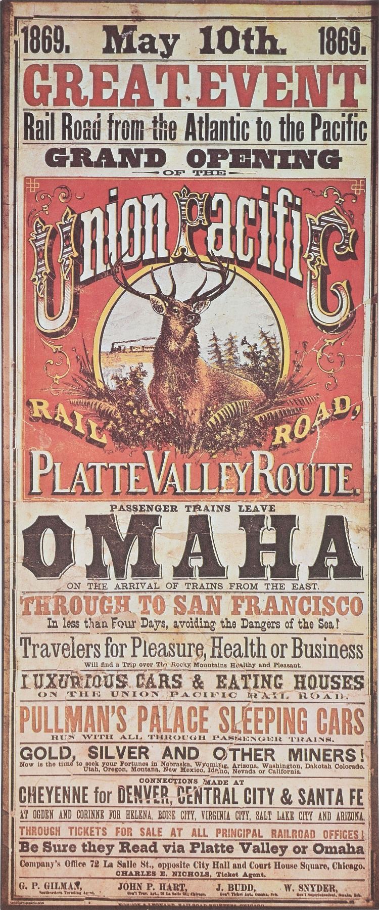 Four rare and important items relating to the early days of the transcontinental railroad. The earliest is a handsomely engraved invitation from the Union Pacific Railway Company Eastern Division for the opening of the "First Section of Forty Miles of their Road West from the Missouri River," 8.25 x 5.75, with reverse annotated by Eugene Field II, who states that the "invitation card, came from the library of my father." Second is a scarce 244-page edition of the Great Trans-Continental Railroad Guide, softcover, published by Chicago's Crofutt & Eaton in 1870, featuring descriptions of 500 cities, towns, villages, stations, government forts and camps, as well as "where to look for and hunt the Buffalo, Antelope, Deer and other game." Removed from the book is its detailed, highly displayable dual-sided timetable chart for December 5-6, 1869, measuring 6.5 x 24.75 unfolded, showing towns, stations, and times for the Union Pacific Rail Road and the Central Pacific Rail Road. Last is a gorgeous and very rare lithographed German map displaying the entirety of the "Pacific Railway," printed by Eduard Heinrich Mayer in 1870, and neatly cloth-matted and framed to an overall size of 33.5 x 12.5. In overall very good to fine condition, with heavy wear to the guide booklet, with back cover no longer present. Accompanied by a color reproduction poster announcing the opening of the Union Pacific Rail Road.