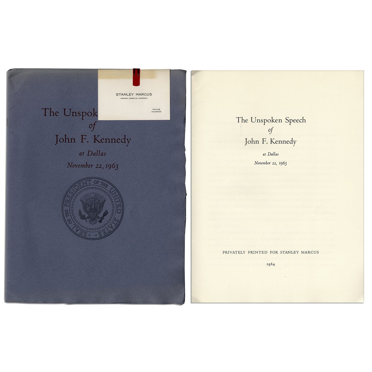 Booklet entitled, ''The Unspoken Words of John F. Kennedy at Dallas November 22, 1963'', privately printed for Stanley Marcus in El Paso, Texas in 1964. Kennedy was slated to give the speech at his Texas Welcome Dinner, but was assassinated earlier that day. Accompanied by the business card for Stanley Marcus of Neiman-Marcus. Bound in blue paper covers with crimson lettering. Eight page booklet measures 8.5'' x 11.25''. Creasing and staining to cover, else near fine. With an LOA from Justice Arthur J. Goldberg, whom Kennedy appointed to the Supreme Court.