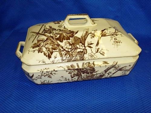 Transferware Covered Casserole, patented Feb. 12/1884, measures 9 1/2" x 7"