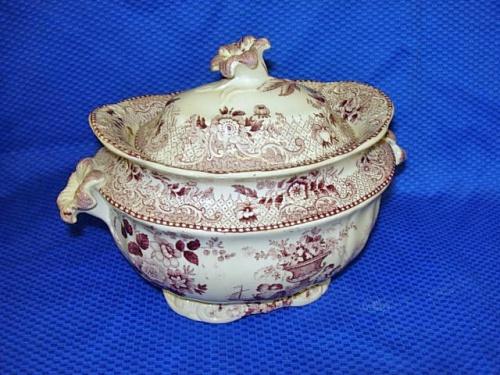 Transferware Covered Sauce Dish, measures 8" l., 6" h. *note flaking on the underside of lid
