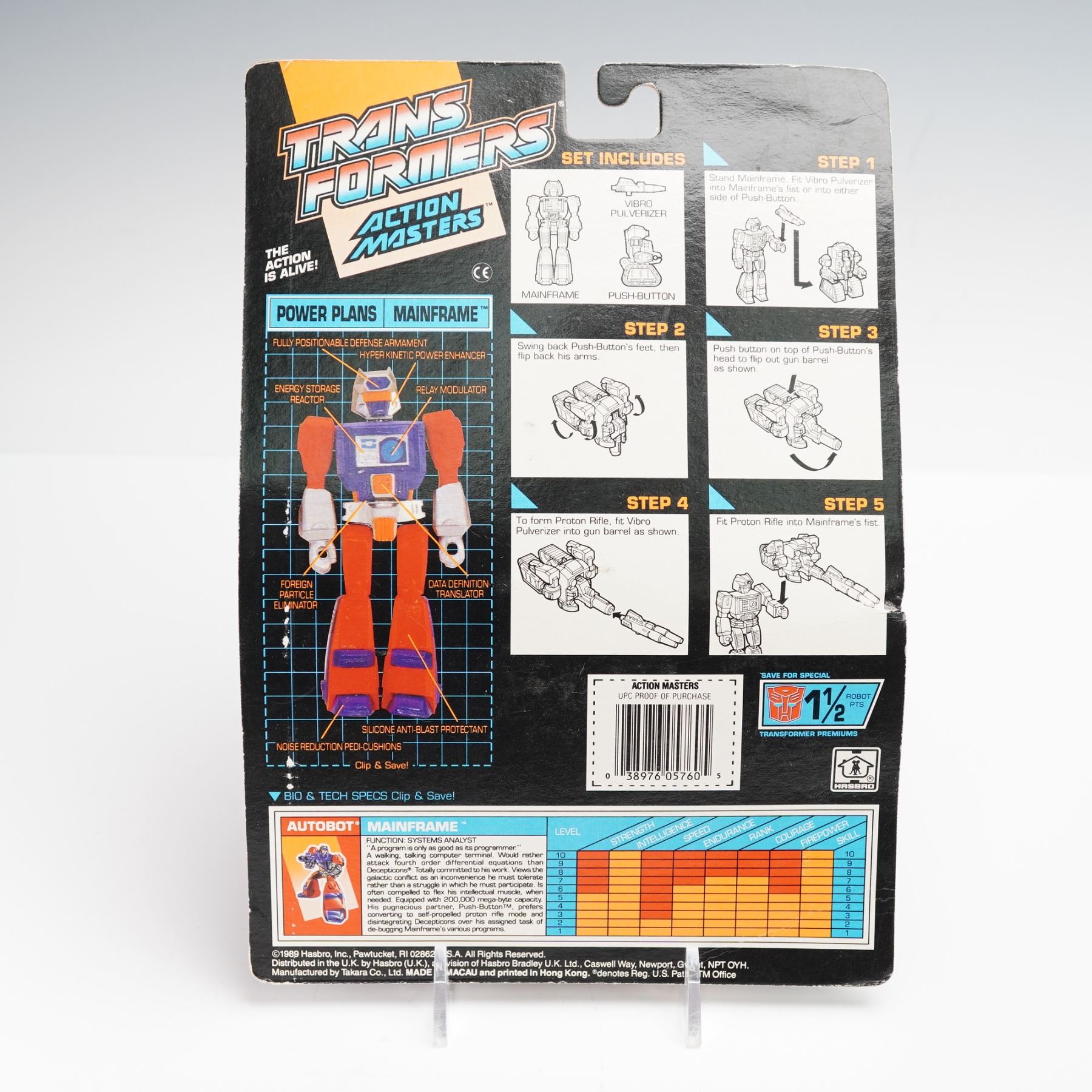 A 1990 Transformers Action Masters release by Hasbro and Takara featuring Mainframe paired with his transforming companion Push-Button. The figure remains sealed in original factory blister packaging, with the card back displaying assembly instructions, Power Plans diagram, and character bio. This Generation 1-era collectible represents the late Action Masters line, noted for its non-transforming Autobots paired with mechanical partners that convert into weapons.