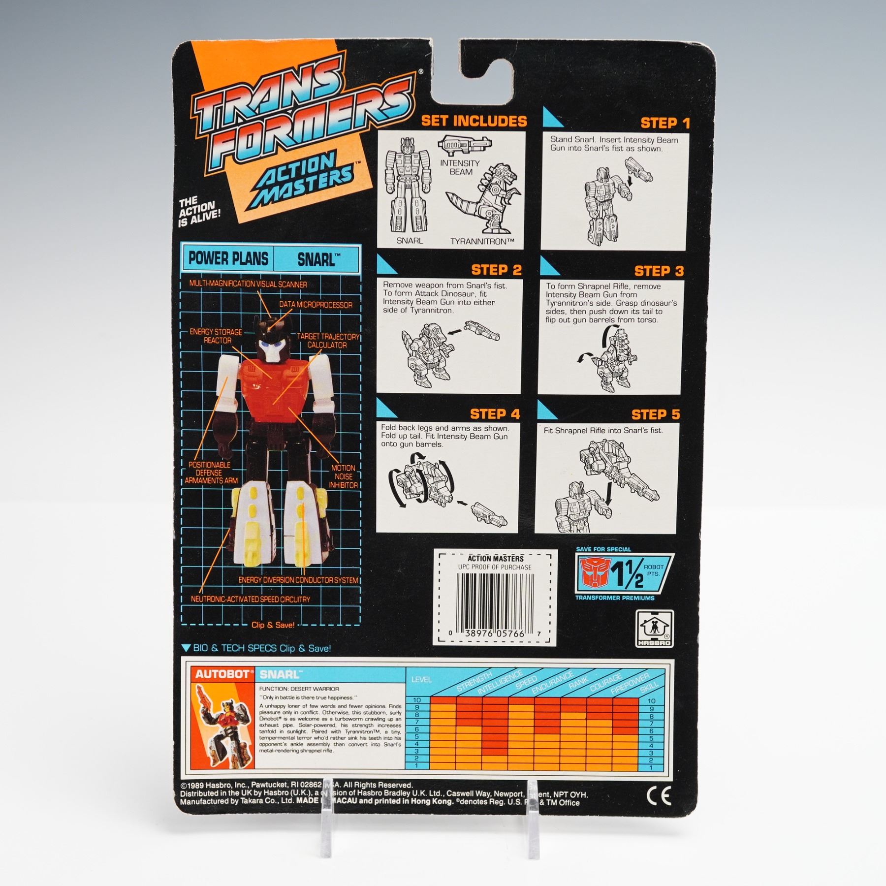 Produced in 1990 by Hasbro and Takara, this Generation 1 Action Masters release features Snarl paired with his transforming companion Tyrannitron. The figure remains sealed in its original blister packaging with accessories intact, and the card back showcases the Power Plans diagram, bio, and assembly instructions. This late-era Transformers collectible represents the final phase of the G1 toy line, where classic characters were reimagined with enhanced articulation and weapon partners.