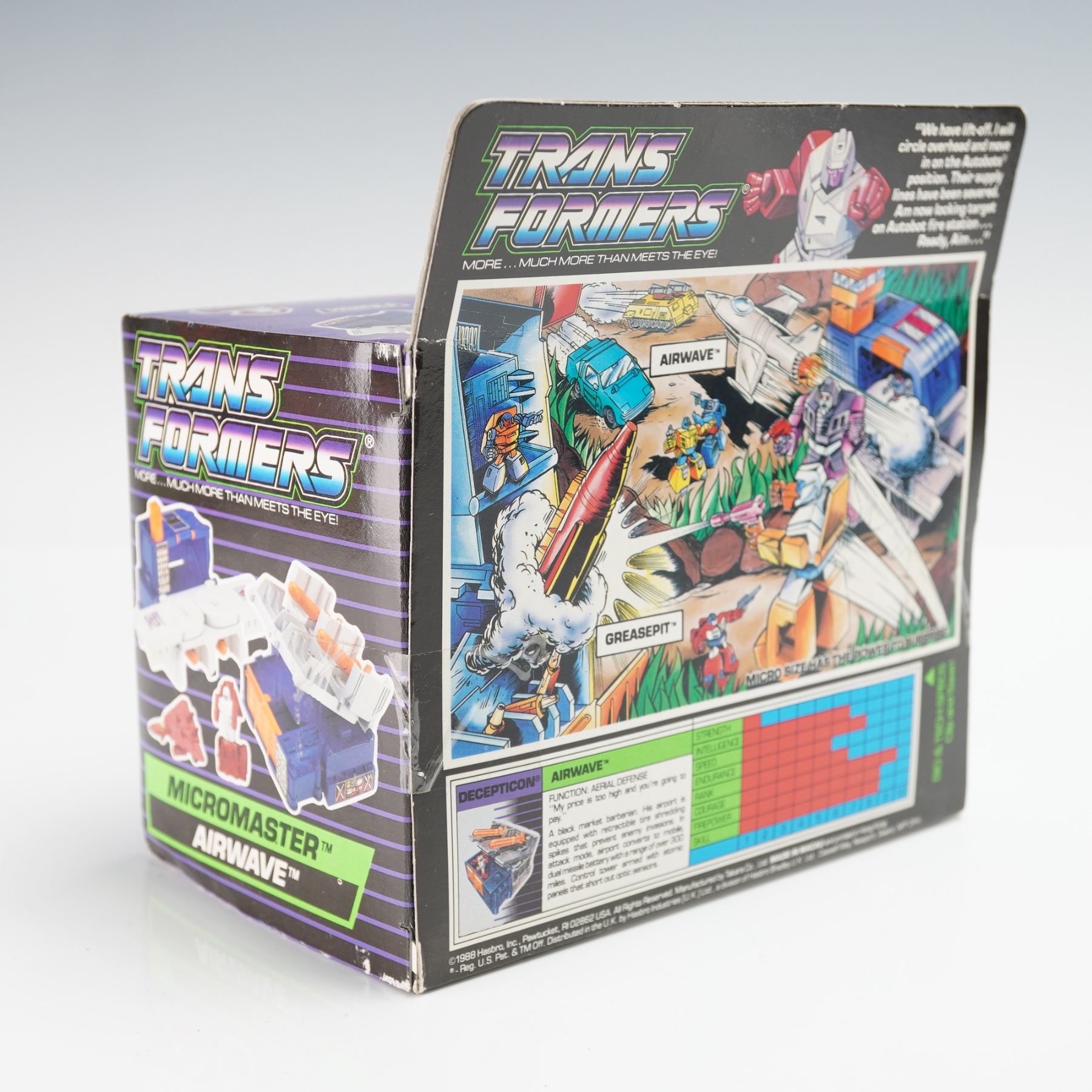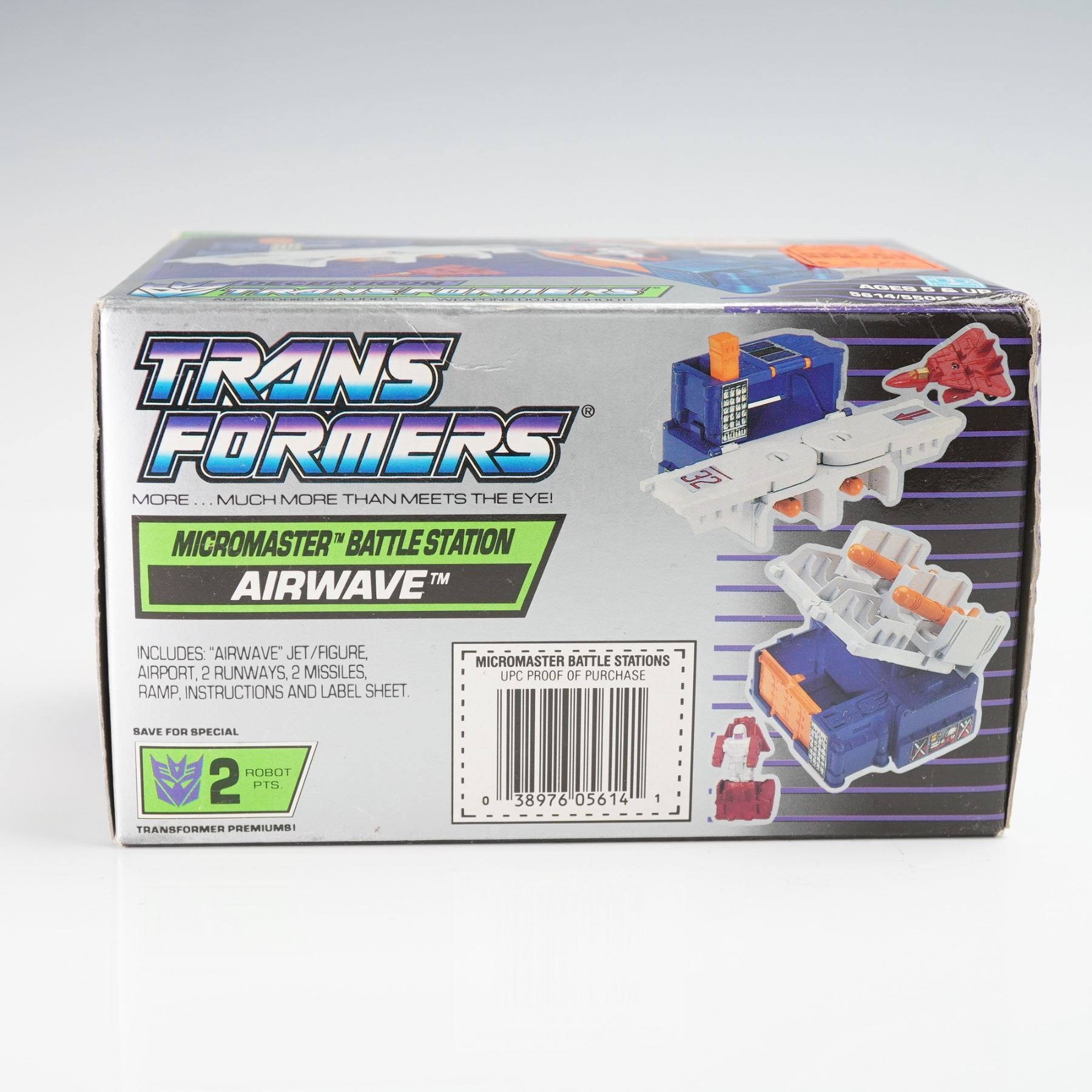 Original Transformers Micromaster Airwave Battle Station, produced by Hasbro, 1988. This boxed set features the Decepticon Airwave jet figure with modular airport components that convert into an aerial battle base. Includes Airwave jet/figure, airport, two runways, ramp, two missiles, instructions, and label sheet as noted on the box. The packaging displays bold 1980s Transformers artwork and includes the Lionel Red Tag Special retail sticker on the front. A collectible example from the classic Micromaster Battle Station series, representing the later era of Generation 1 Transformers.