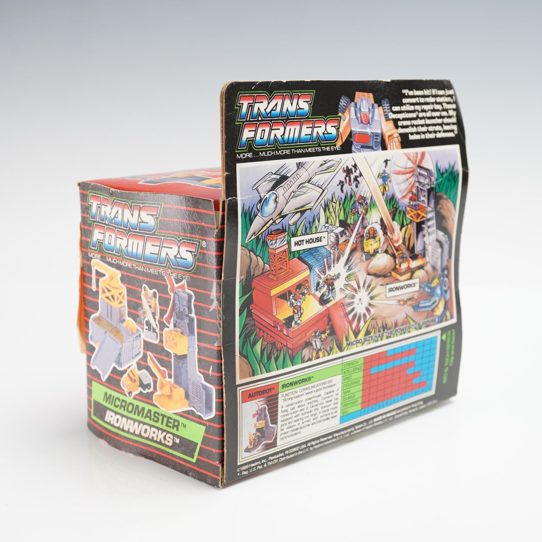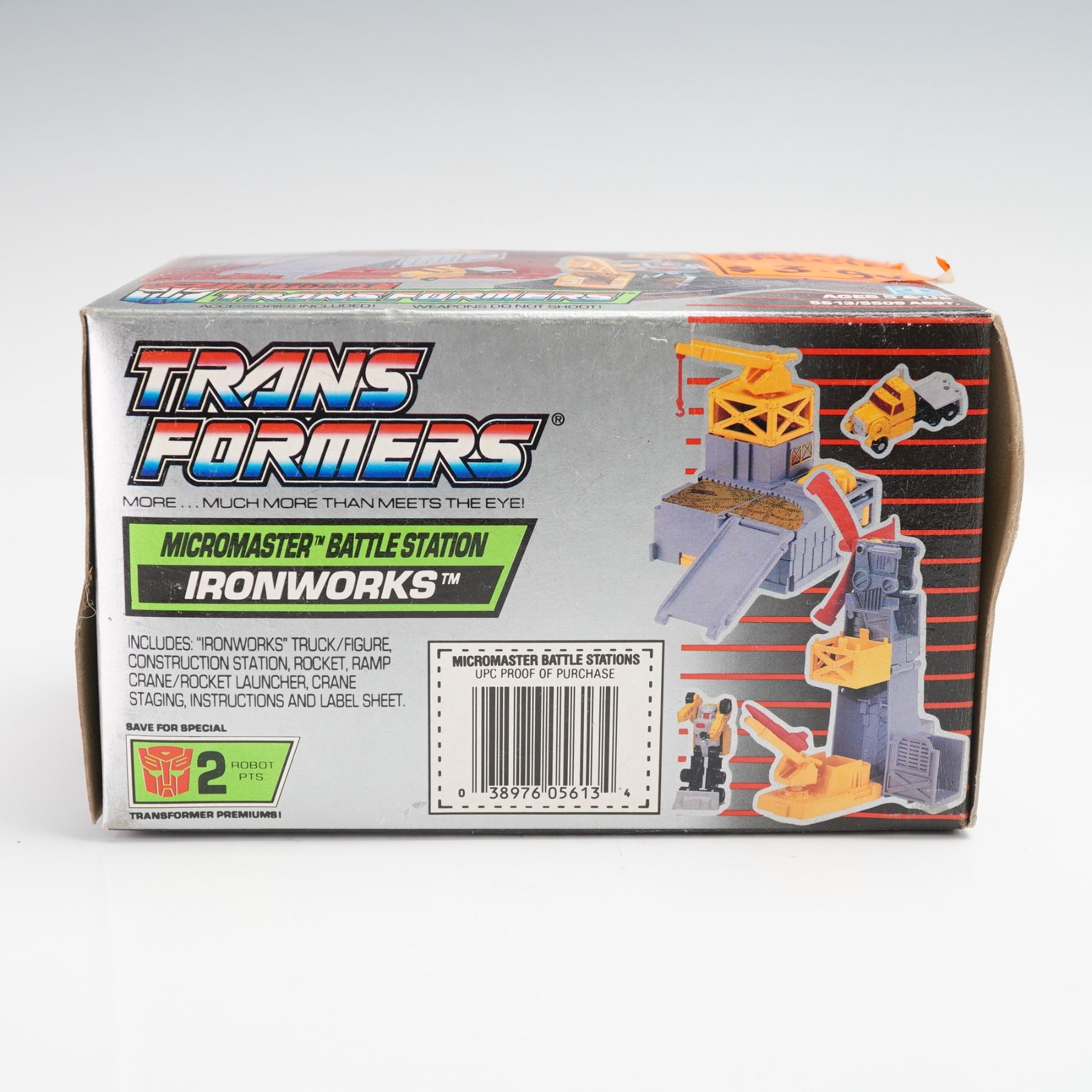 Original Transformers Micromaster Ironworks Battle Station, produced by Hasbro, 1989. This boxed set features the Autobot Ironworks figure with modular construction station components that convert into a rocket launcher battle base. Includes Ironworks truck/figure, crane, ramp, rocket, and accessory parts with original label sheet and instructions as indicated on box. The packaging showcases vivid 1980s Transformers artwork and retains its Lionel Red Tag Special retail sticker. A nostalgic collectible from the classic Transformers Micromaster line.