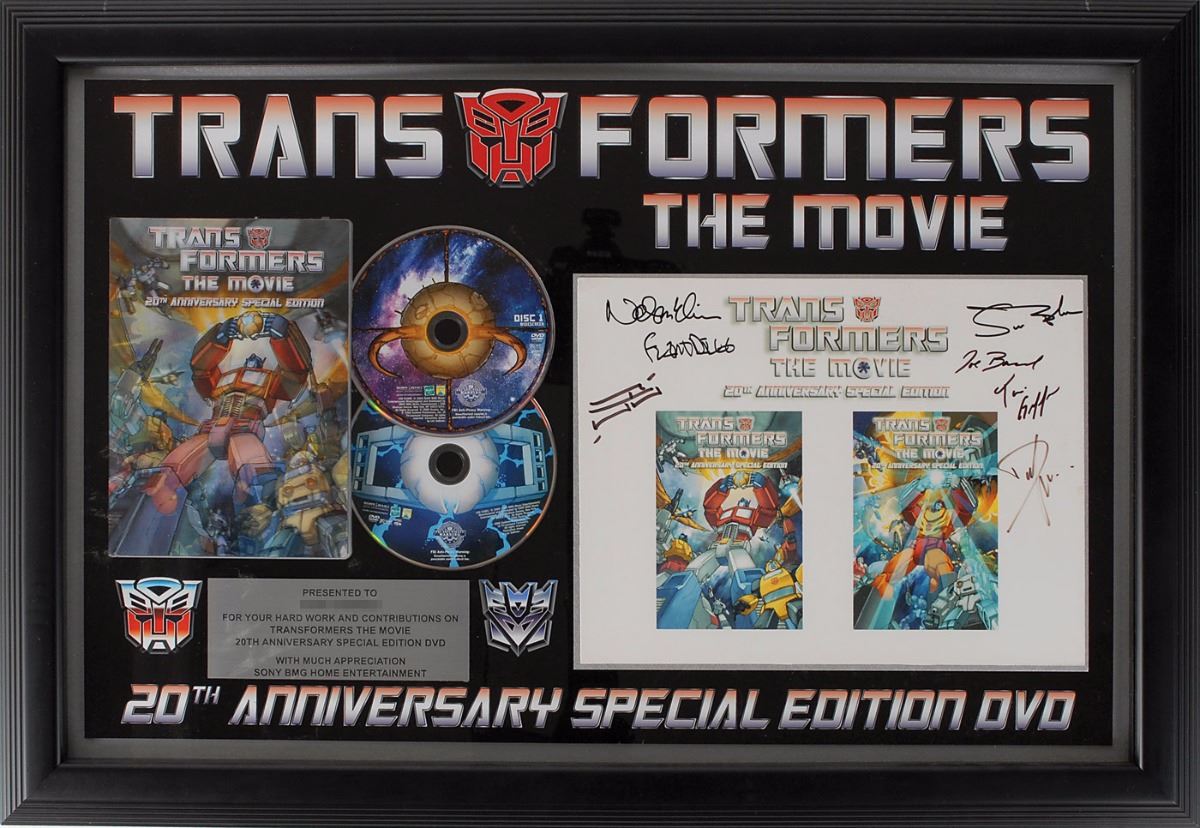 Terrific in-house award presented for “hard work and contributions on Transformers the Movie 20th anniversary special edition DVD, with much appreciation, Sony BMG Home Entertainment.” Framed with the hologram DVD case and its two discs, an engraved plaque, a stylized 20th anniversary background, and a presentation cover sheet signed in black felt tip by several cast members to an overall size of 26.5 x 18.5. Award retains its original backing with an Ill-Eagle Enterprises label. In fine condition.