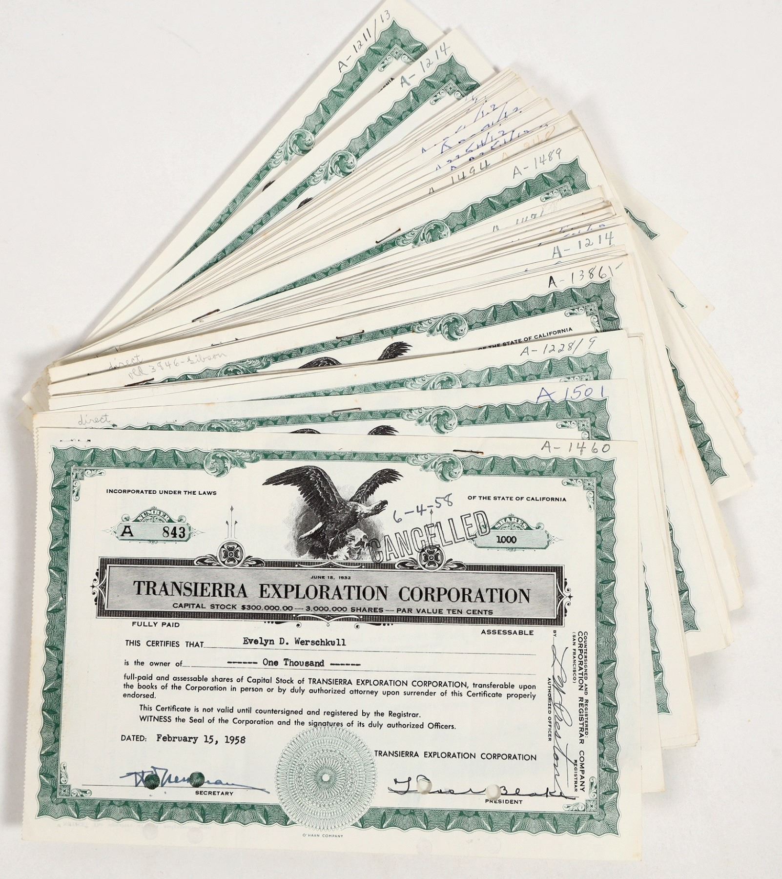 Lot of approx. (100) cancelled/ numbered TRANSIERRA EXPLORATION CORPORATION Stock certificates. Nice embossed seal at bottom, signed and countersigned. Reverse sides fully executed also. A few of these have Documentary stamps affixed to the reverse sides. Good to very good condition, please see photos.
