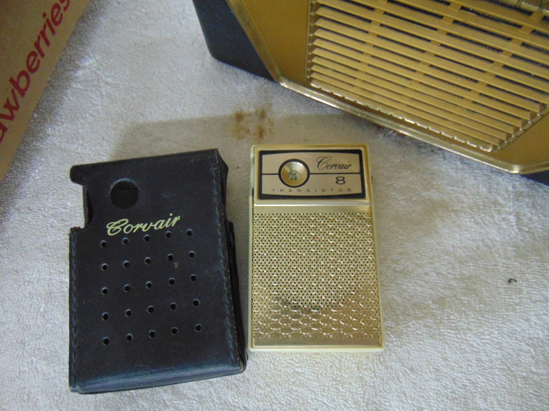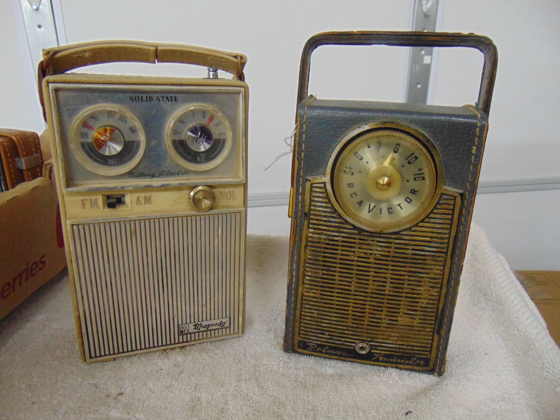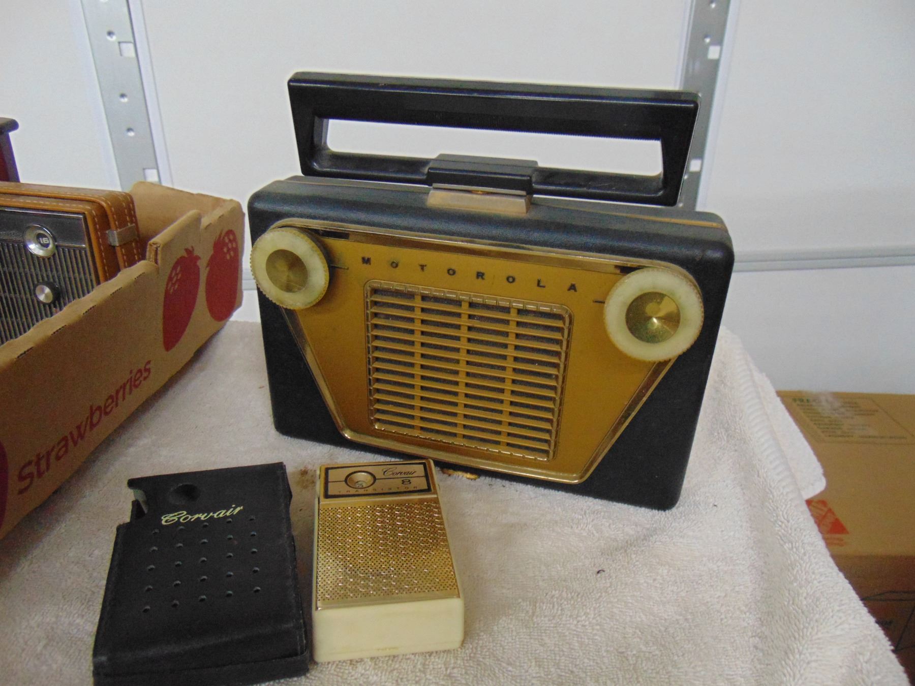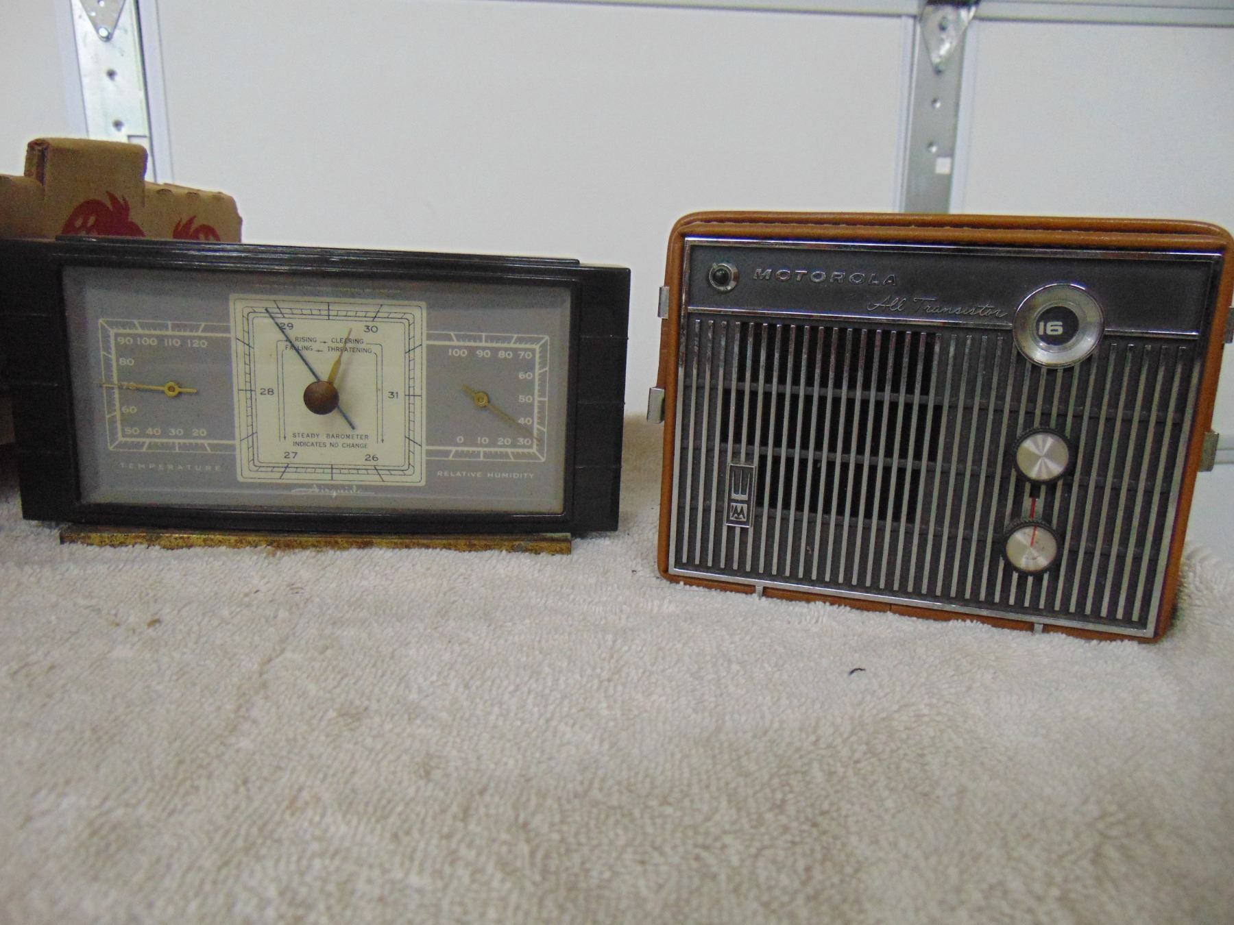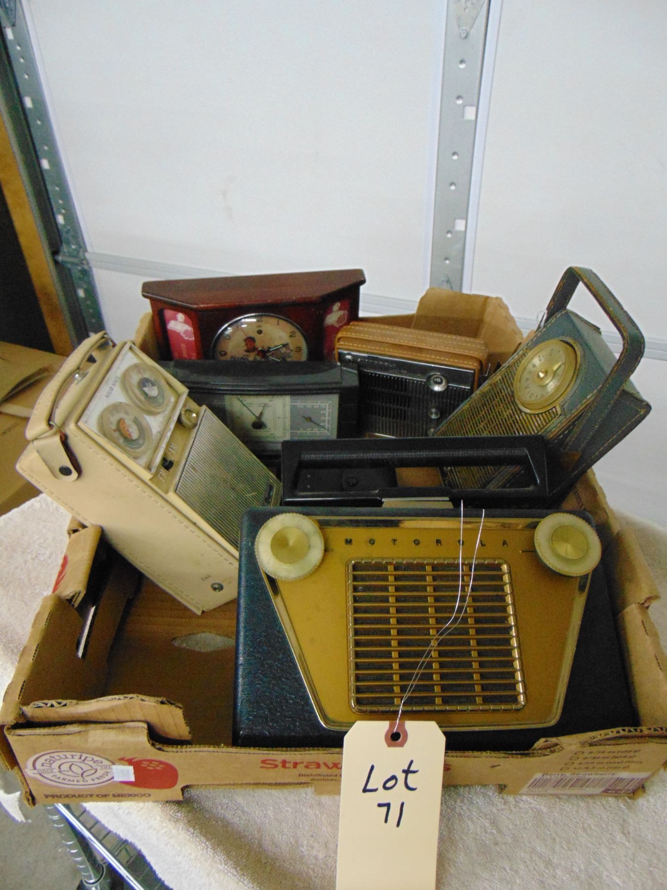Flat of 4 transistor radios; one tube portable; one desk weather station, and one Communist China Mao-tse-tung propaganda clock