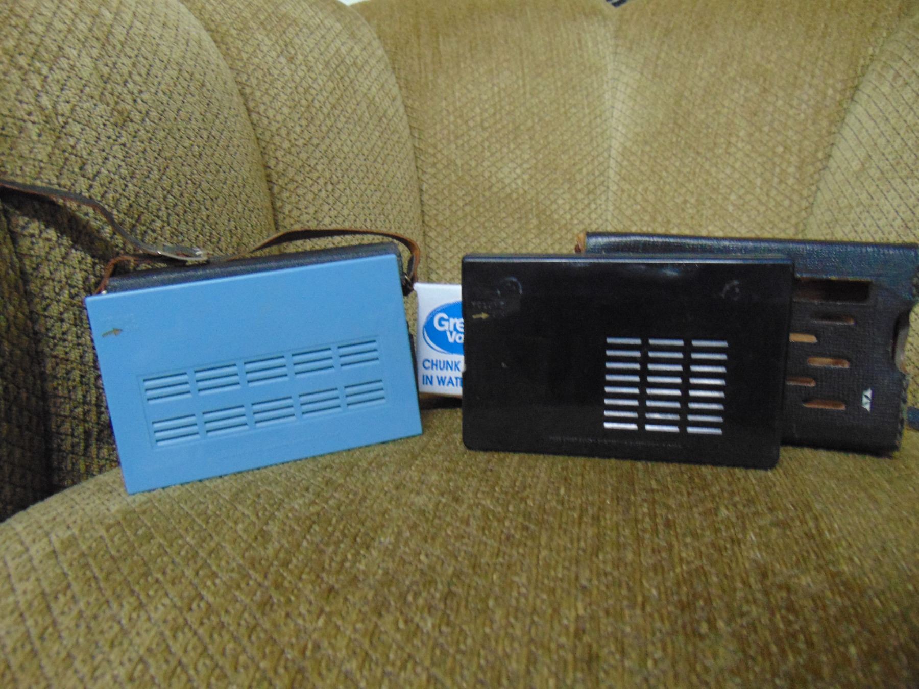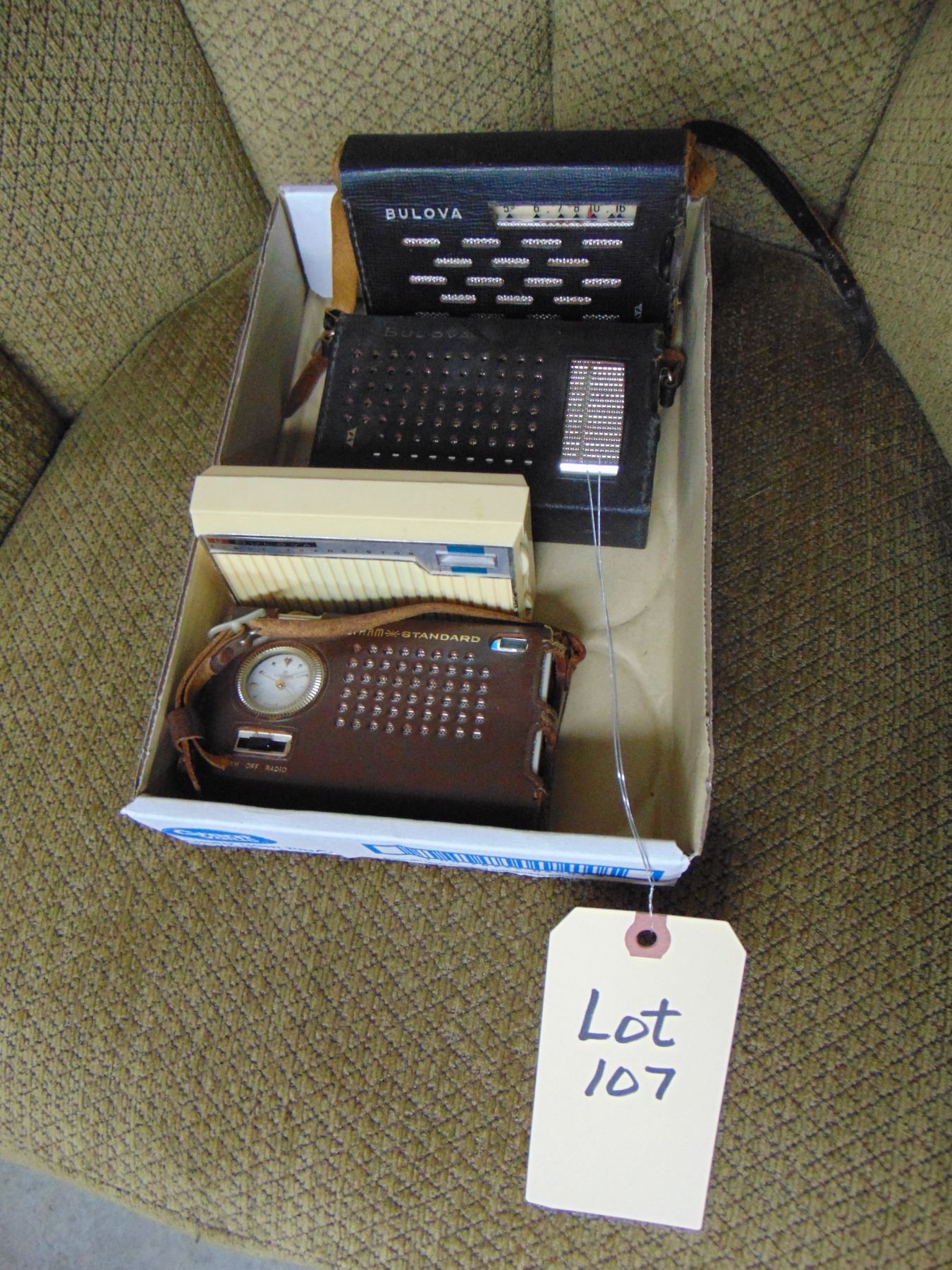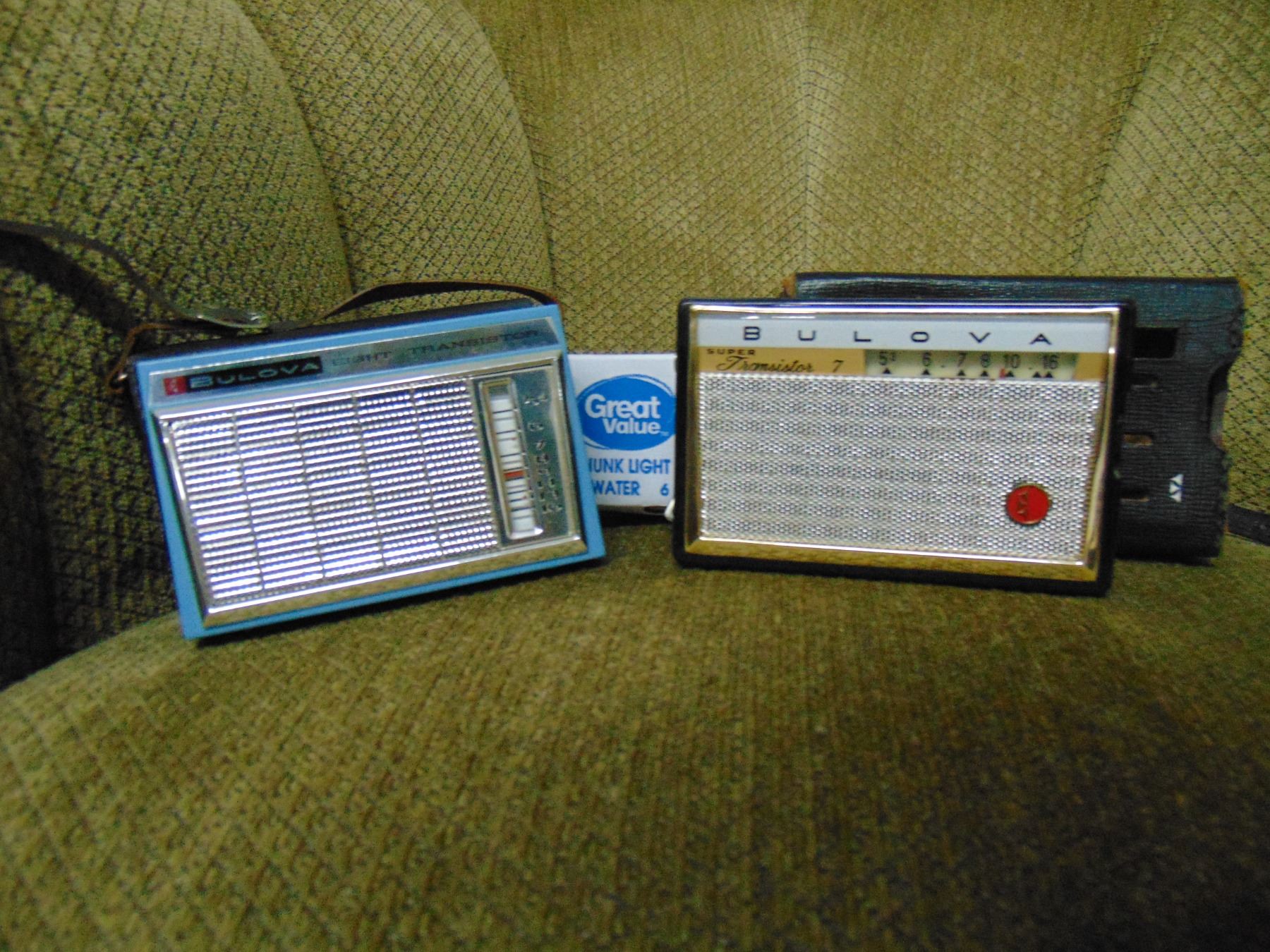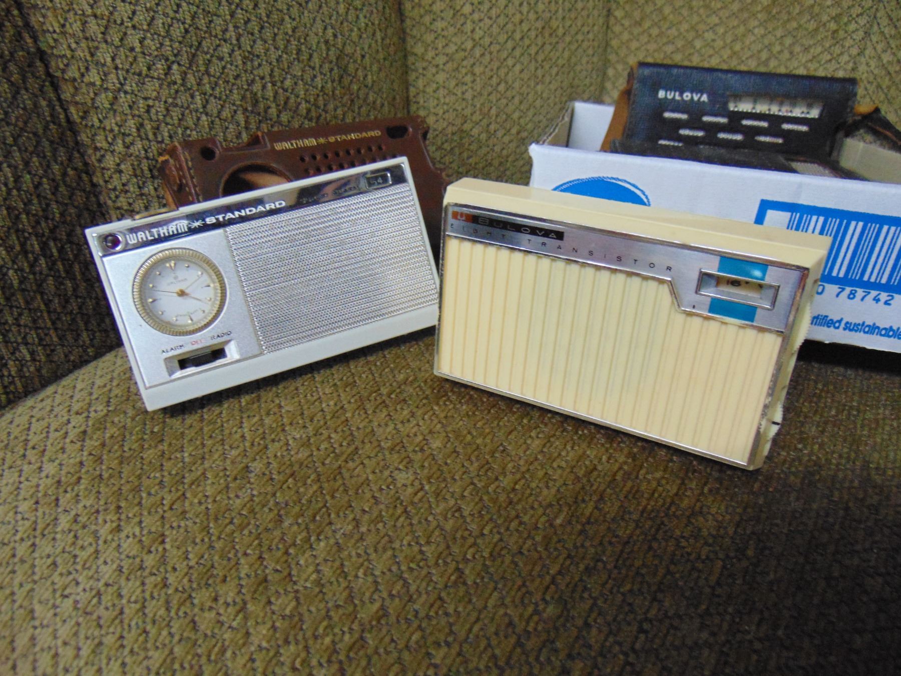 Flat of 4 vintage transistor radios: includes 3 Bulova, 1 Waltham (with miniature clock installed); all very nice