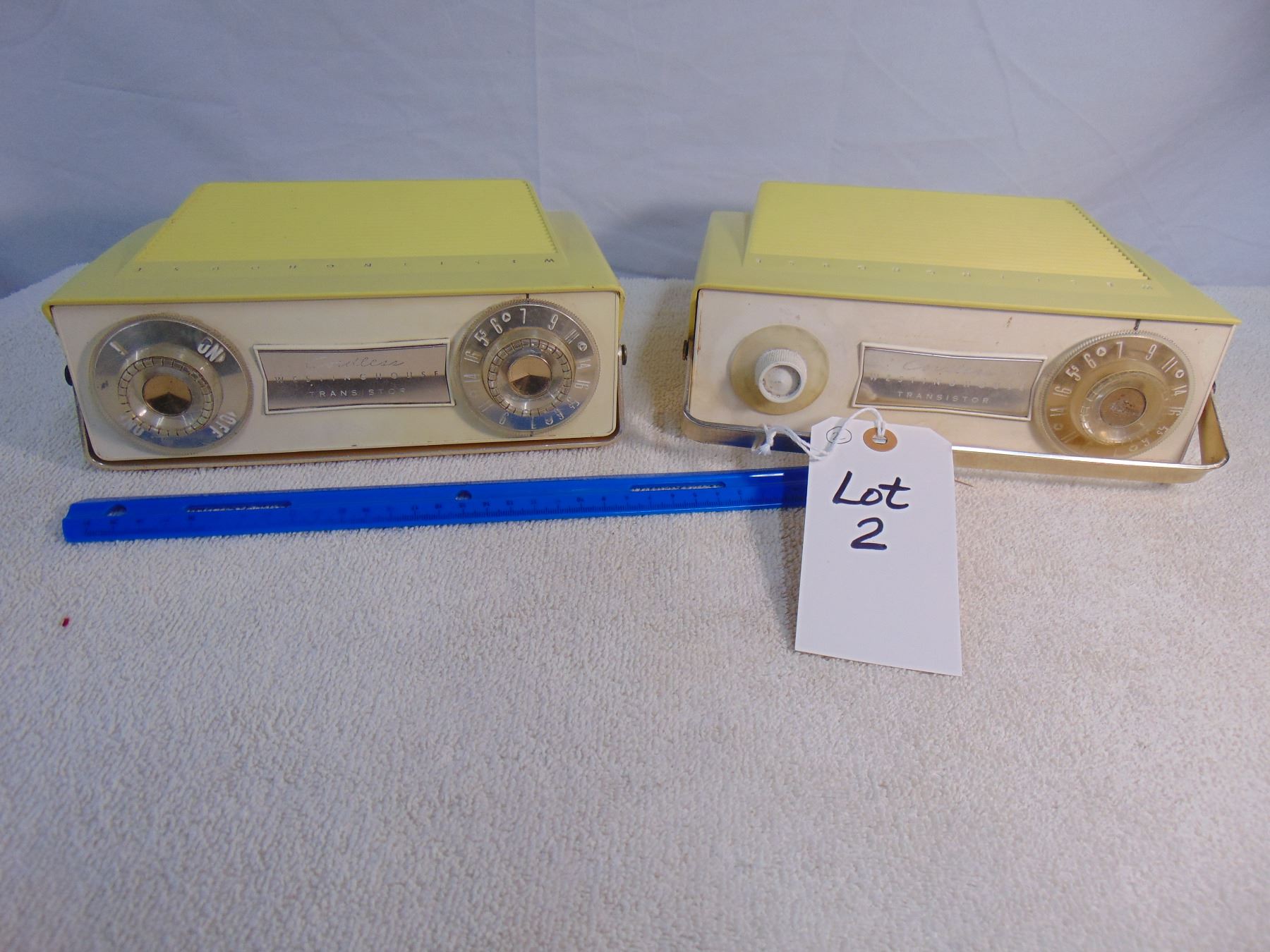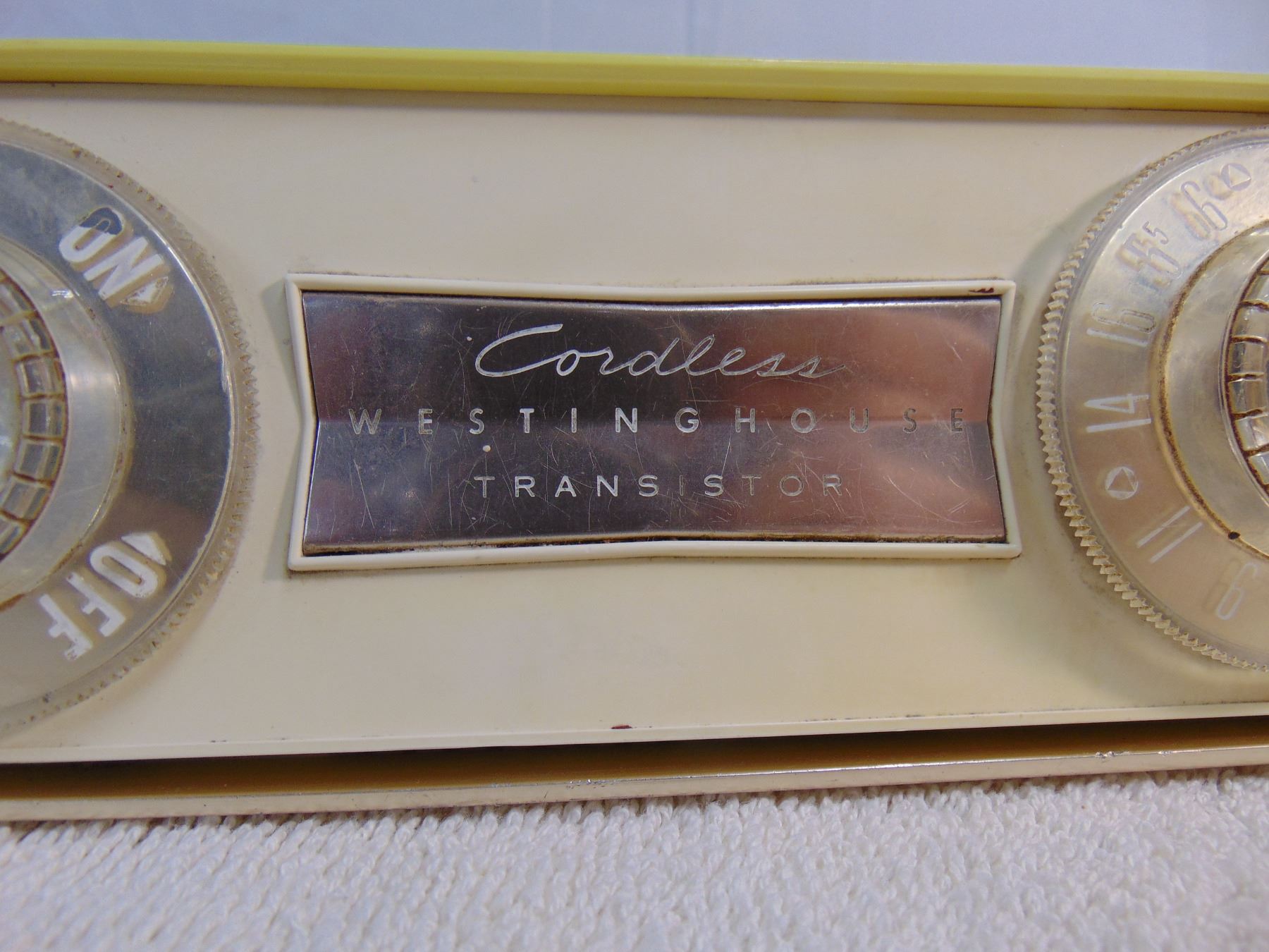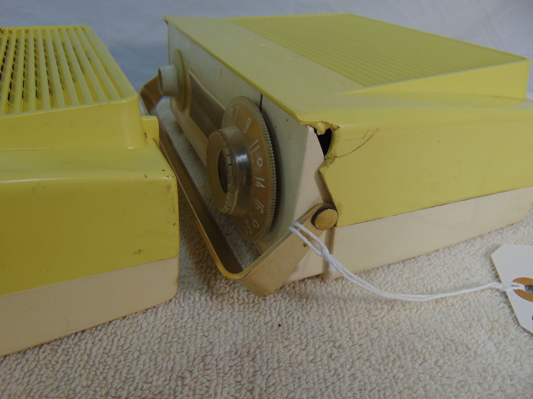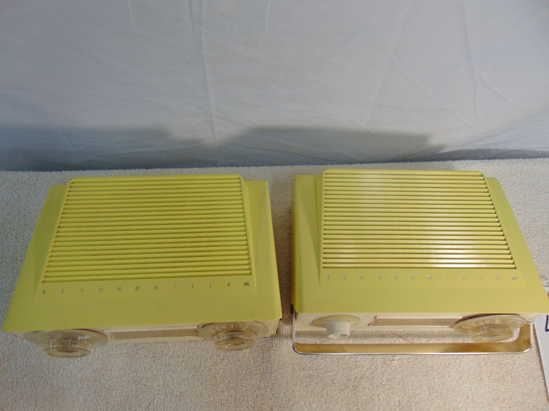 Two Cordless Westinghouse Transistor Radio. Yellow radios with handle. Model H622P6. Some cabinet damage on one radio.