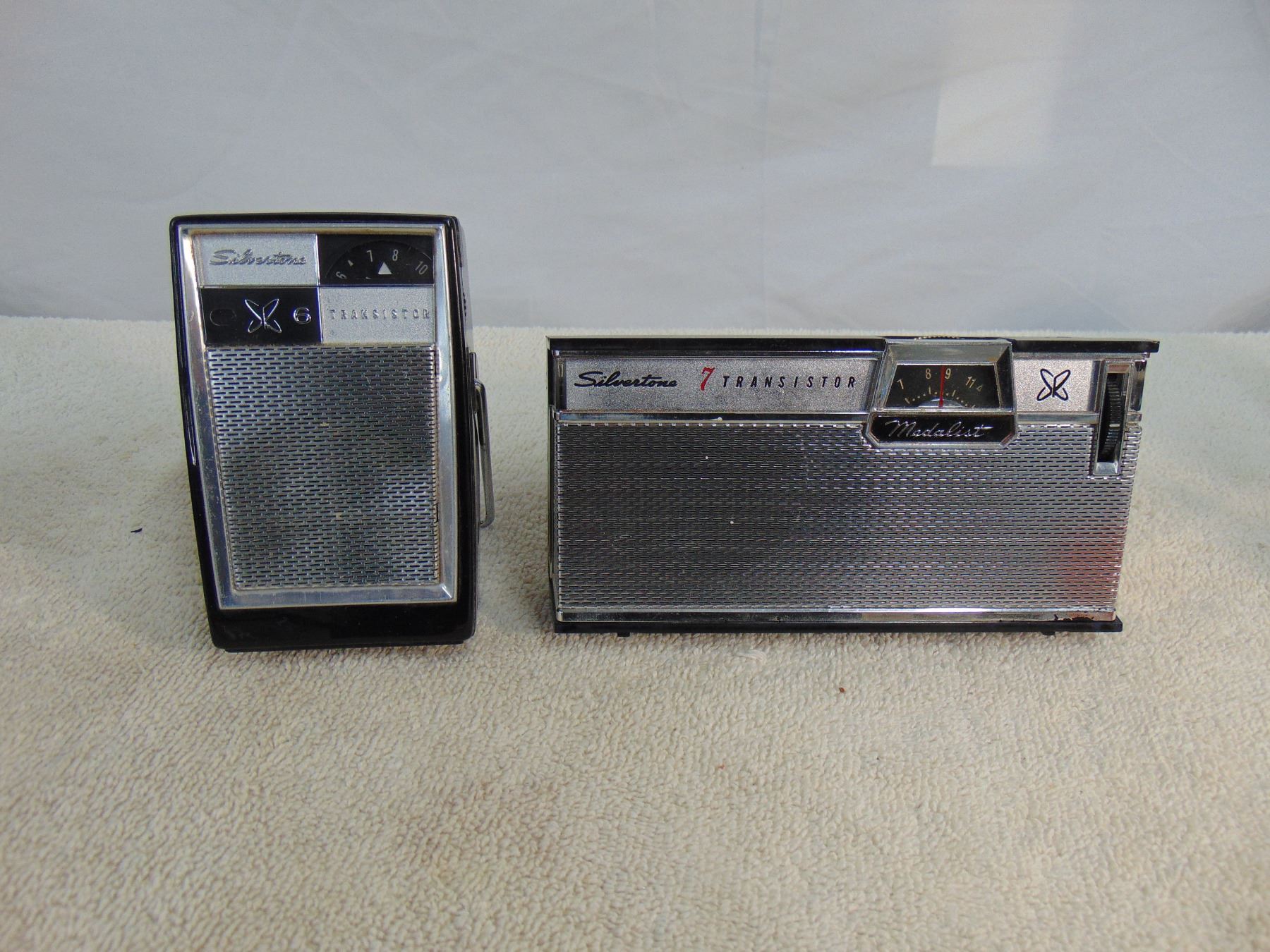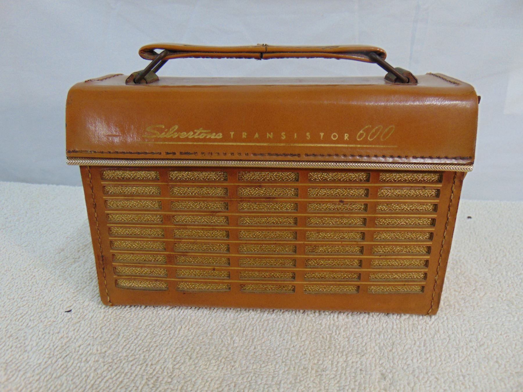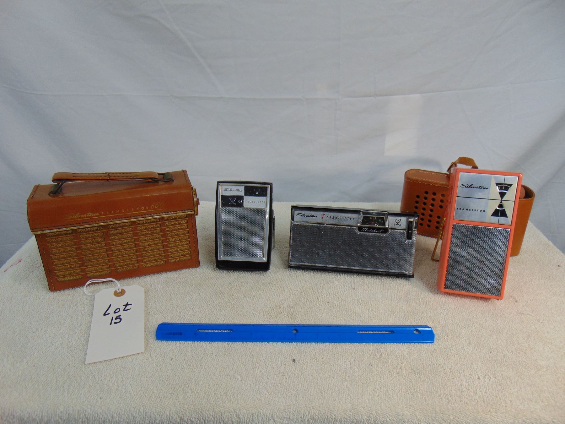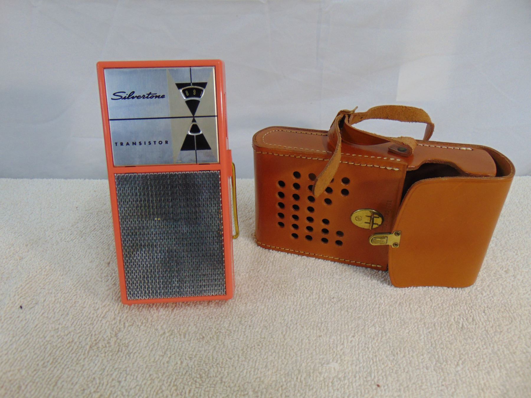 Four Silvertone vintage transistors including the rare salmon color in excellent leather case; very nice condition