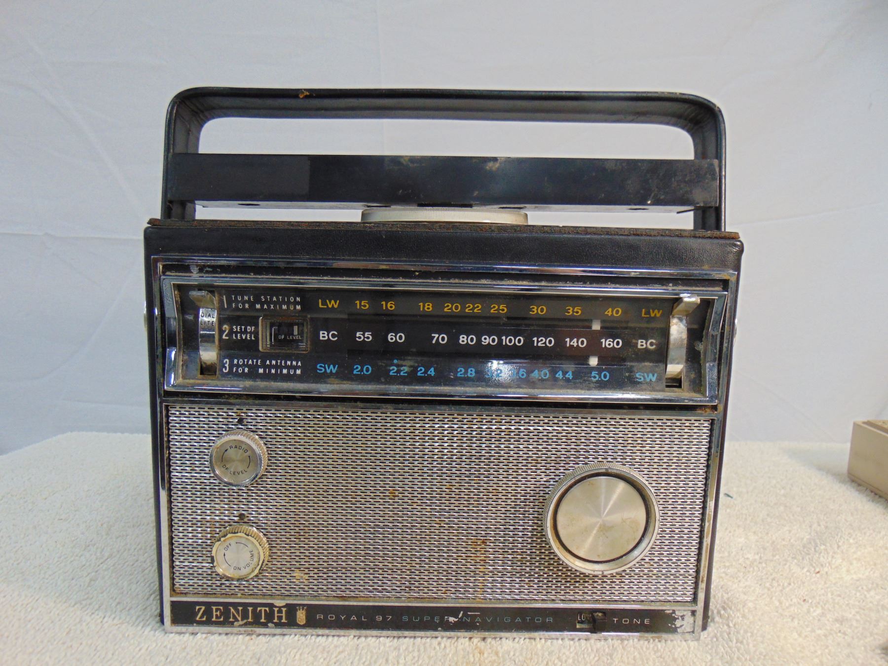 Three items: 1) 2 Sylvania transistors; 2) Zenith "Royal 97 Super Navigator", multi-band