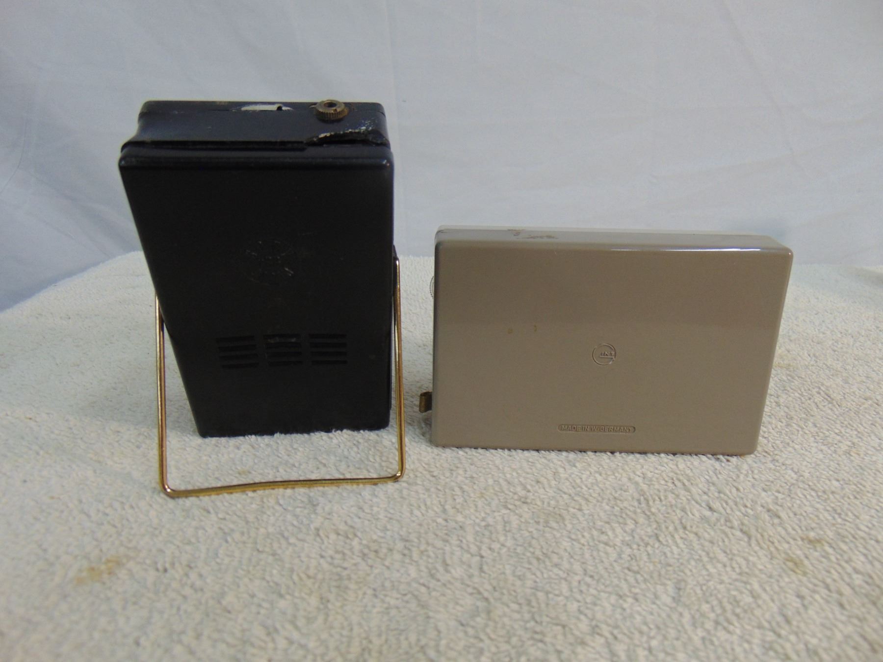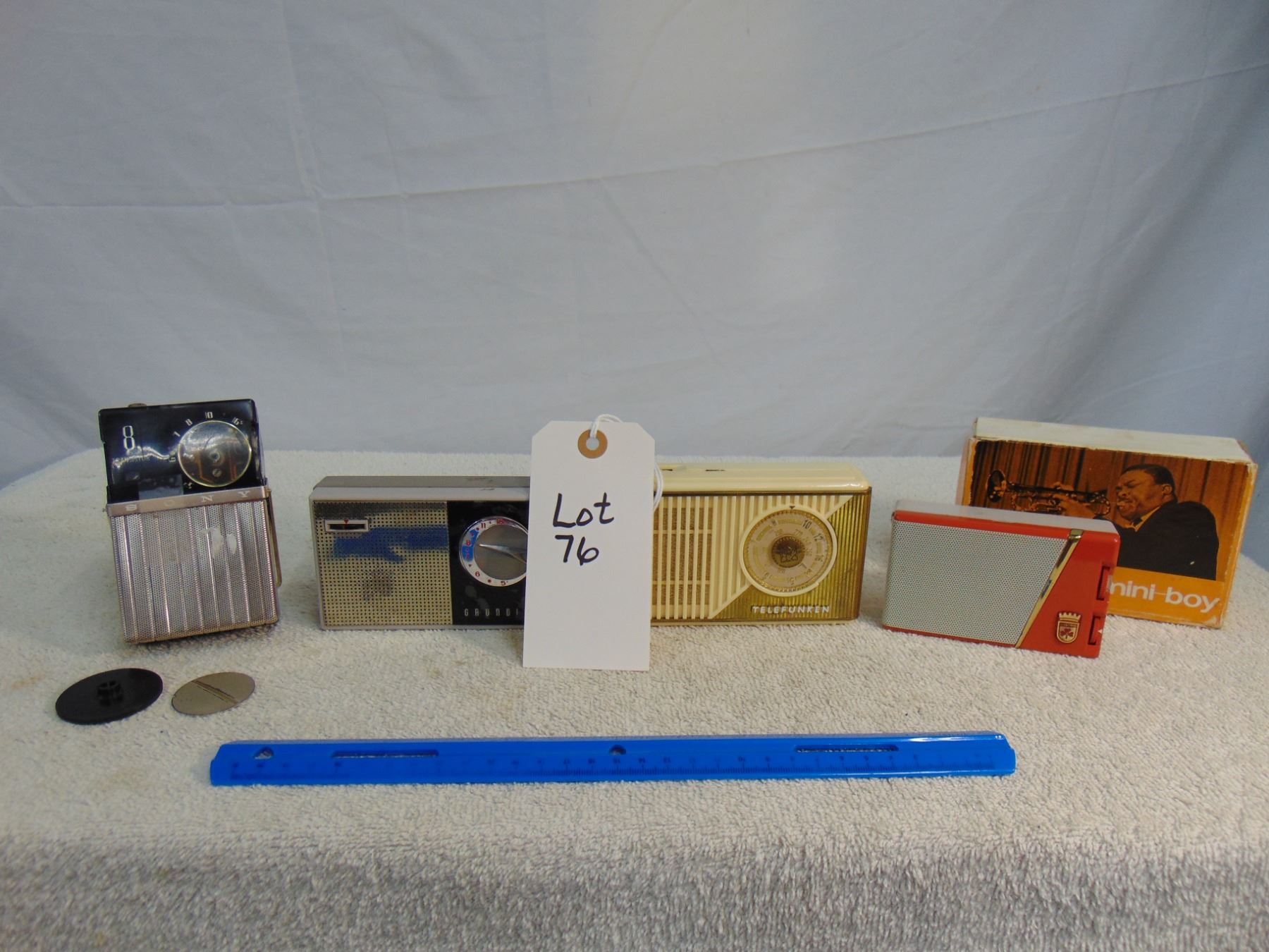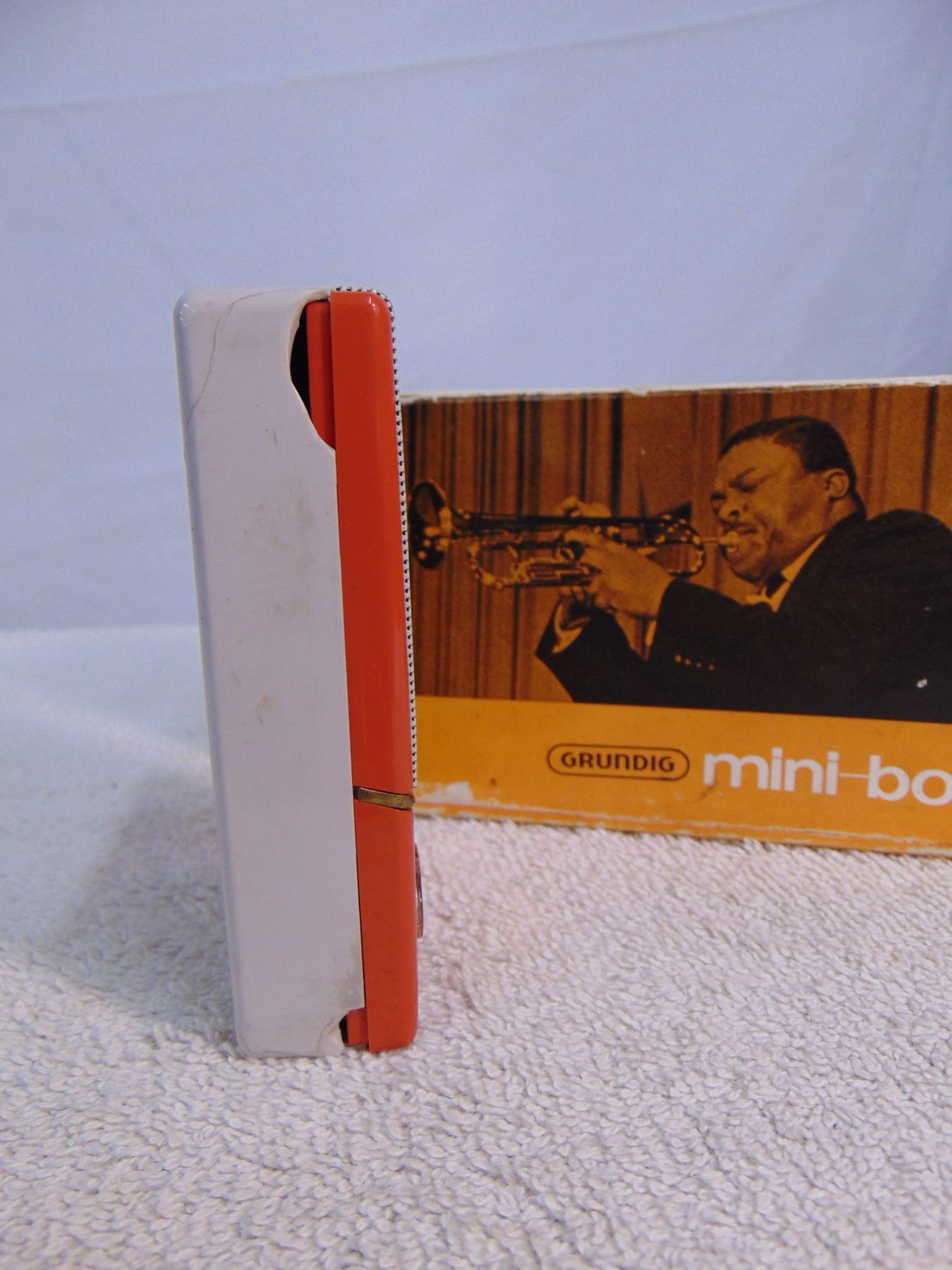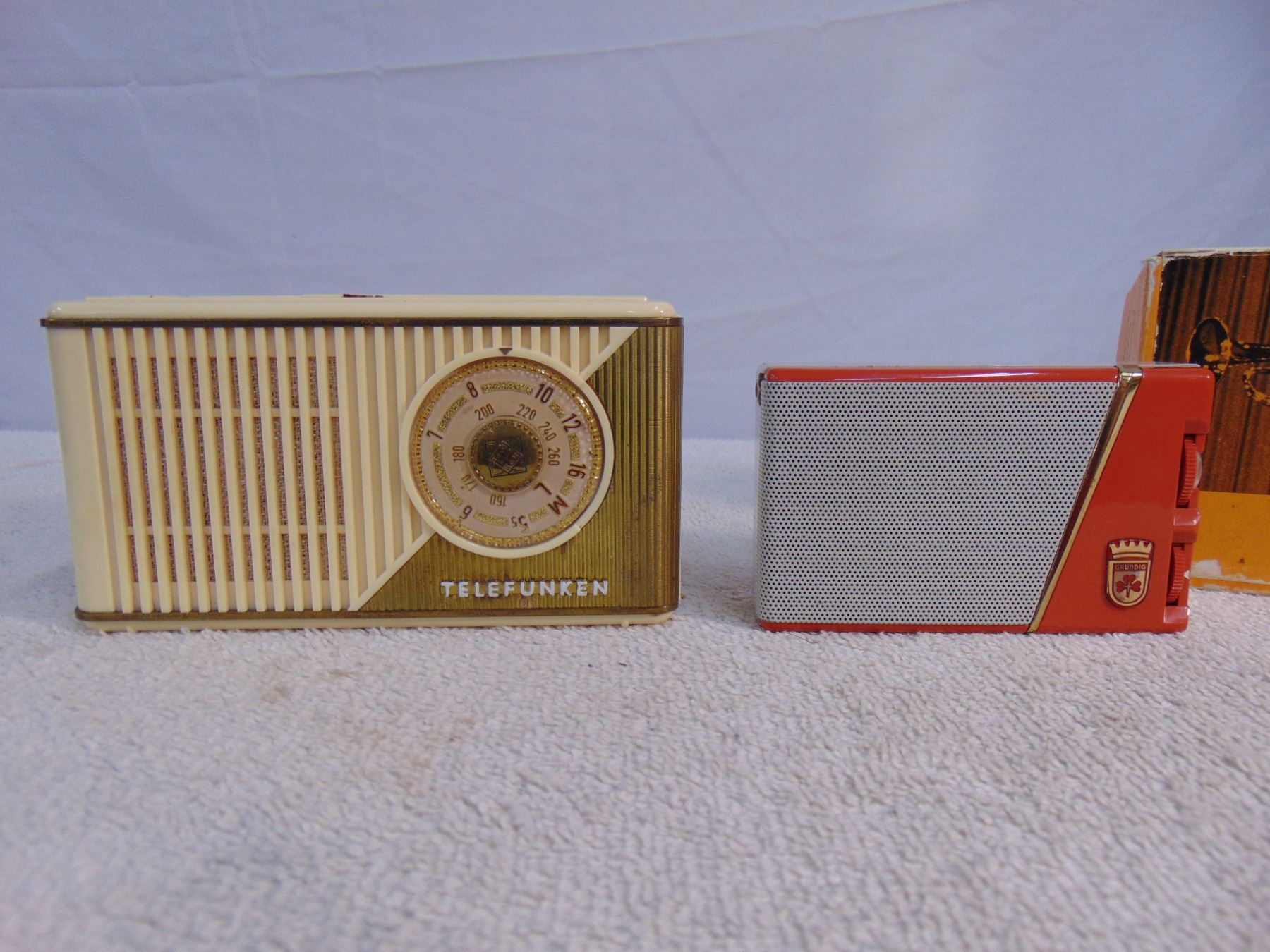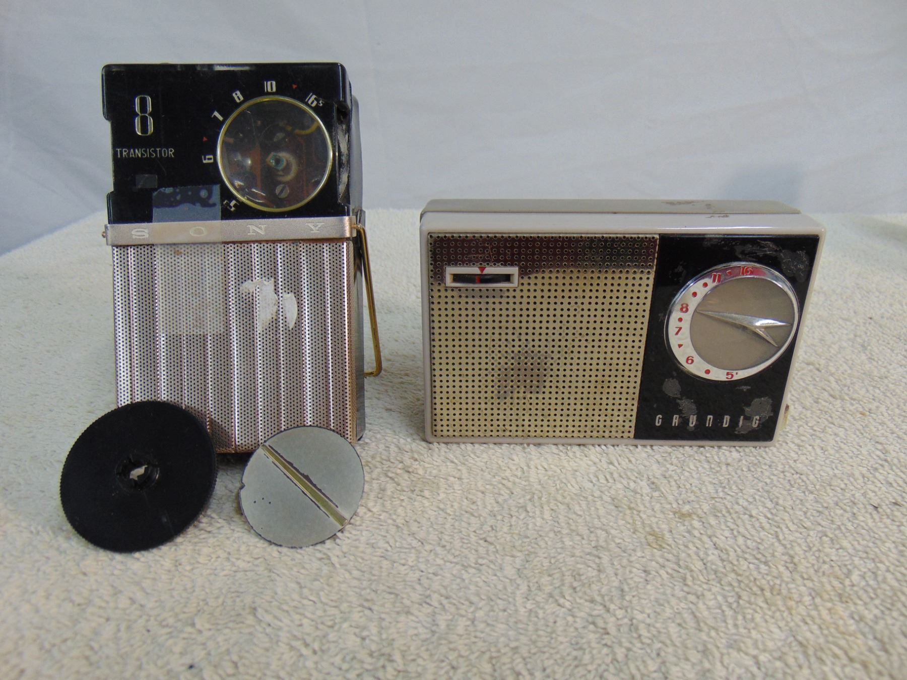 Flat of 4 vintage transistors; includes Sony (some cabinet damage), Telefunken, 2 Grundig ( one red & white in Mini-Boy box, small chip on bottom)