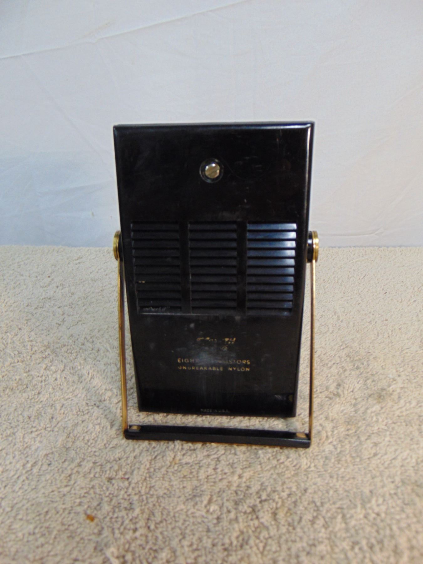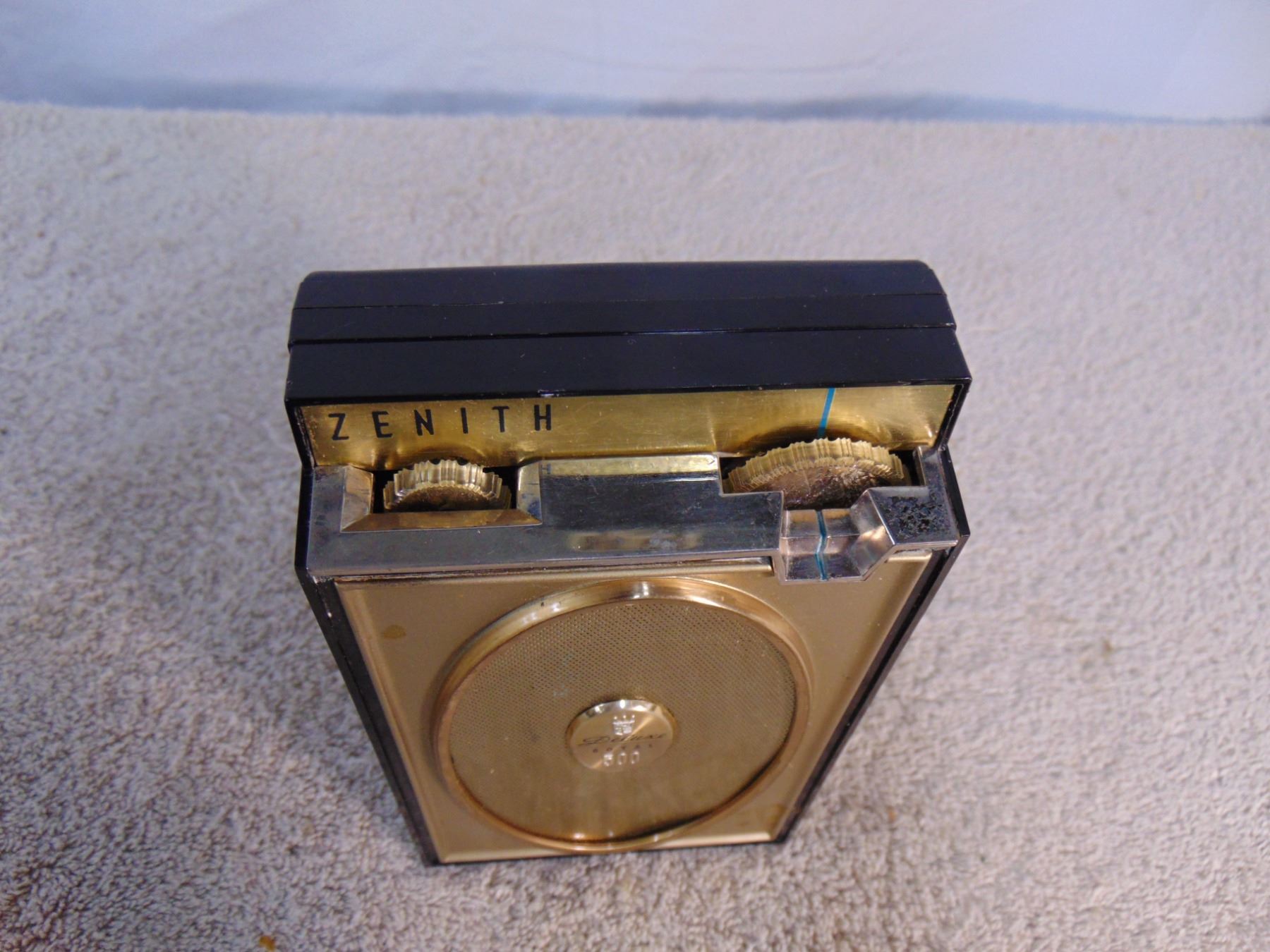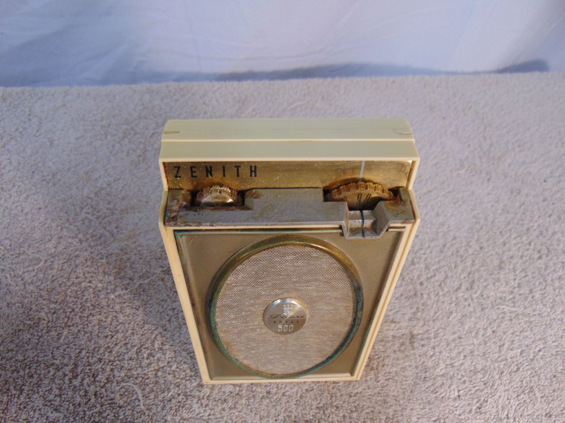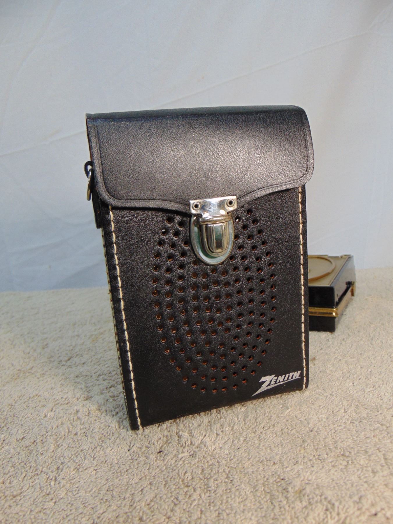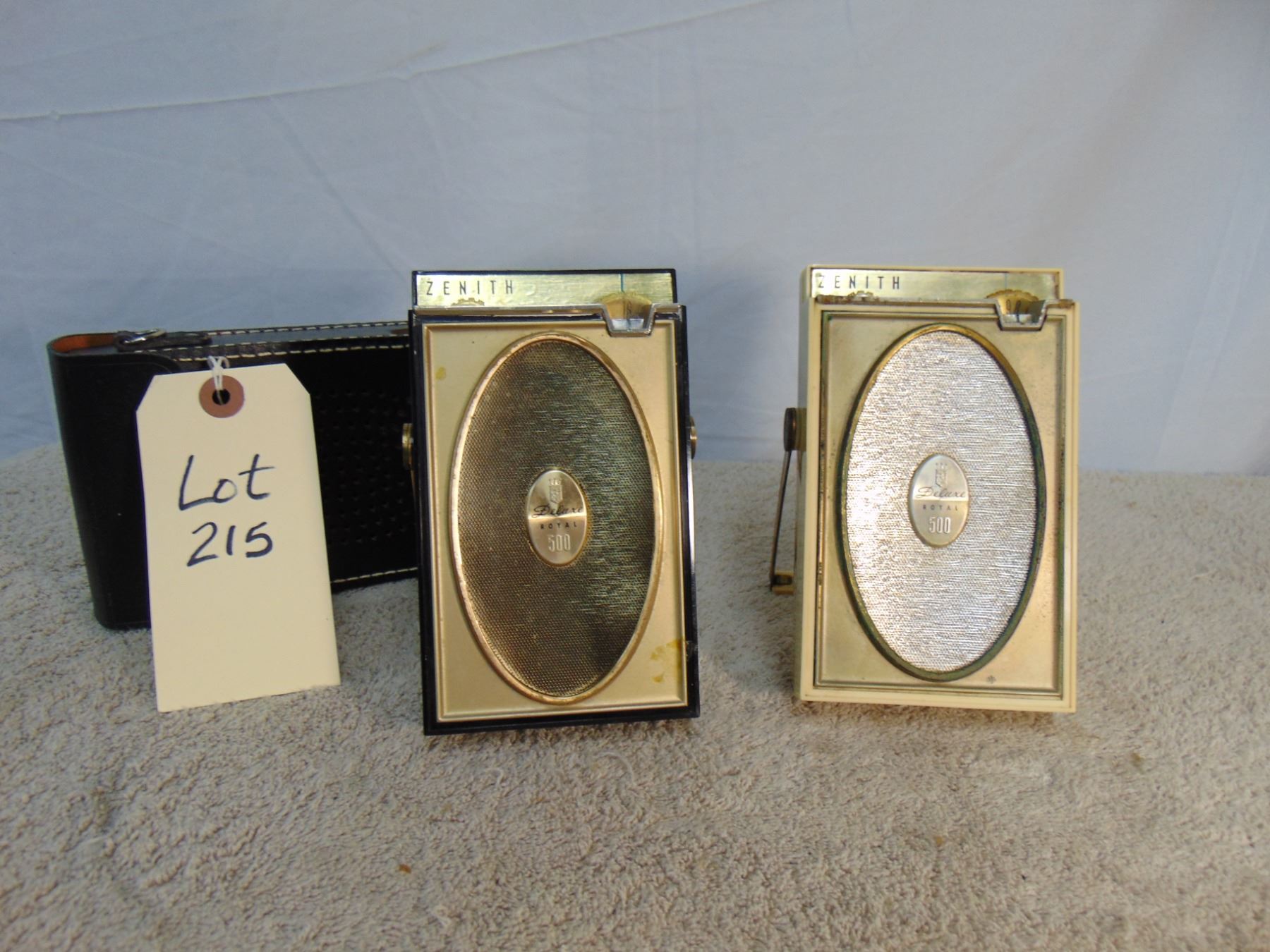 Two early Zenith 500H transistor radios. One white (cream) and the other is black with an excellent split leather carrying case.