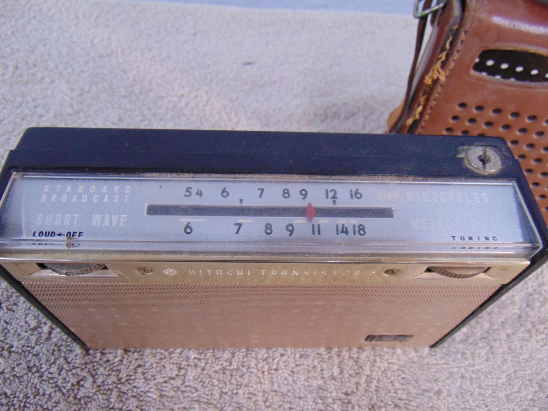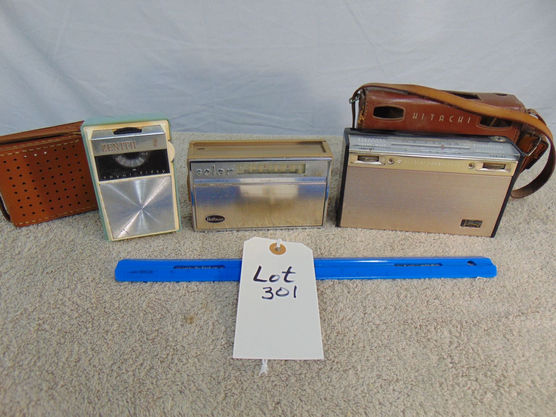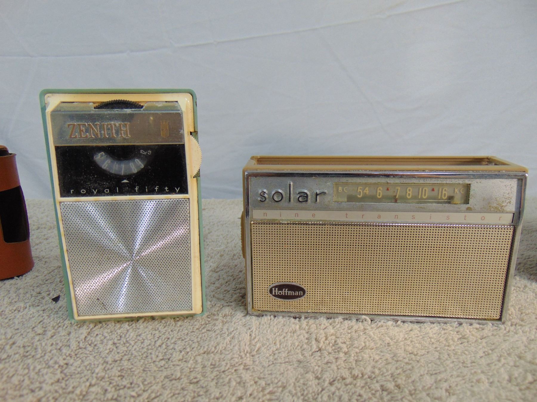 Flat of 3 vintage transistors: includes Zenith Royal 50 (leather case), Hitachi (leather case), Hoffman solar cell powered transistor (missing solar cell)