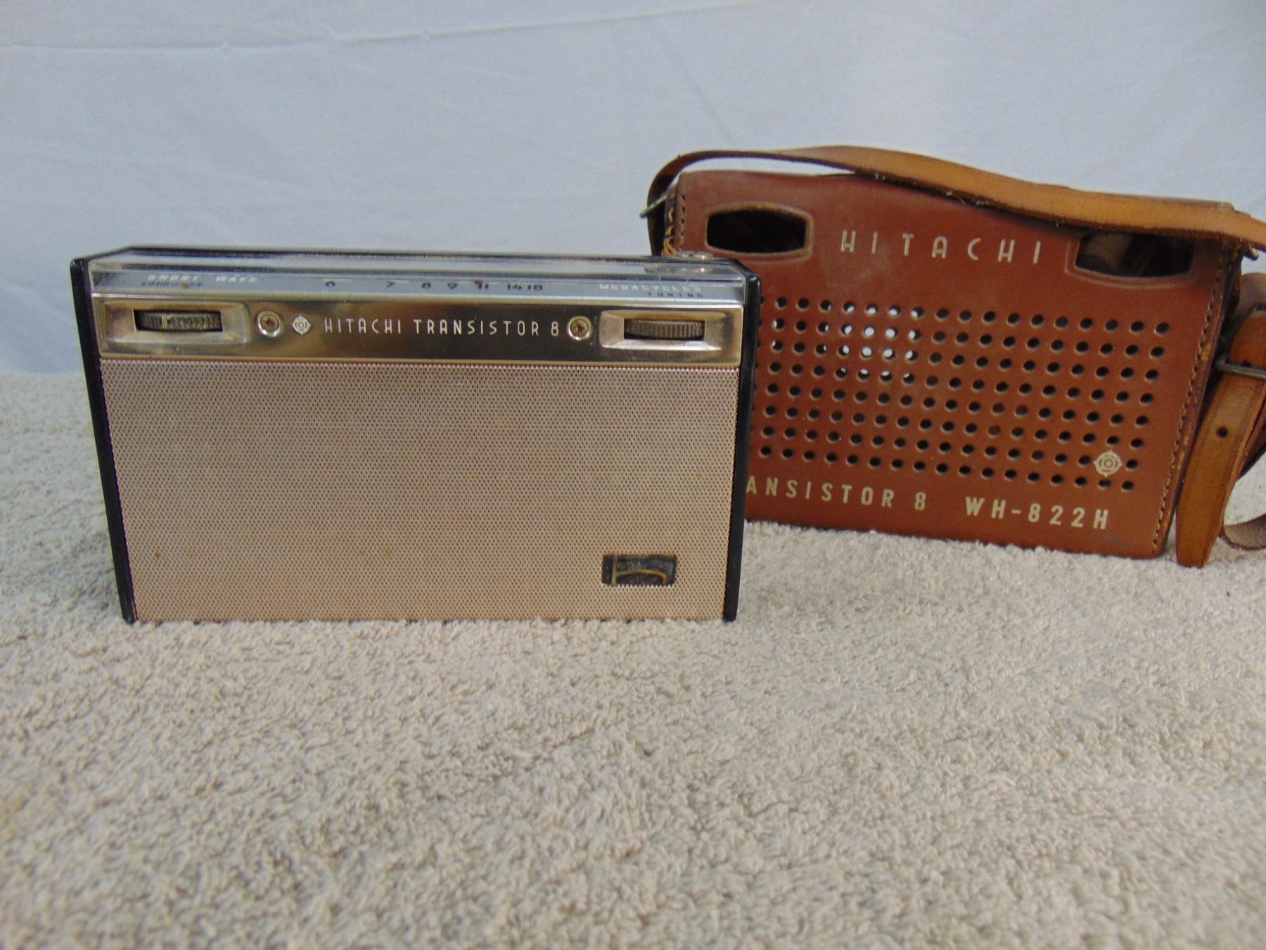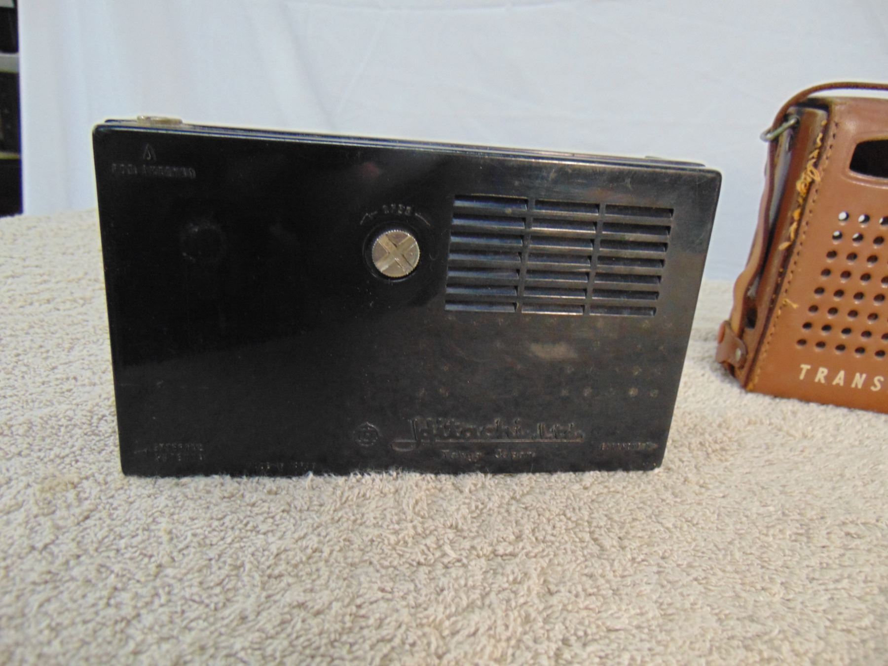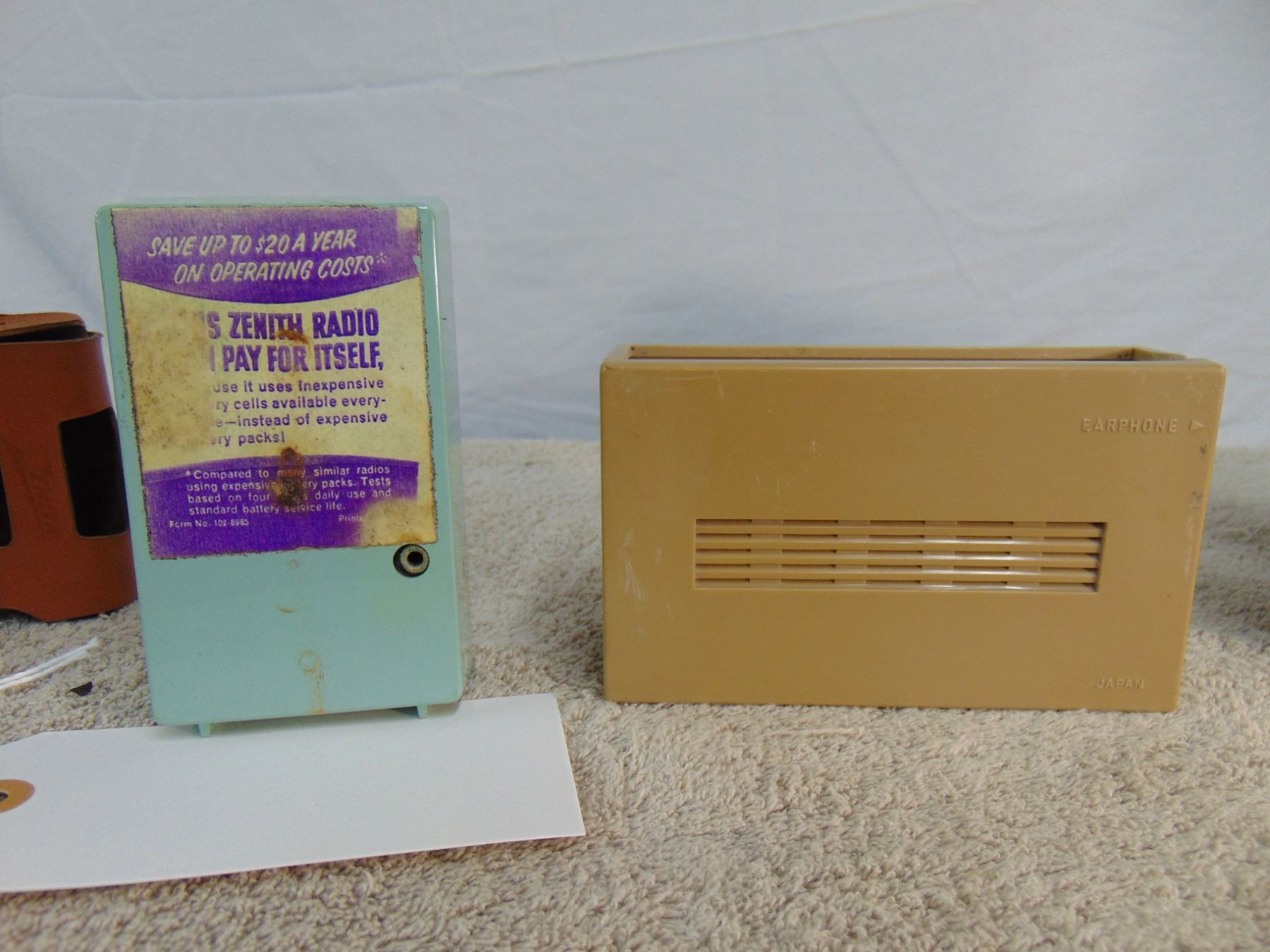 Flat of 3 vintage transistors: includes Zenith Royal 50 (leather case), Hitachi (leather case), Hoffman solar cell powered transistor (missing solar cell)