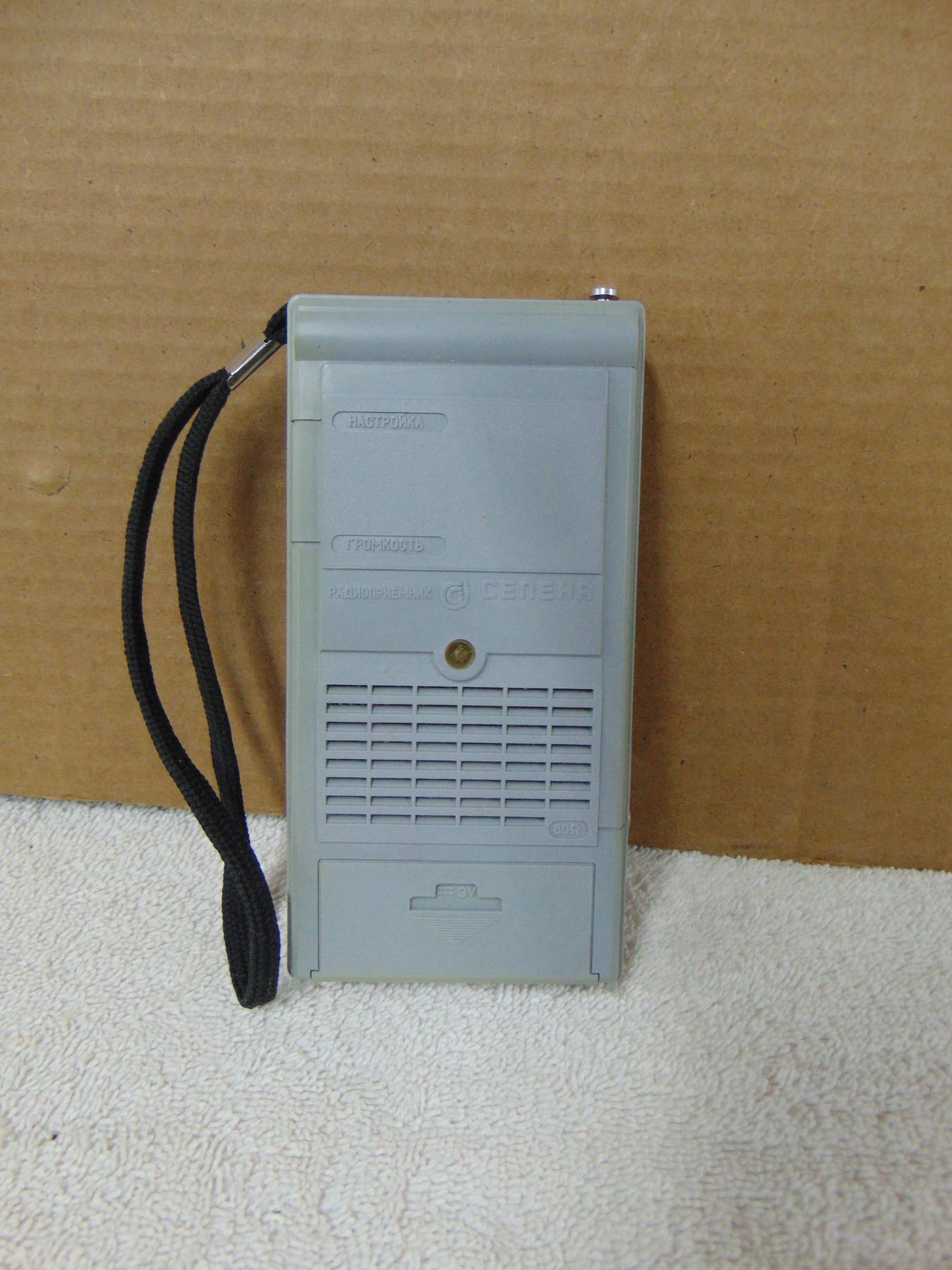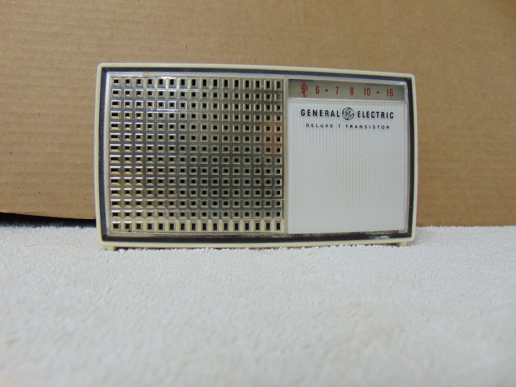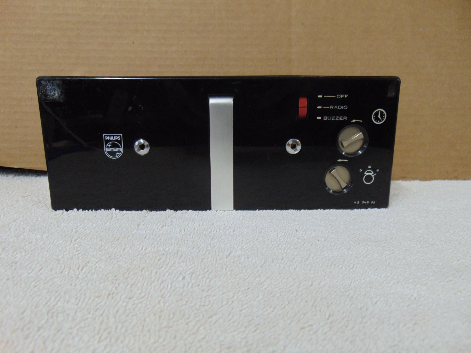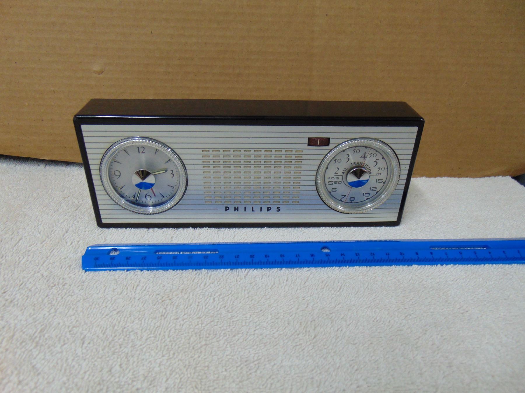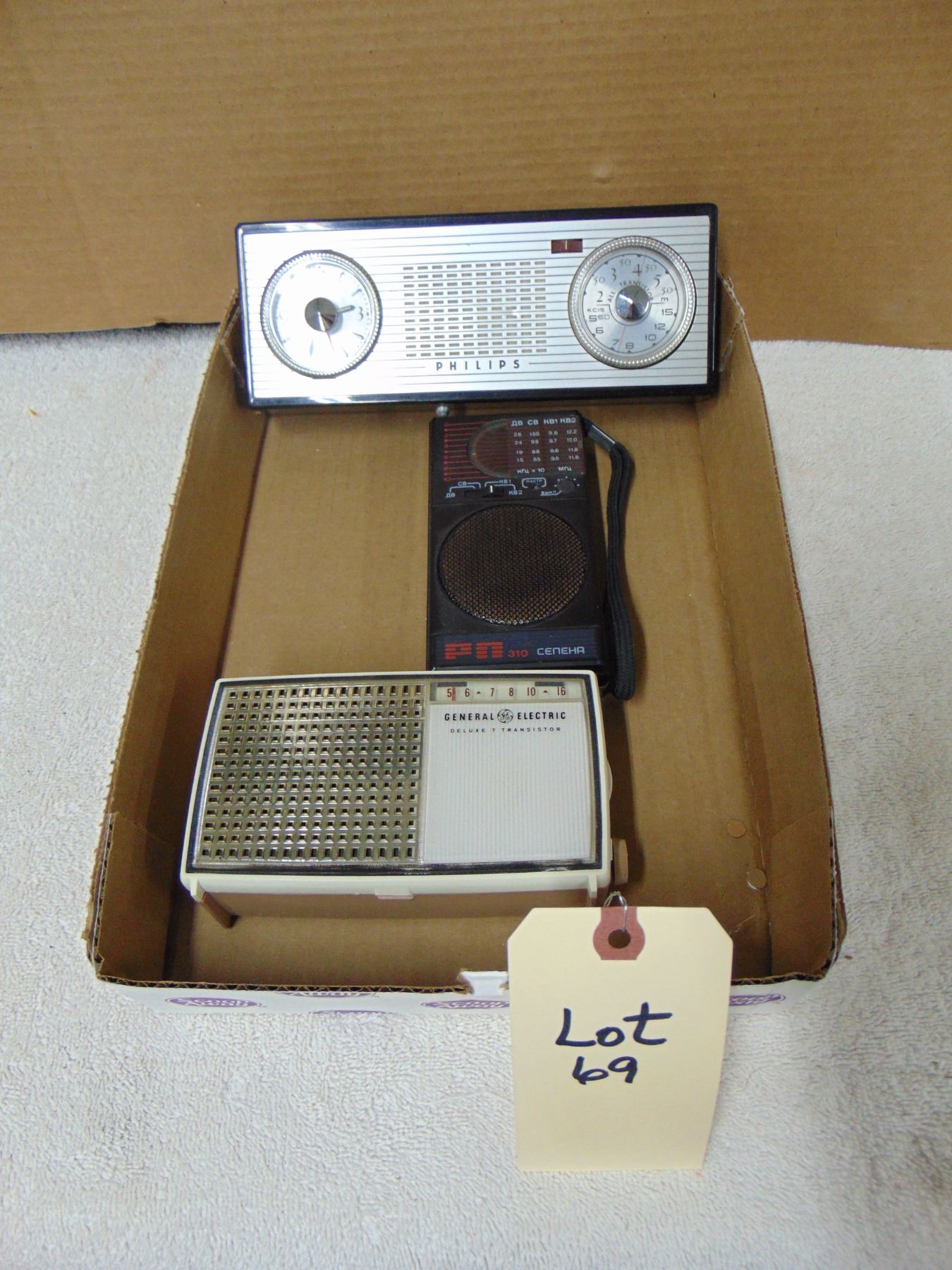 Flat of 3 vintage transistor radios; General Electric, Philips with clock, and Ceneha (maybe Russian)