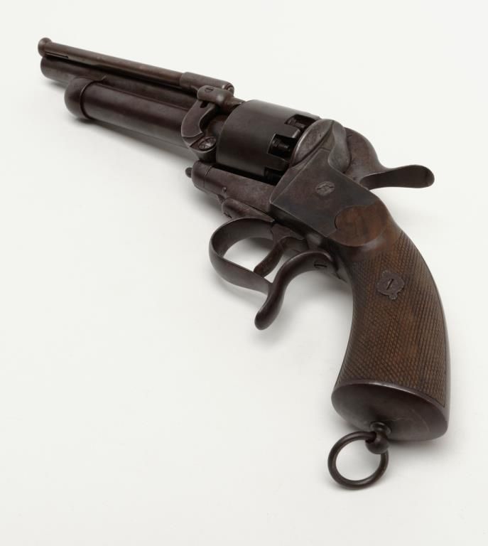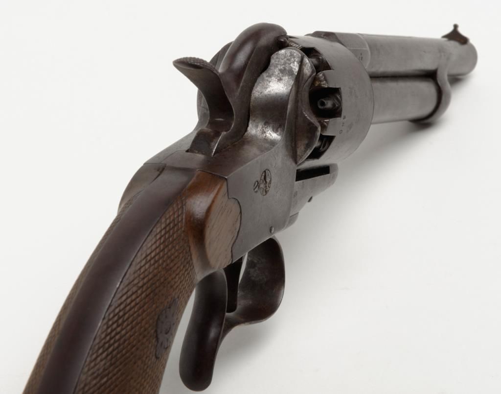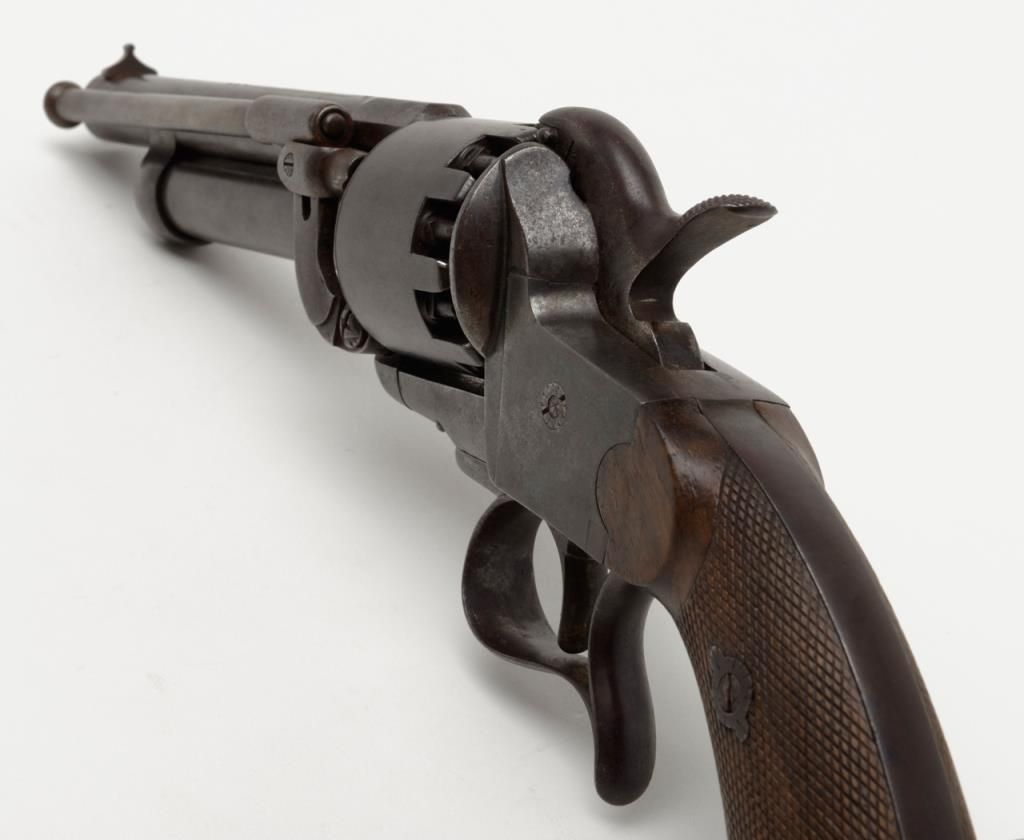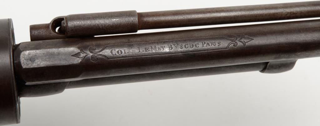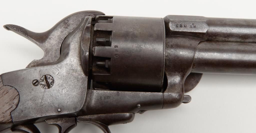 Transition 1st to 2nd model Le Mat showing square back trigger guard, 1st model mainspring and barrel latch with no catch on loading lever which is mounted on the left side, serial number 680 pictured on page 126 of “Confederate Revolvers” by William A. Gary. The right side of the barrel shows “L M” and star proof. This revolver remains in very good plus condition showing strong traces of original blue mixed in with a light brown patina perhaps as much as 10% blue. The metalsurfaces are sharp and crisp with just some beginning light normal age. The loading lever, rod and plunger are all original and not restorations. The grips are very good with fairly crisp checkering and just some slight edge wear.The barrel address is sharp and crisp and the action functions well with original movable firing pin. An exceptional Le Mat that we would rate as a strong 8 on a 1 to 10 scale. The collection of William A. Gary consigned from his estate. Est.:$10,000-$20,000