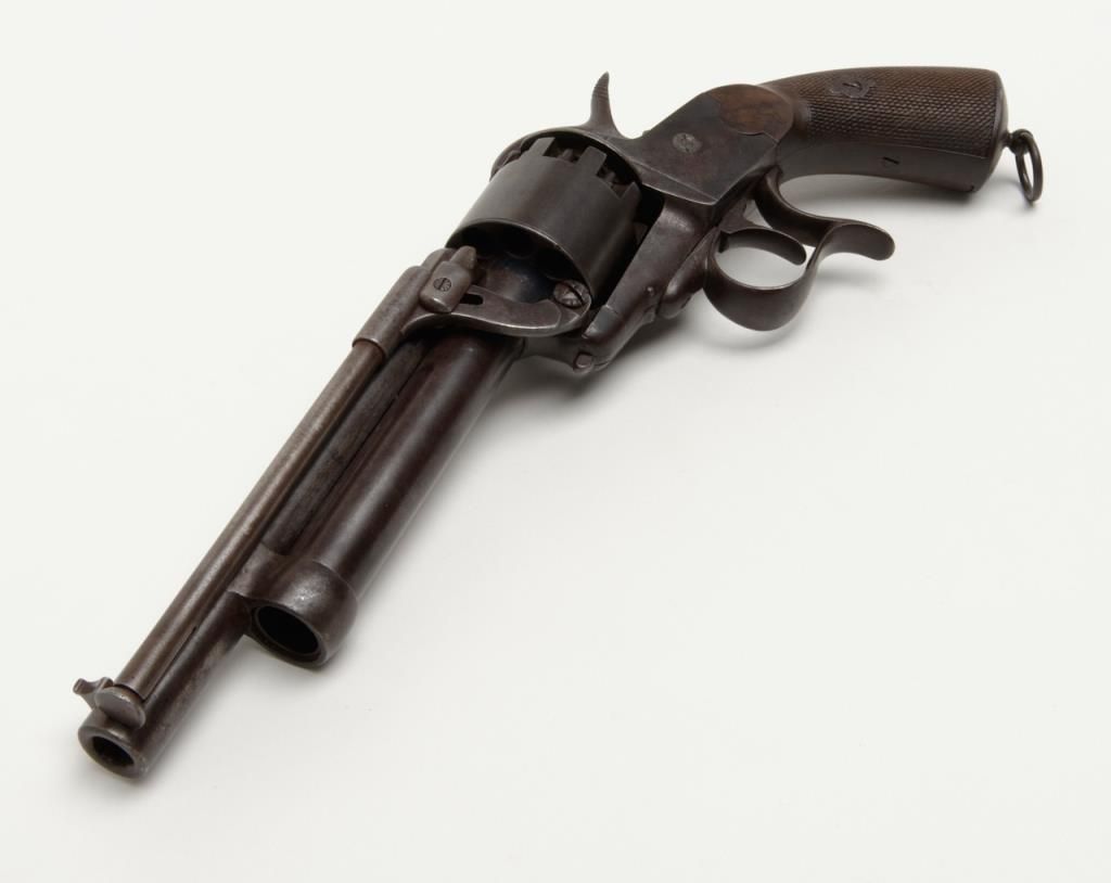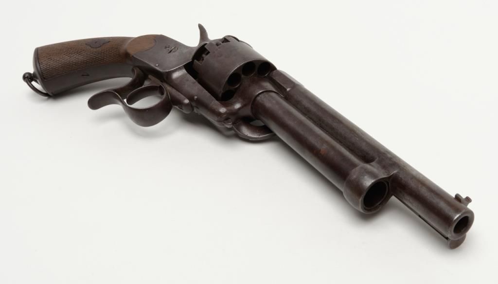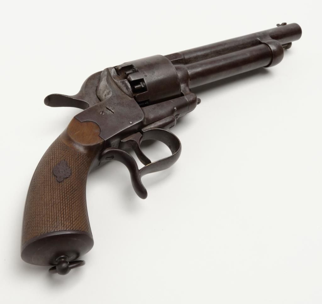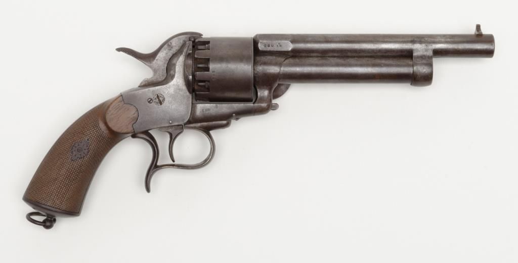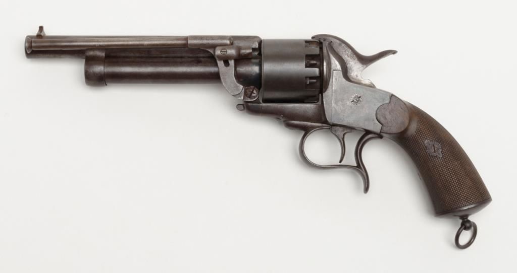 Transition 1st to 2nd model Le Mat showing square back trigger guard, 1st model mainspring and barrel latch with no catch on loading lever which is mounted on the left side, serial number 680 pictured on page 126 of “Confederate Revolvers” by William A. Gary. The right side of the barrel shows “L M” and star proof. This revolver remains in very good plus condition showing strong traces of original blue mixed in with a light brown patina perhaps as much as 10% blue. The metalsurfaces are sharp and crisp with just some beginning light normal age. The loading lever, rod and plunger are all original and not restorations. The grips are very good with fairly crisp checkering and just some slight edge wear.The barrel address is sharp and crisp and the action functions well with original movable firing pin. An exceptional Le Mat that we would rate as a strong 8 on a 1 to 10 scale. The collection of William A. Gary consigned from his estate. Est.:$10,000-$20,000