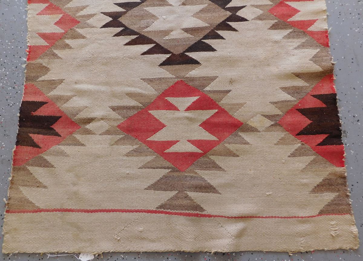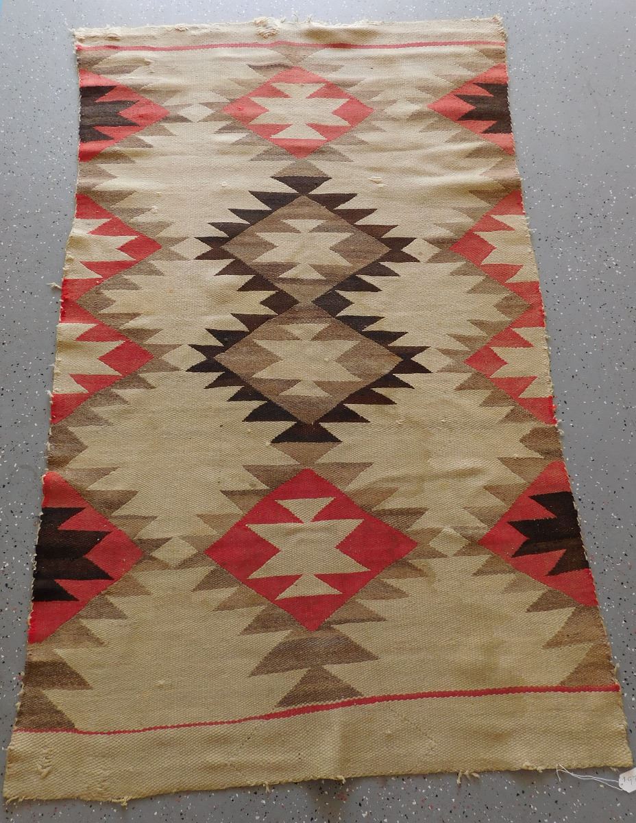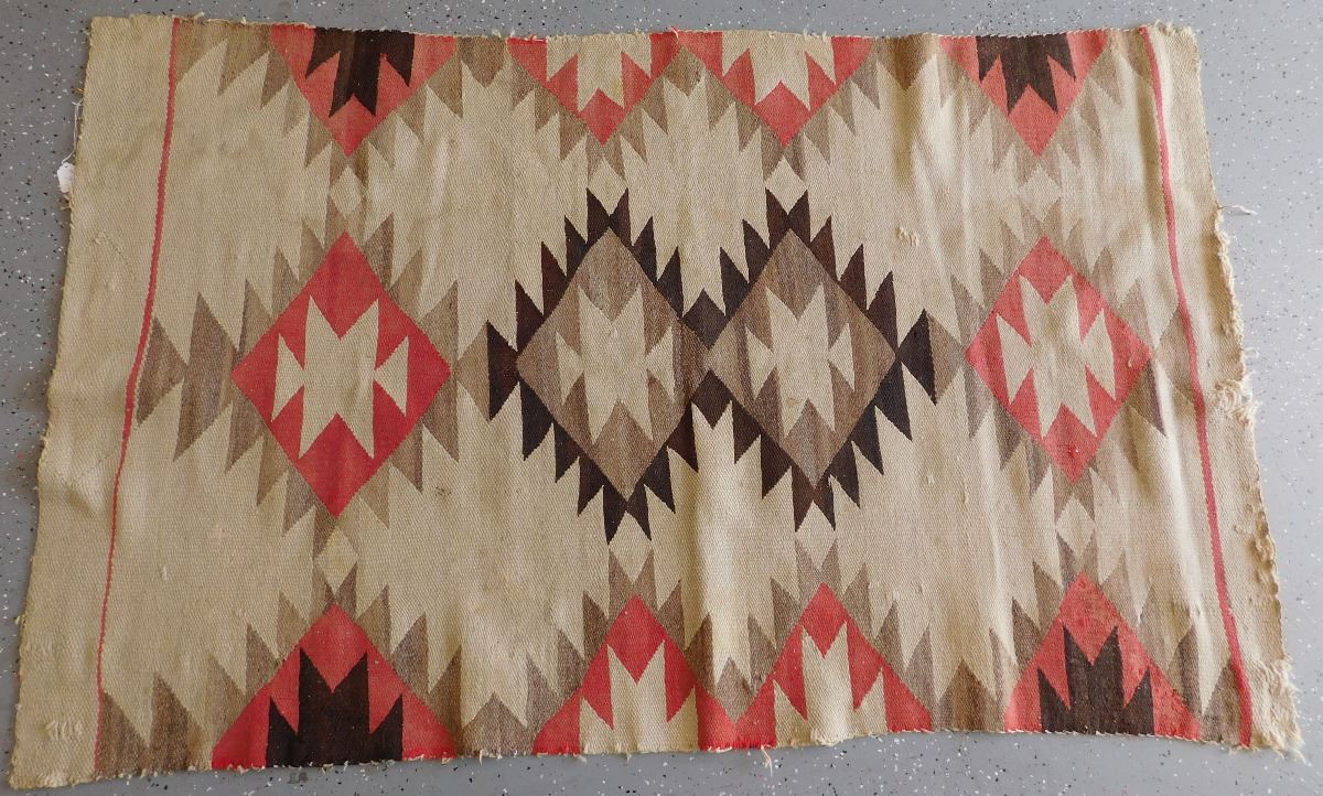 Transitional Navajo Weaving, circa 1890s. Made of wool and dye, this item measures 67" x 41". From New Mexico. No borders on this old weaving. Condition: Fair, some wear, see images. Shipping: $35.00.