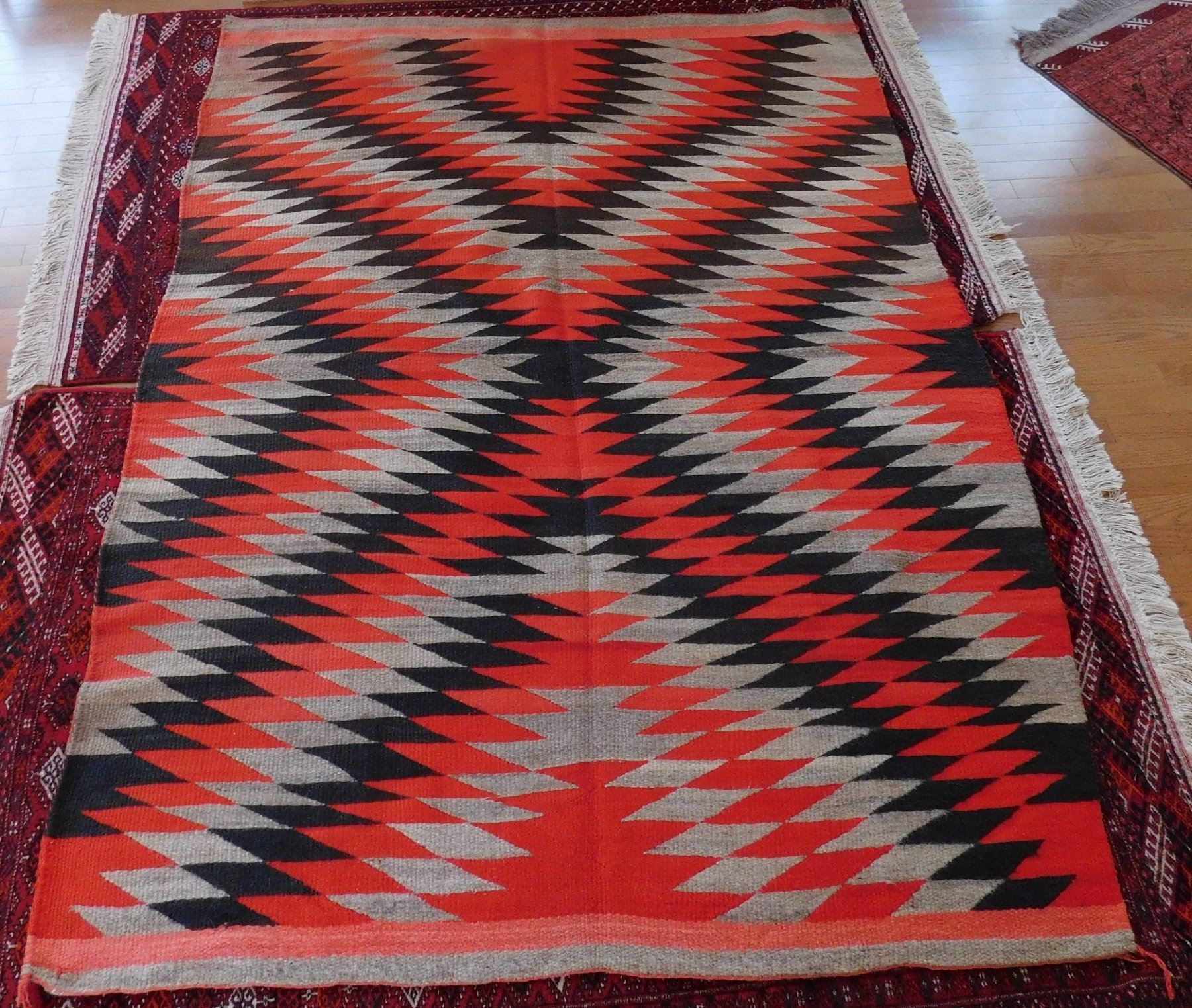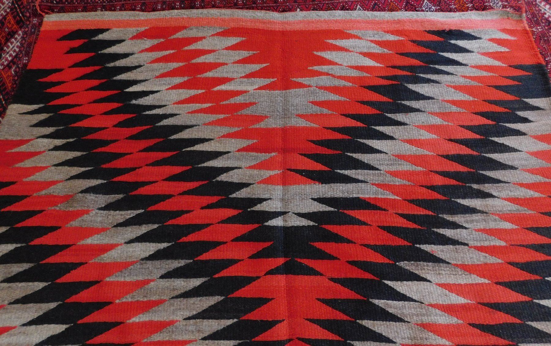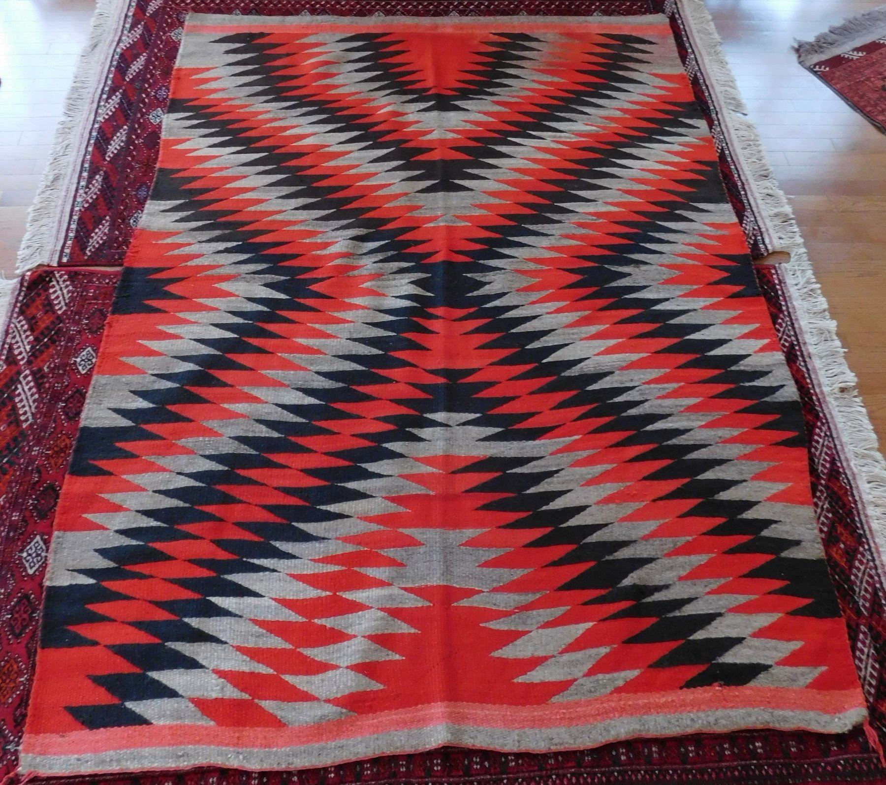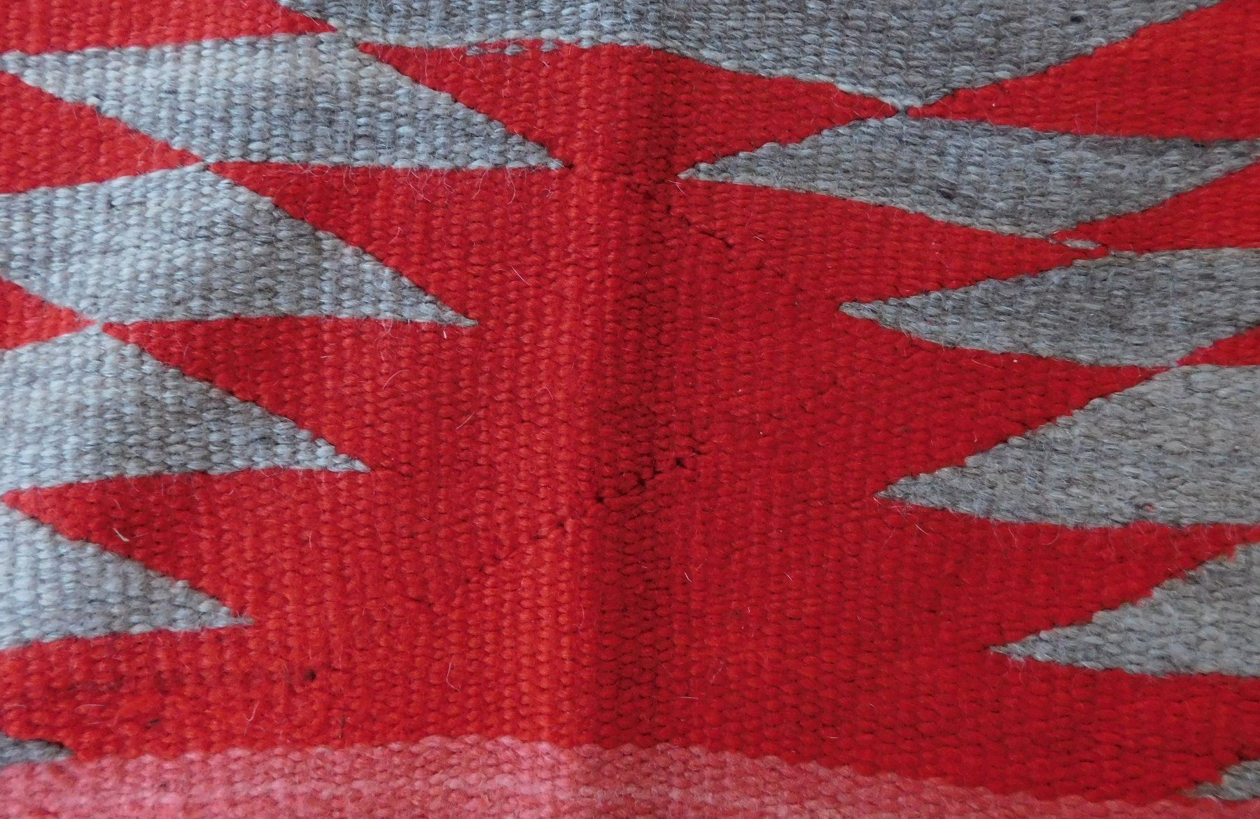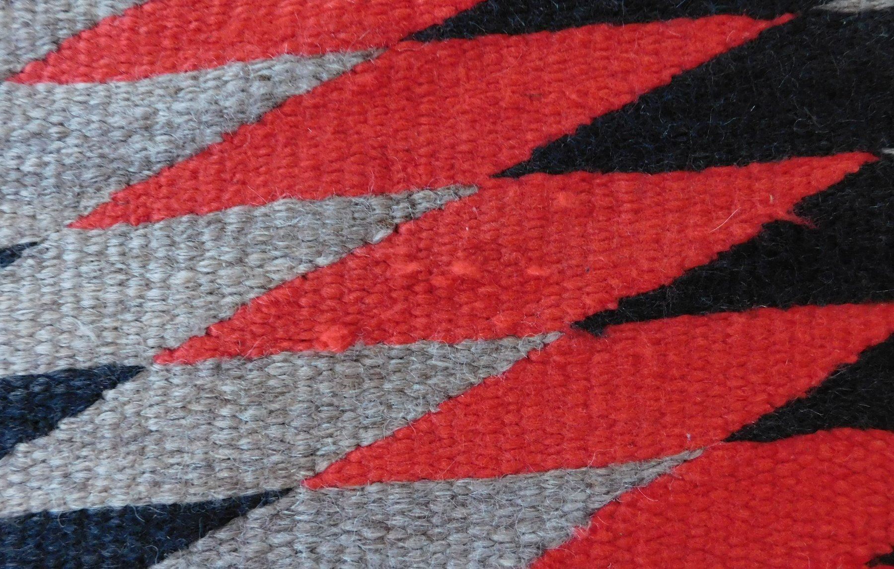 Transitional Navajo Weaving, c. 1890s. Made of wool and dye, the item measures 95 1/2" x 70". Navajo, New Mexico. Classic, large transitional weaving with red, black, tan grey, other natural colors, etc. Eye dazzler. Condition: Good, some minor bleeding and wear, see images. Shipping: $65.00 USA estimate only, w/insurance and signature, due to value, size and weight.