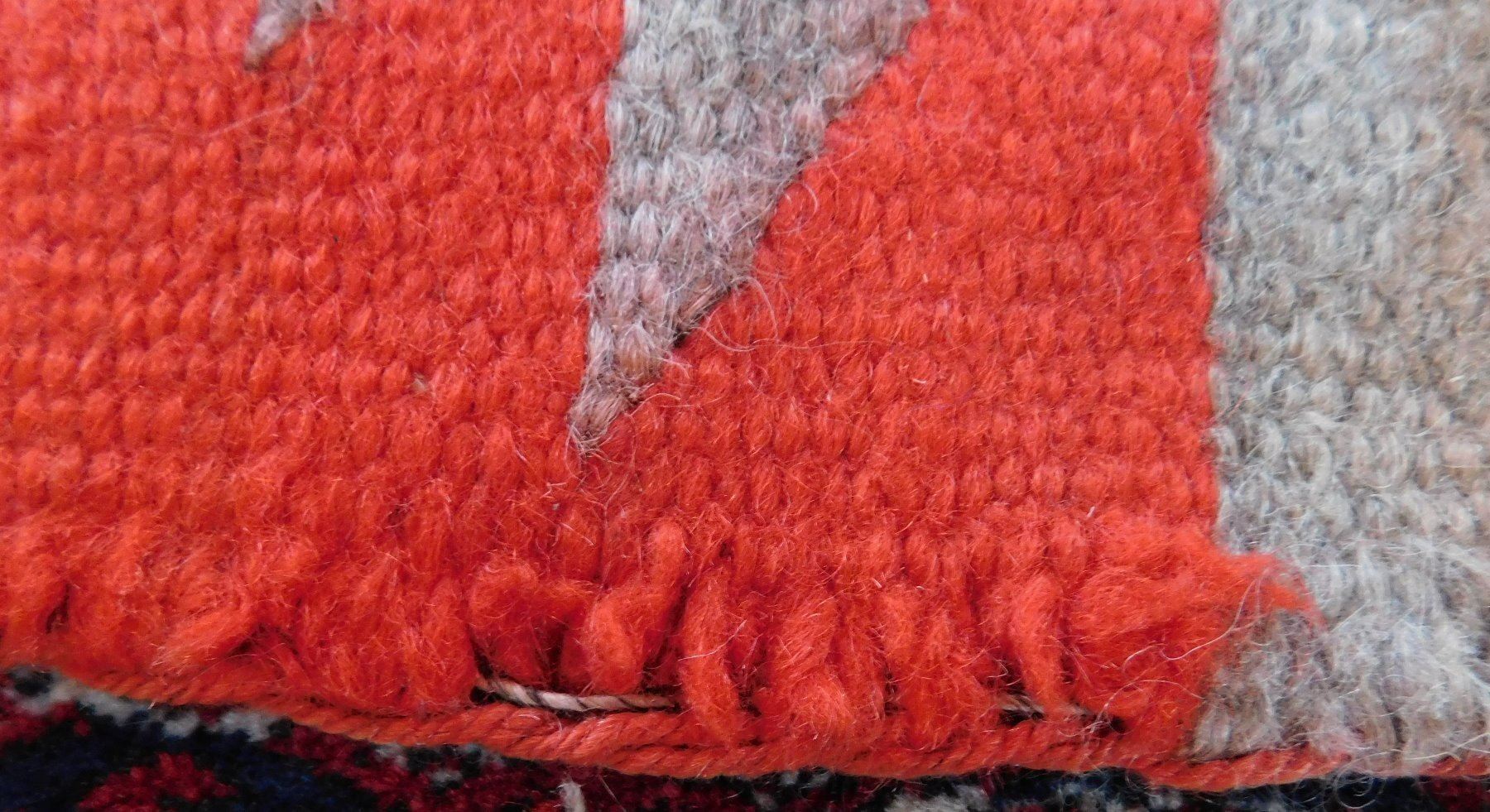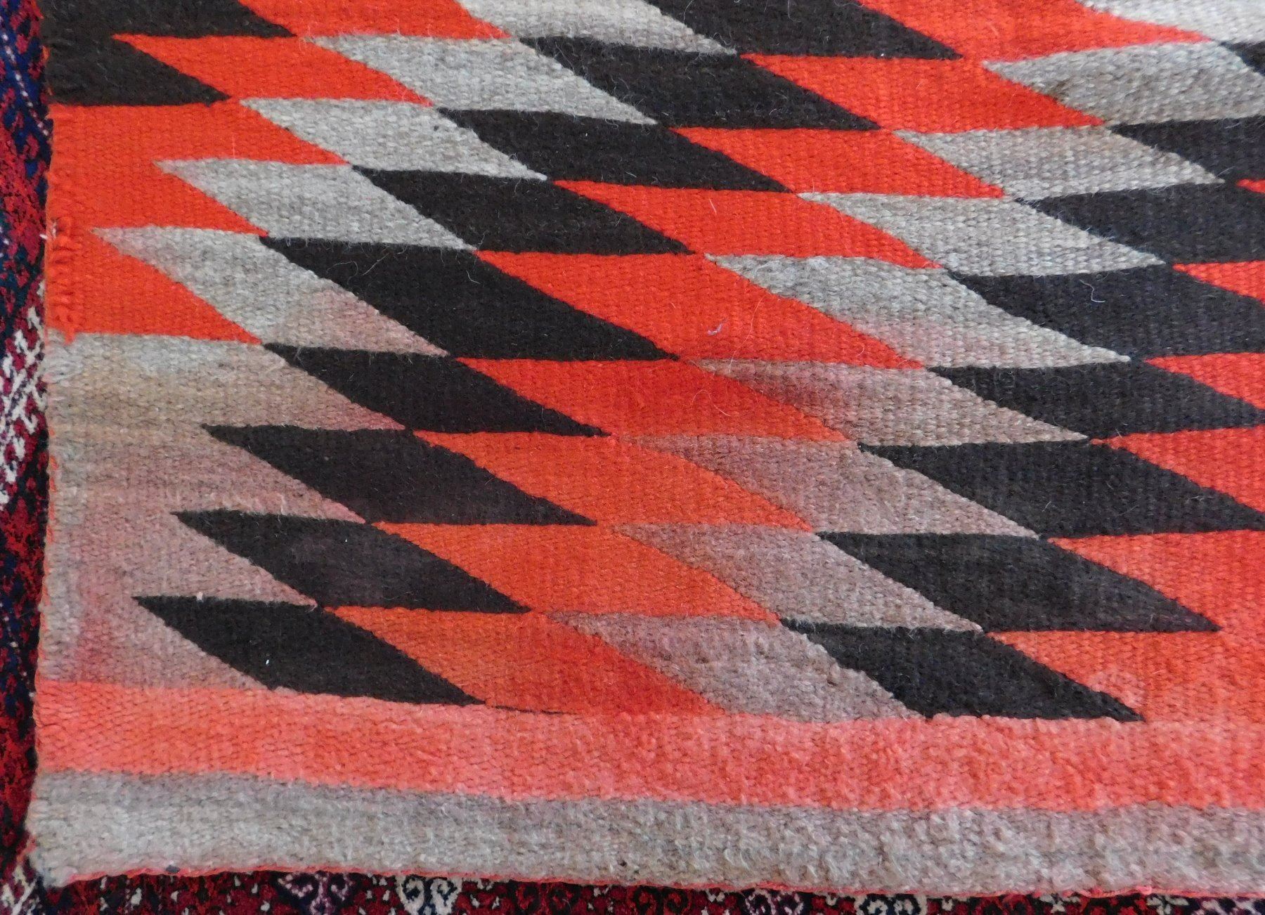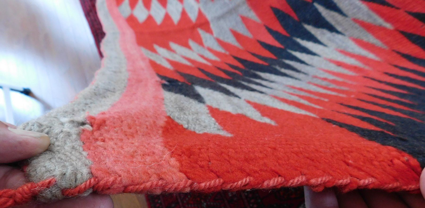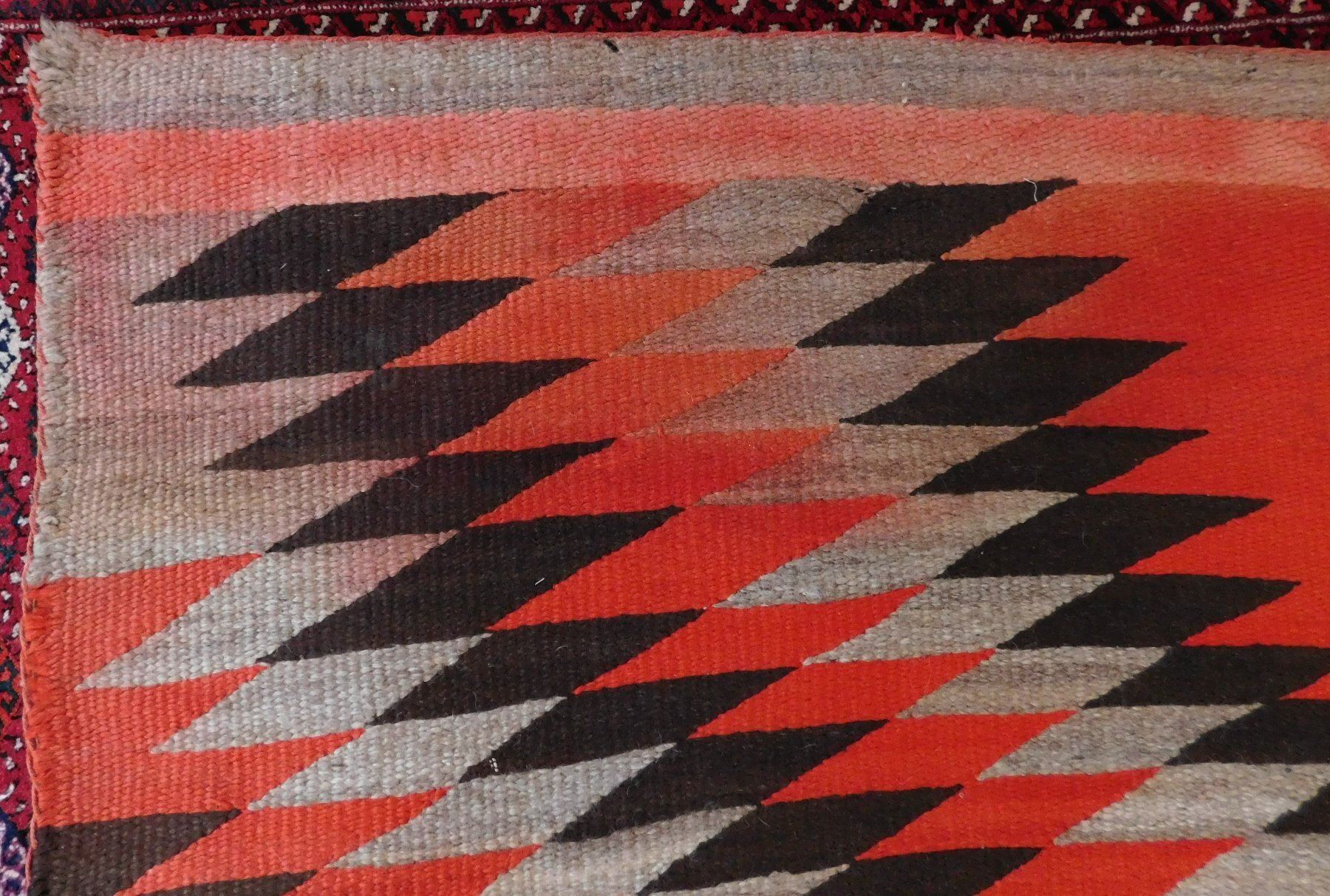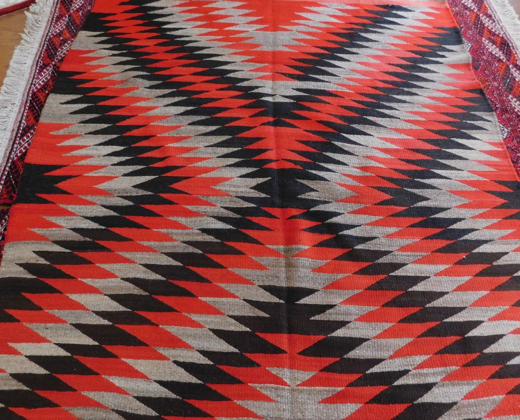 Transitional Navajo Weaving, c. 1890s. Made of wool and dye, the item measures 95 1/2" x 70". Navajo, New Mexico. Classic, large transitional weaving with red, black, tan grey, other natural colors, etc. Eye dazzler. Condition: Good, some minor bleeding and wear, see images. Shipping: $65.00 USA estimate only, w/insurance and signature, due to value, size and weight.