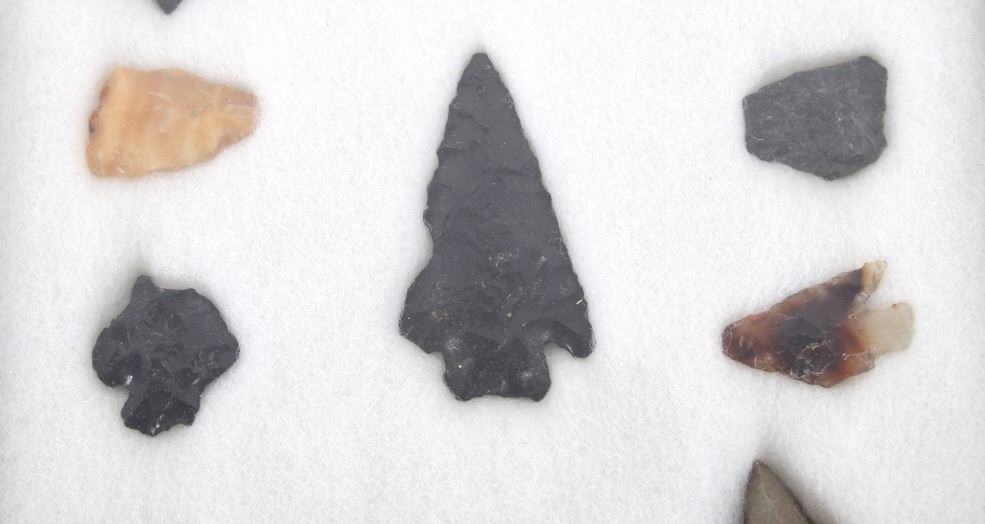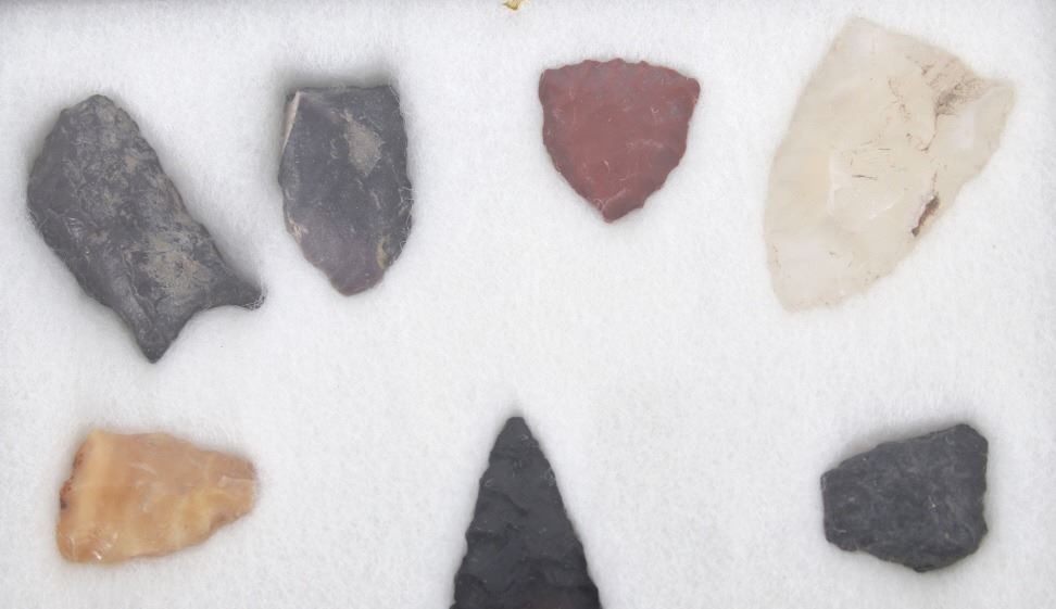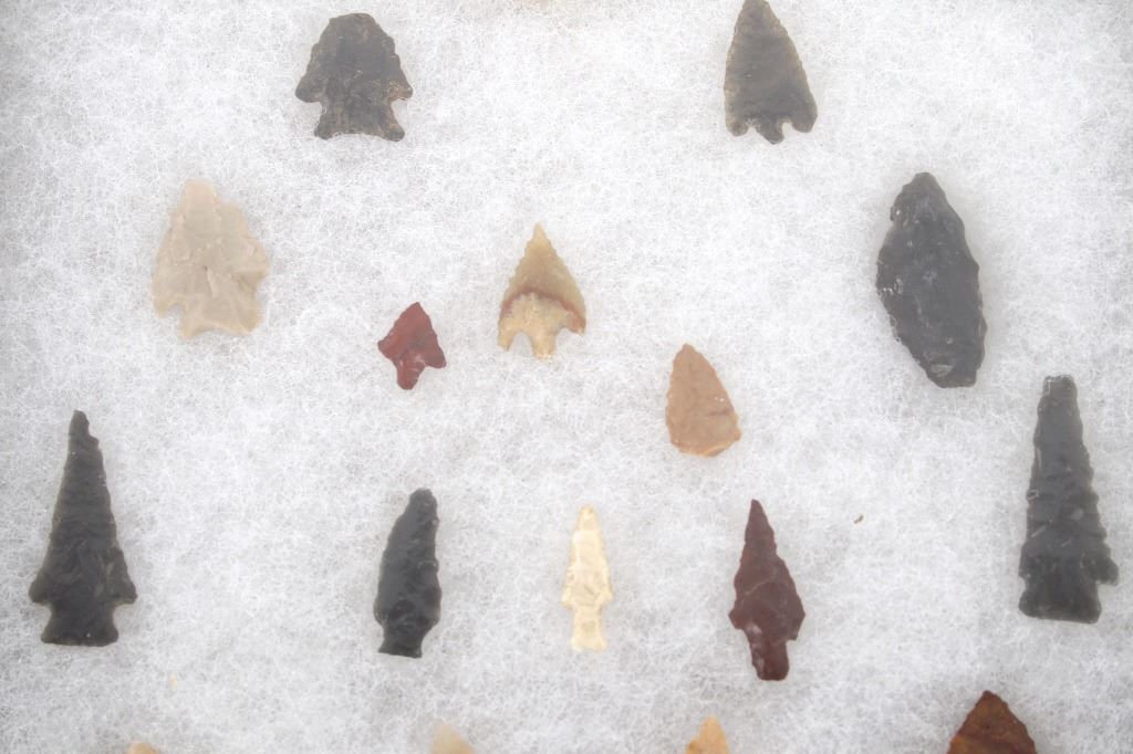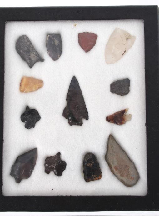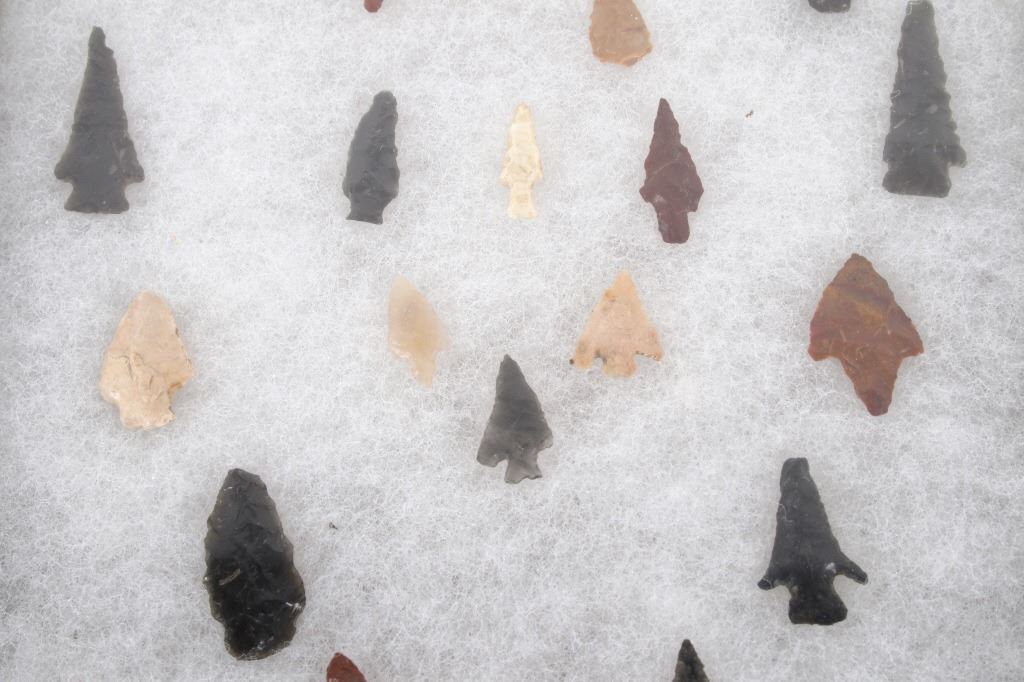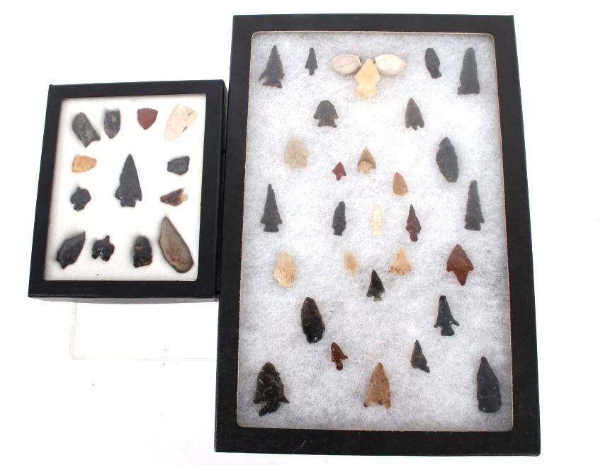 Featured in this lot is this Transitional Paleo Period artifact and point collection from the Transitional Paleo to Early Archaic period. The points are aged to 8,000 - 10,000 BP. There are a total of 42 points and two shells in this collection. The collection shows a variety of points ranging from fluted corner notched pints to small clovis fluted points, most are triangular with sharp shoulders and moderately serrated edges with a couple showing the same stature as a scraper and shows some oviod shaped points. The two shells show a cylindrical shape with pale cream coloration with some shapes of darker mineral deposits through the shell. The condition of this collection is fair with some chipping to a number of the points but otherwise the a collection features a fair overall condition. The measurements of this collection of points range from 1/2" x 3/8"