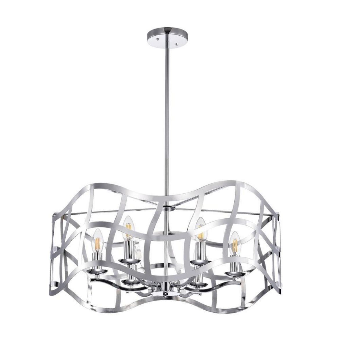 Transitional-style, 6-light, chrome finish over iron, inverted ceiling pendant light. 25" H X 8" W.Â