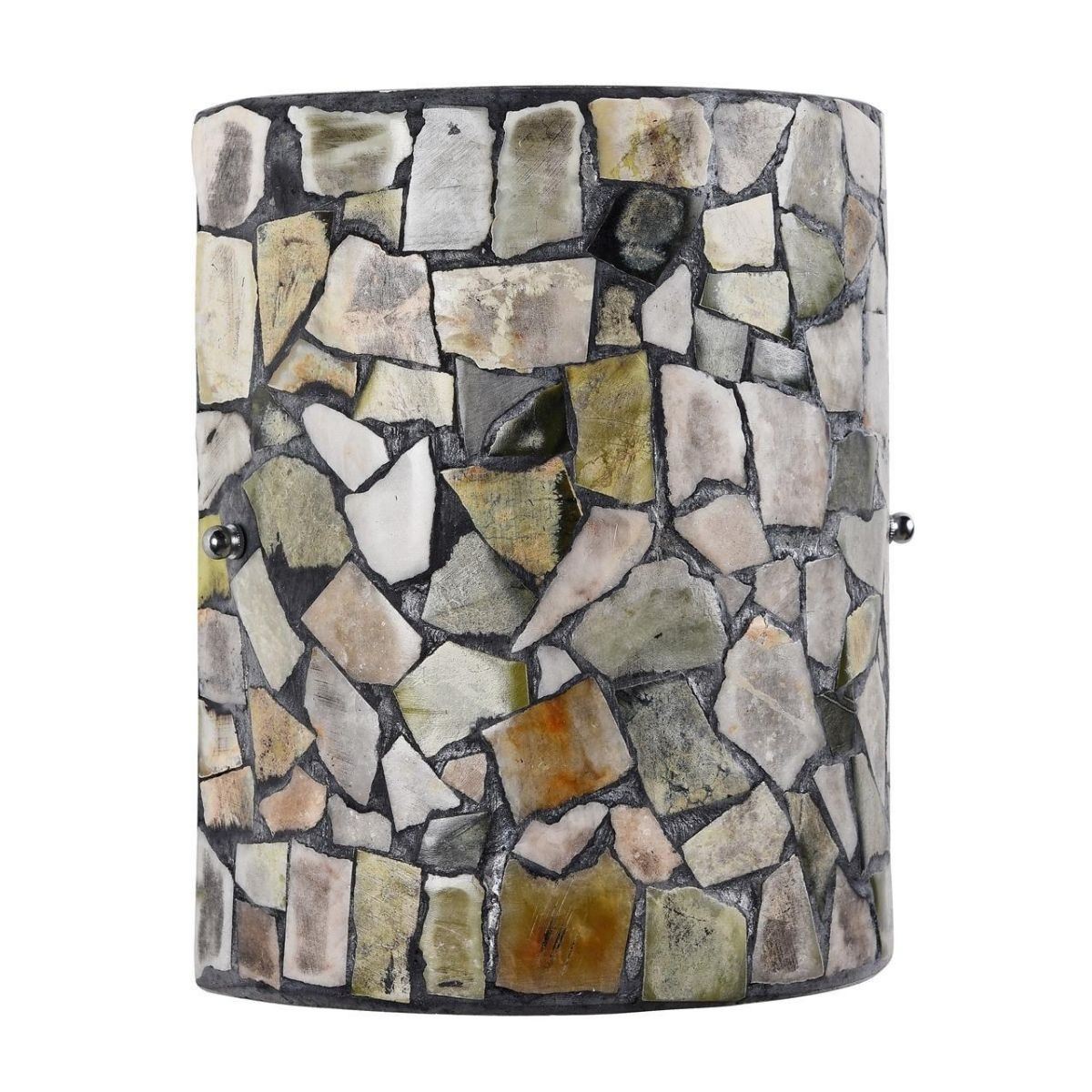 A transitional-style semi-circular shaped mosaic wall sconce, hand-crafted from over 100 pieces of stone in green & gray colors. 10" H X 8 1/2" W. 3.3lbs. ***** this lot is for 1 sconce but available as a pair, set of 4 or more per request. Â