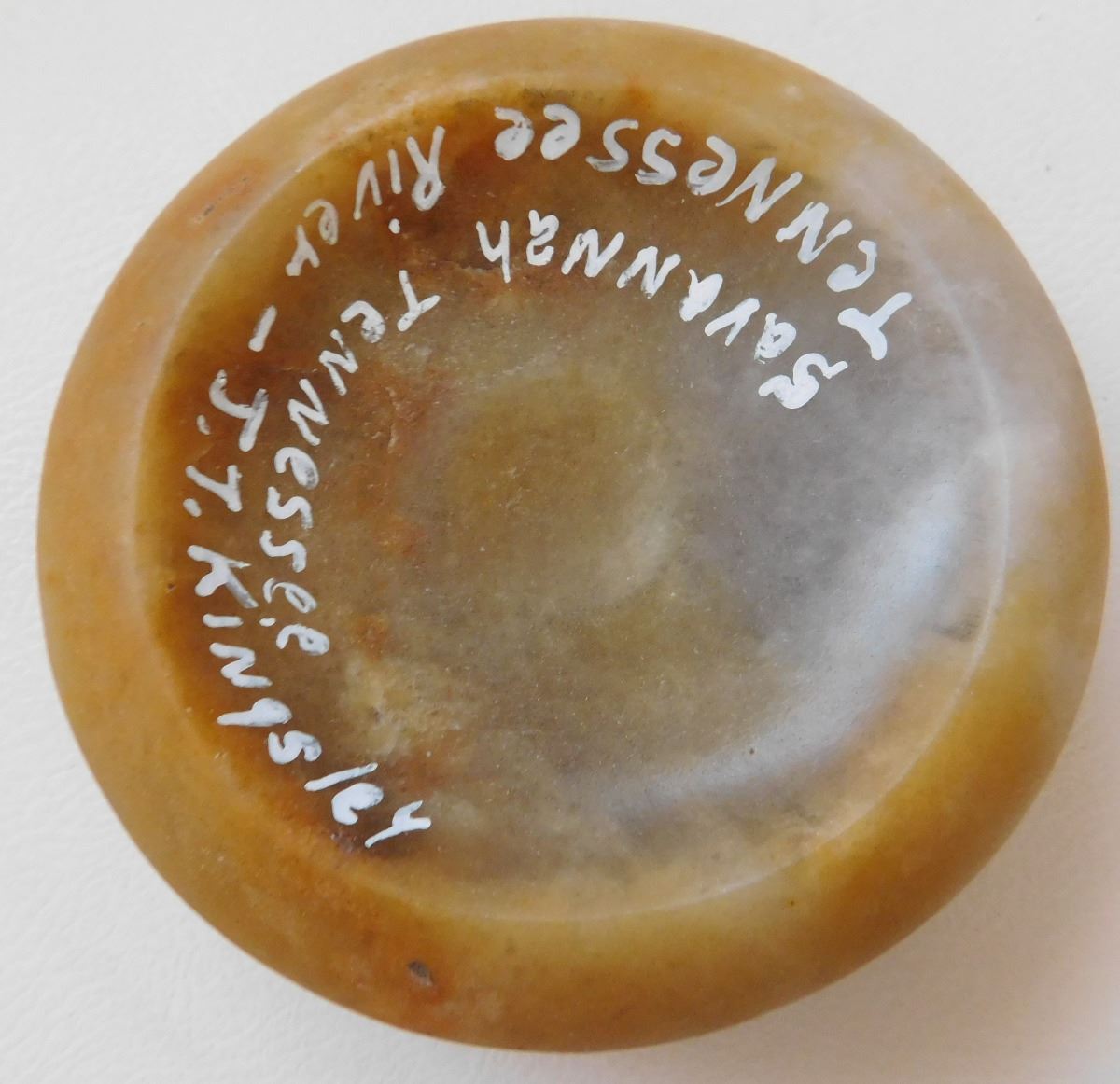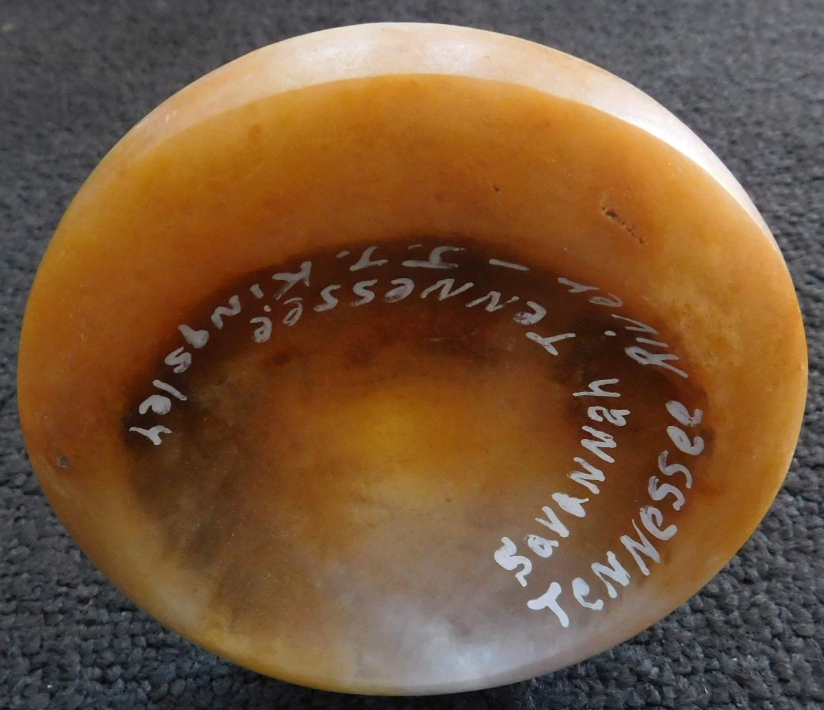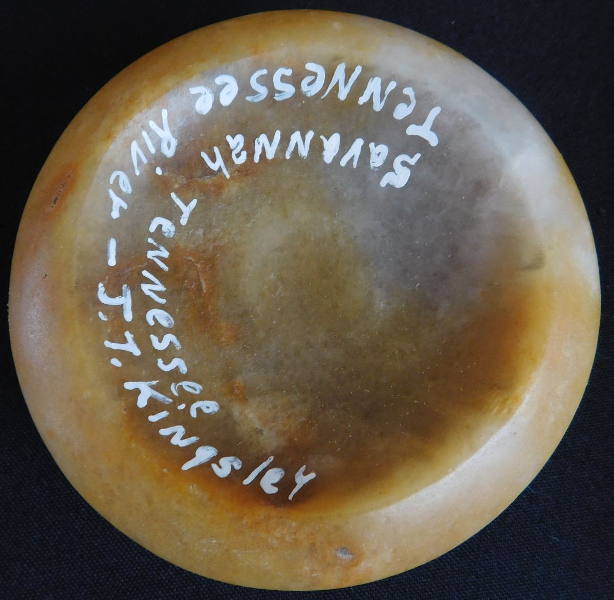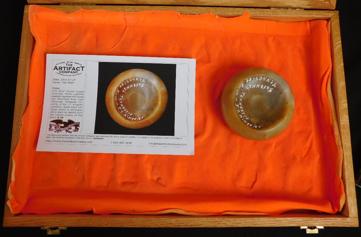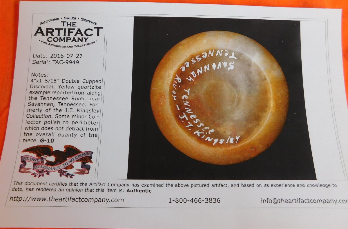 Translucent Quartz Discoidal, pre-historic item. Made of yellow quartzite, this item measures 4" x 1 5/6". From Savannah River, Tennessee. Ex-J.T. Kingsley collection. Certificate of Authenticty by The Artifact Company. Frame not included. Condition: Very fine, museum piece, see images. Shipping: $40.00 w/insurance.