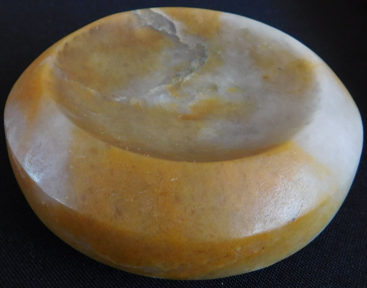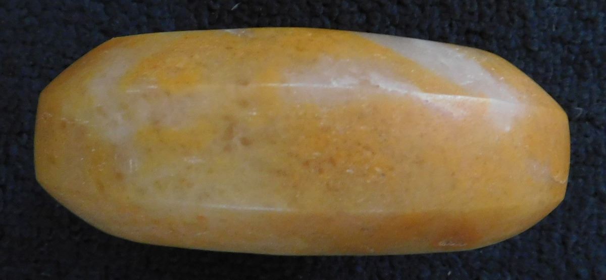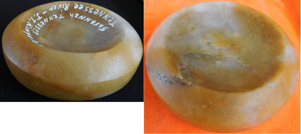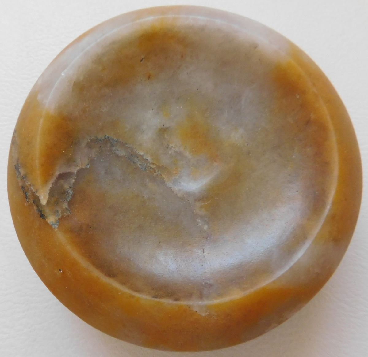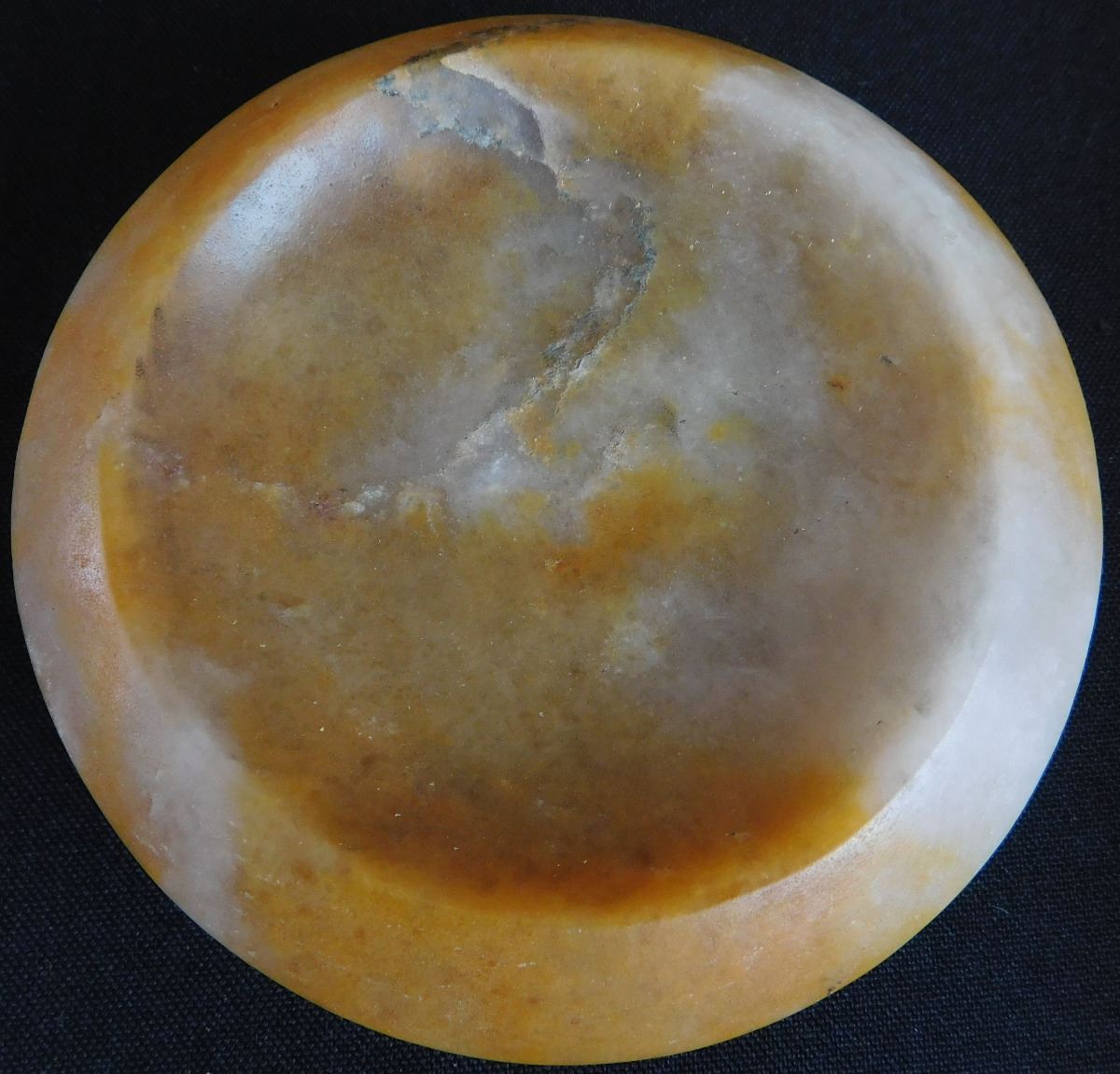 Translucent Quartz Discoidal, pre-historic item. Made of yellow quartzite, this item measures 4" x 1 5/6". From Savannah River, Tennessee. Ex-J.T. Kingsley collection. Certificate of Authenticty by The Artifact Company. Frame not included. Condition: Very fine, museum piece, see images. Shipping: $40.00 w/insurance.