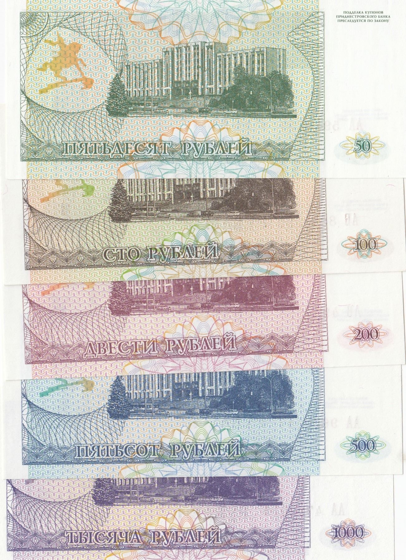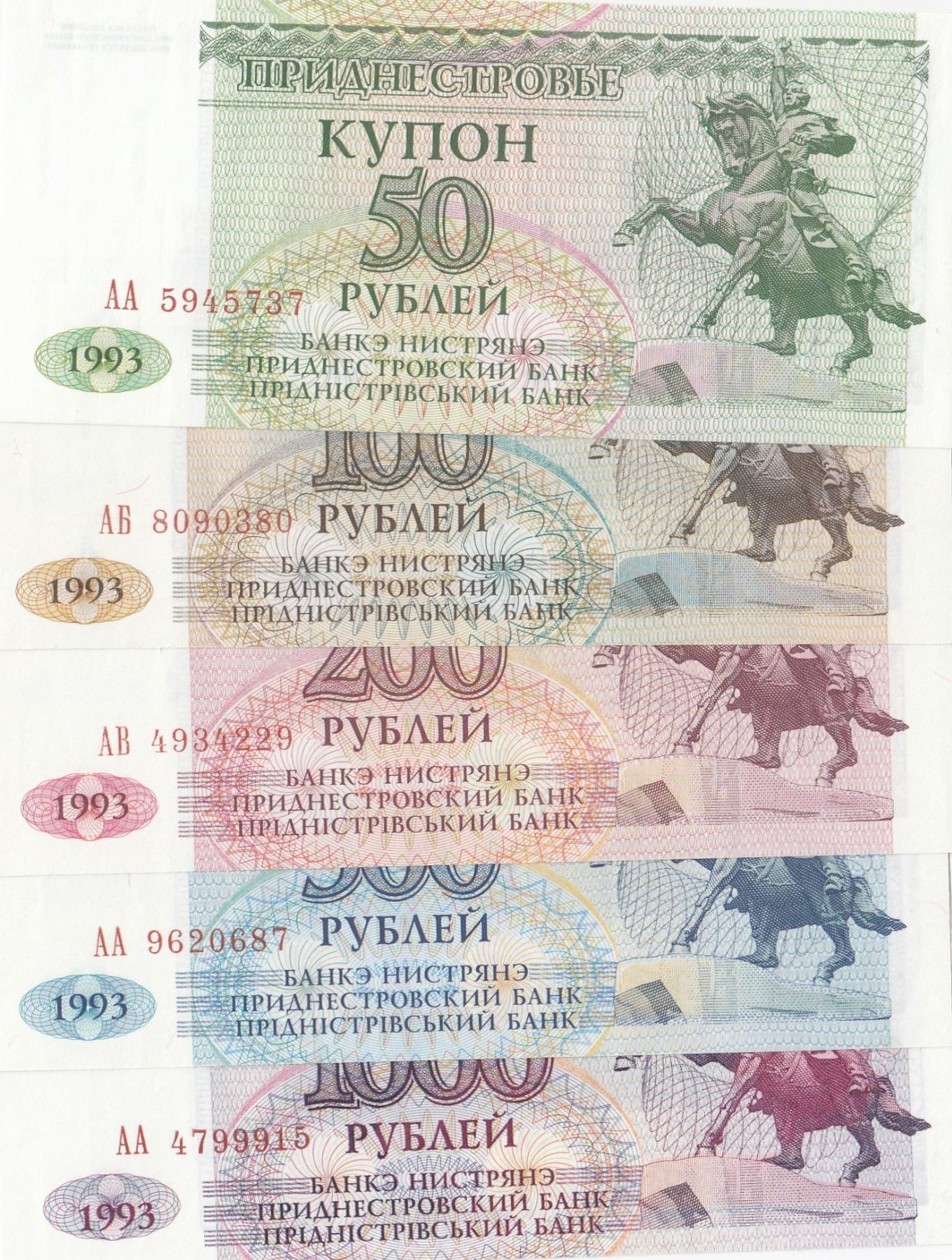 Transnistria, 50 Rublei, 100 Rublei, 200 Rublei, 500 Rublei and 1.000 Rublei, 1993, UNC, p19, p20, p21, p22, p23, (Total 5 banknotes)br/Transnistria is a small country between Moldova and Ukraine on the edge of the Dniester River, where no country recognizes its independence. 5 different banknotes of this country