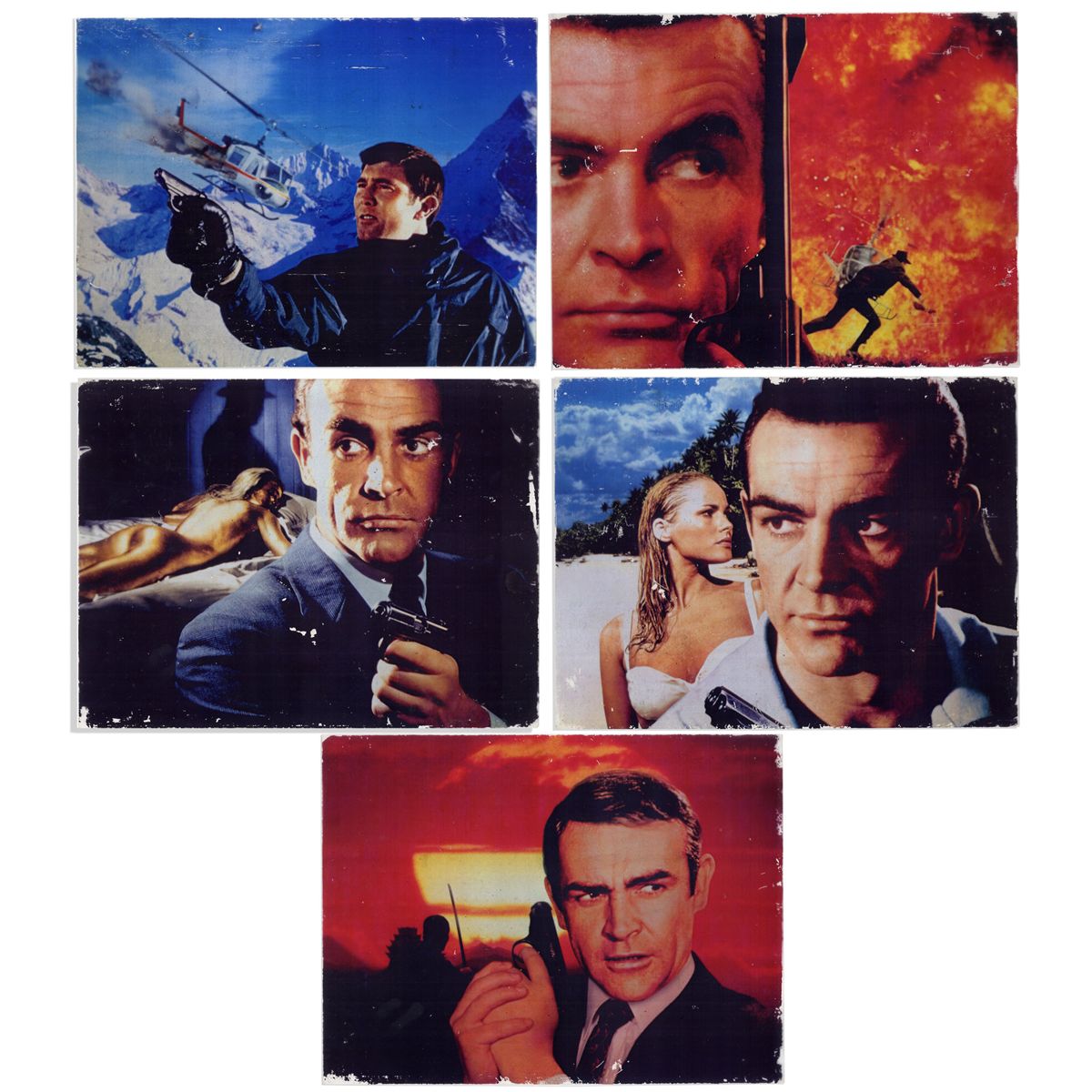 Lot of five transparencies from ''Dr. No'', the first ever film of the James Bond juggernaut. Each transparency features Sean Connery in iconic poses in the movie against dramatic hot and cold backgrounds. Each sheet measures 10'' x 13''. Scattered chipping to images. Very good overall.