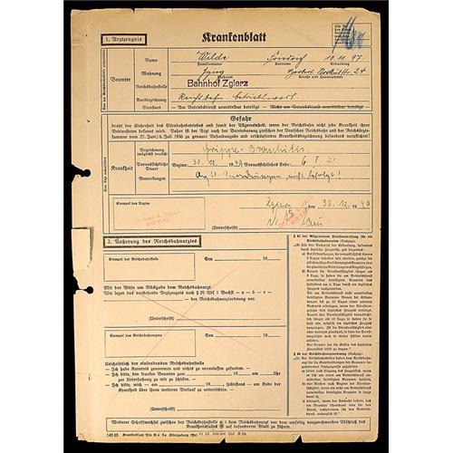 <Our item number 141063><B>Transport Order From Zgierz, Poland.</B> An "Illness Sheet" for F--- Wilde of Zgierz, who was diagnosed with the grippe and bronchitis on 30 Dec. 1940, expected to "end" on 6 Jan. 1941, 1p (front and back), 11¾x8 in Stamped and signed by Dr. R. Haus. In German. One stamp on the front and one on the back from Zgierz Railroad Station, which is rare. On the back is a " Transport" stamp circled in red pencil and with a red exclamation point added. Six other stamps below include "Littmannstadt Ghetto Administration" stamps, "Reichsbahndirektion Polen" stamp dated 12 Jan. 1941, and others. This page has several edge chips and tears. <BR>Estimated Value $300 - 400. <BR><BR>Our item number 141063<BR><IMAGES><P ALIGN="CENTER"><IMG SRC="http://www.goldbergcoins.net/liveauction/49jpegs/141063.jpg"> <BR><IMG SRC="http://www.goldbergcoins.net/liveauction/49jpegs/141063N2.jpg"> </P></IMAGES>