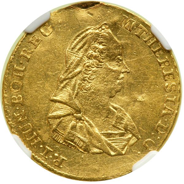 Transylvania. 2 Ducats, 1779-HS. Fr-541: KM-650. Maria Thersia, 1740-1780. Older bust right. Reverse: Double eagle. Mount mark at top, surface damage. NGC graded Extremely Fine, Details.