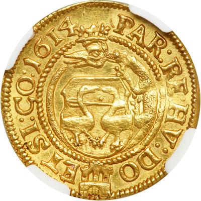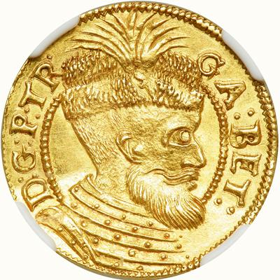 Transylvania. Ducat, 1614 (Klausenburg). Fr-350; Resch-6 var; KM-102. Gabriel Bethlen, 1613-1629. Bust right with fur cap. Reverse: Bethlen arms. A lovely original example, sharply struck with fresh mint luster. In a new NGC 4 prong holder. NGC graded MS-62.