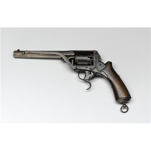 <B>Tranter English Revolver Carried by a Confederate Officer in the 45th Alabama,</B></I> .44 caliber, five shot cylinder, serial number 4987. William Tranter produced revolvers under license from Deane, Adams and Deane after producing frames for the firm. He improved on the Adams self-cocking trigger by incorporating a double-action trigger mechanism allowing for more accurate fire. This pistol bears a 6.25 inch barrel with mostly illegible engraving on the top, most likely retailer information. The serial number is stamped on the cylinder and proofmarks are between each nipple. The left side of the frame is stamped "ADAMS PATENT" in an oval. The left side of the barrel under the loading lever is stamped, "CO. E. 45 ALA. INF." and the right side of the grips is marked, "A.J. BETHUNE." The muster roll of Company E of the 45th Alabama Infantry Regiment as listed by Robert Horn in <I>Men of the 45th Alabama Infantry Regiment</B></I> lists one Bethune, A. J. with the following notation, "Muster Roll, March, 20, 1862: Enlisted same date in Macon County by W.J. Lee. POW - Captured near Ackworth, Georgia, June 11, 1864, Sent to Louisville, to Camp Morton, arriving Camp Morton, July 1, 1864; transferred for exchange February 26, 1865." Photographs of this pistol appear on page 71 of <I>Firearms from Europe</B></I> by David Noe, Larry W. Yantz and James B. Whisker. This pistol, mechanically very good, retains some blue on the trigger and hammer with the balance turning a plum brown. The grips are worn with expected dings and dents.<BR><BR><b>Shipping:</b> Large Collectibles (<a target="_blank" href="http://www.heritageauctions.com/common/shipping.php">view shipping information</a>)
