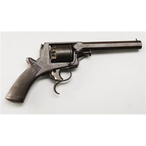 <B>Tranter English Revolver.</B></I> This .44 caliber revolver, serial number 2800, features a five-shot cylinder, octagon barrel, side loading lever, and the double-action trigger mechanism, all made of iron. The iron front sight is the post style inlaid into the barrel flat. The checkered hood grip shows slight wear. The cylinder does not have the serial number on the circumference but does have the proof marks between each nipple. <BR><BR>The top flat is marked “W. Tranter's Patent” over “Hyde & Goodrich, Agents for the United States South.” There is decorative engraving on the frame, part of barrel, loading lever, trigger guard, and butt plate. <BR><BR>William Tranter produced revolvers under license from Deane, Adams and Deane. Tranter improved the Adams self-cocking trigger with the double action trigger mechanism. Hyde & Goodrich, New Orleans made, bought, and imported “war supplied” guns. <BR><BR><B>Condition:</B></I> Good plain dark patina throughout with sharp edges. Mechanically, the revolver is sound and appears to be all original. <BR><BR><B>Provenance:</B></I> Until now, in the possession of the family of Lt. Clayton Scholes, 14th New York Militia. He was killed at the Battle of First Manassas (Bull Run), July 1861. His brother traveled from Brooklyn, New York to retrieve the body and his personal effects. This revolver remained in the family. Affidavit of provenance included.<BR><BR><b>Shipping:</b> Flat Material, Large (<a target="_blank" href="http://www.heritageauctions.com/common/shipping.php">view shipping information</a>)