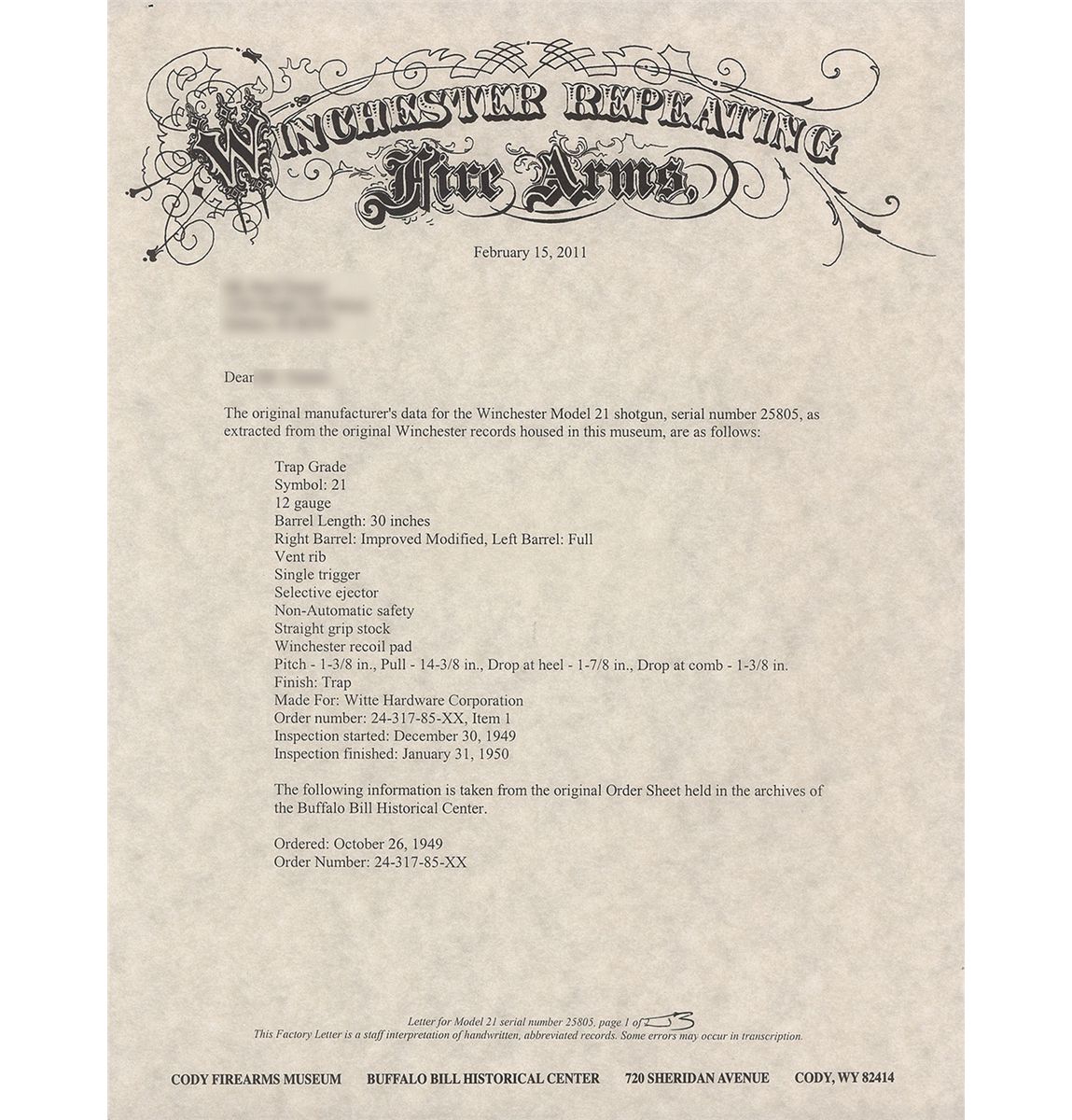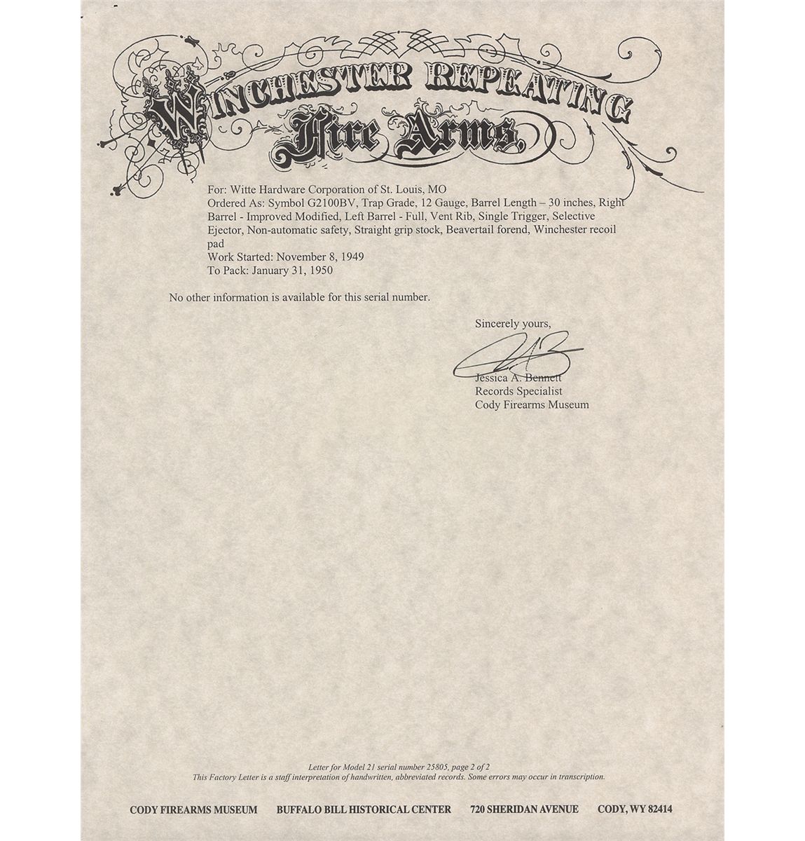 Manufactured in 1949. Choked improved modified/full, 2 3/4" chambers with ejectors and a 14" LOP. Factory letter verifies configuration except that it had a straight grip stock.