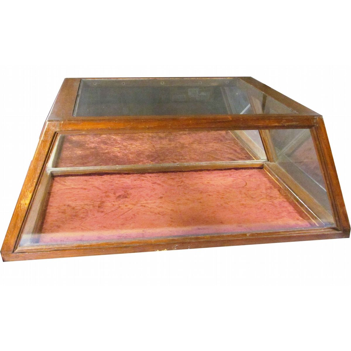Trapazoid Shaped Oak Showcase. Excellent condition. 13 X 20 inches.