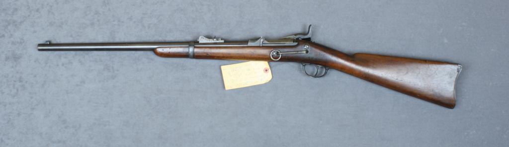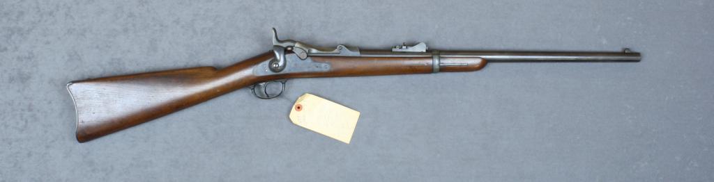 Trapdoor Springfield SRC.45-70 cal., 22”  round barrel, blue and case hardened finish,  wood stock, #182654*. This gun is in overall  fine to excellent condition showing  considerable original military blue finish on barrel mixed with a plum brown patina, muted  case colors on “trapdoor”, sharp markings on  the lock plate and trapdoor that is marked  “U.S. Model 1873”; fine bore, sharp interior,  crisp action, fine wood stock with sharpcircle “P” proof and “SWP 1881” proof on the  left side of the stock above the trigger;  stock also shows scattered small mars and  scratches from carry and storage. A really  nice example of this military carbine.  Est.:  $1,500-$3,000.