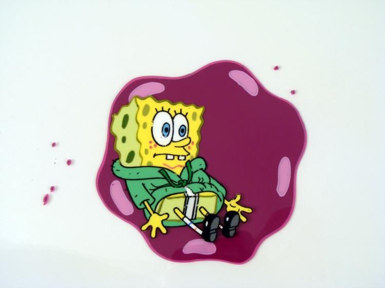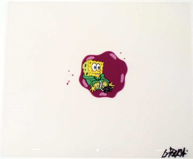 This original animation cel is from the Nickelodeon TV show SpongeBob Squarepants. The story takes place under the deep blue sea in Bikini Bottom, where SpongeBob resides. SpongeBob, who is a yellow, porous sponge, is your typical happy-go-lucky character, * as he is always cheerful and enjoys making people laugh. Patrick Star, SpongeBob's neighbor who is a starfish, is your average children's show idiot, as he boasts knowing nothing and is often getting himself into ridiculous situations. Between the homes of * these two lies the home of the miserable Squidward, a squid, who is known for being grouchy and playing tricks on SpongeBob and Patrick. Both SpongeBob and Squidward work at the Krusty Krab, a fast food business run by the greedy money-loving Mr. Krabs, a * crab, the arch rival of the evil, possibly misunderstood, Plankton. Another neighbor, Sandy Cheeks, an athletic squirrel who normally wears an astronaut's space suit, was introduced in "Tea at the Treedome." She spends most of her time inventing and experimenting. * * Poor Spongebob, trapped forever... * * * * * Original Production Animated Cel Overall Size of Cel: 10 1/2" x 12 1/2" Very Good Condition * This is an original hand-painted cel was used in the production of an episode of "SpongeBob SquarePants." Each one-of-a-kind cel * represents a slight change in position of the characters. When individually photographed and projected in rapid succession, the images appear to move. * * To create production cels, the original animator's drawing is transferred onto an acetate cel (by hand-inking and/or photo copying). The cel is then hand-painted on the reverse side. The cel received by the winning bidder may be ever so slightly different * from the one in the auction photos. * * The cel is ready to be matted and framed. The animator's notations are at the bottom of the cel. There is some slight paint fade to Spongebob's outline. * * *