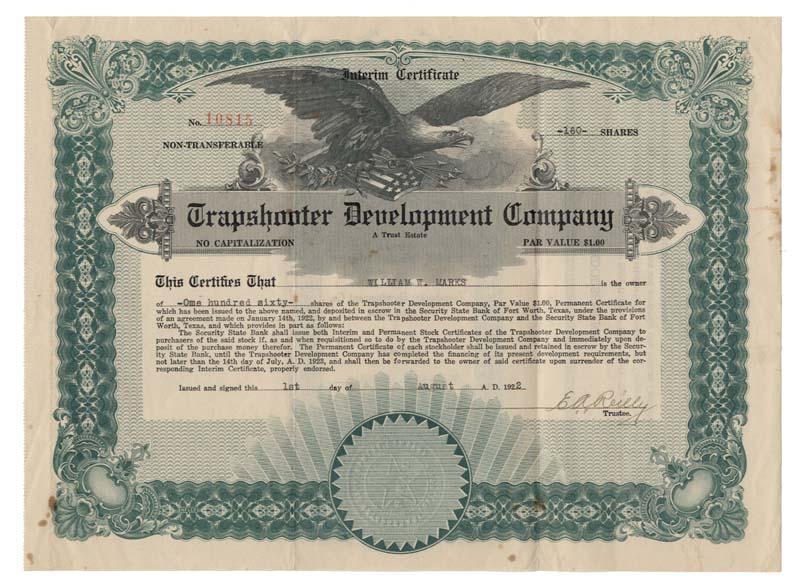 1922, Texas. Stock certificate for 160 shares. Green/Black. Vignette of eagle with spread wings at top center. Uncancelled minor staining at edges and border and fine.