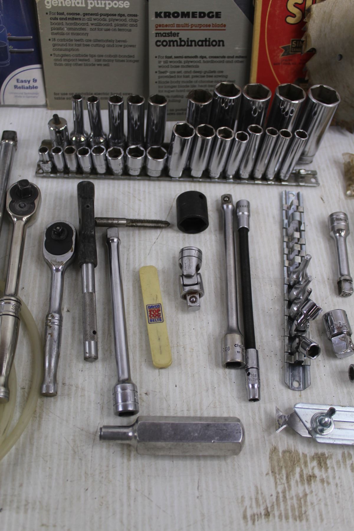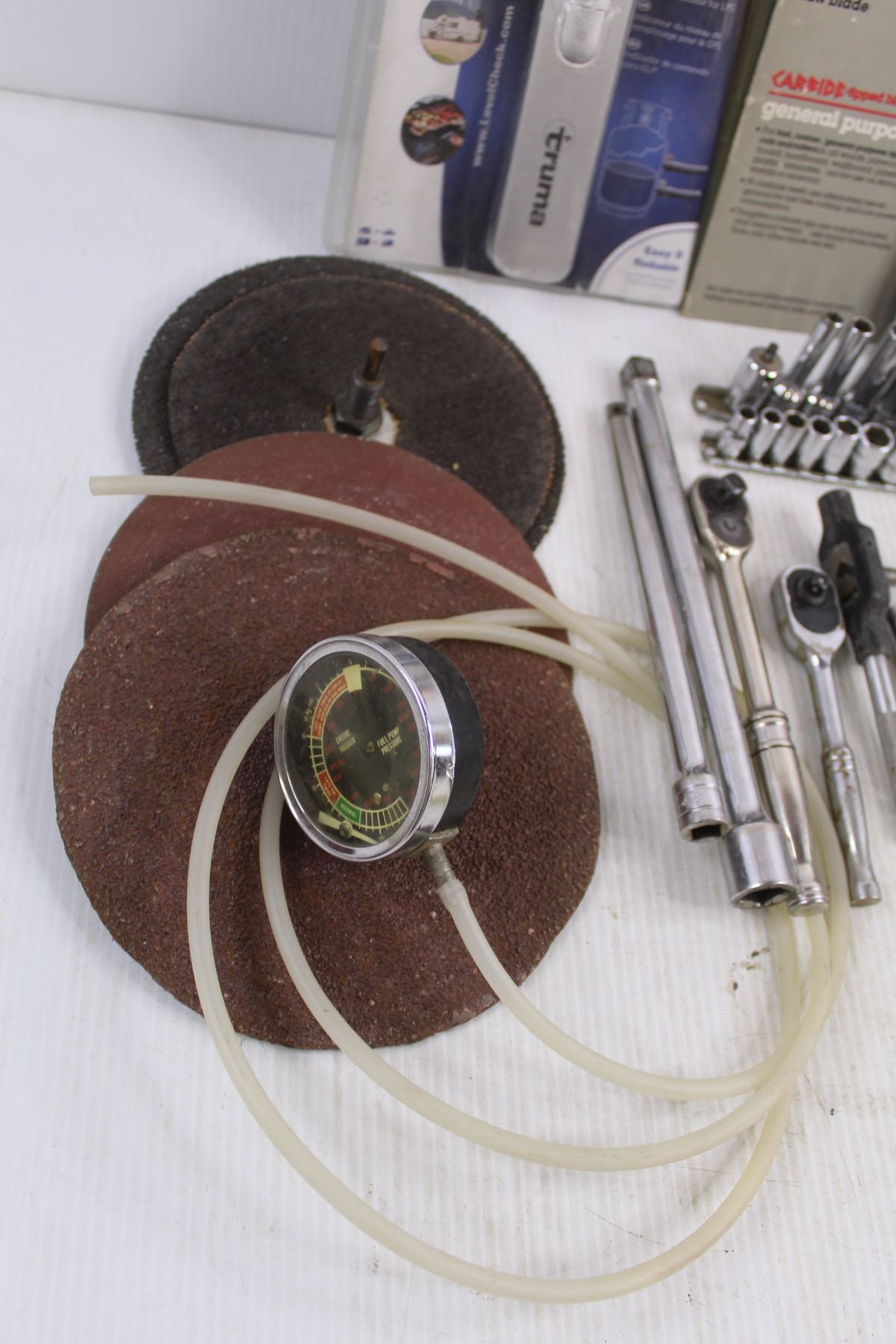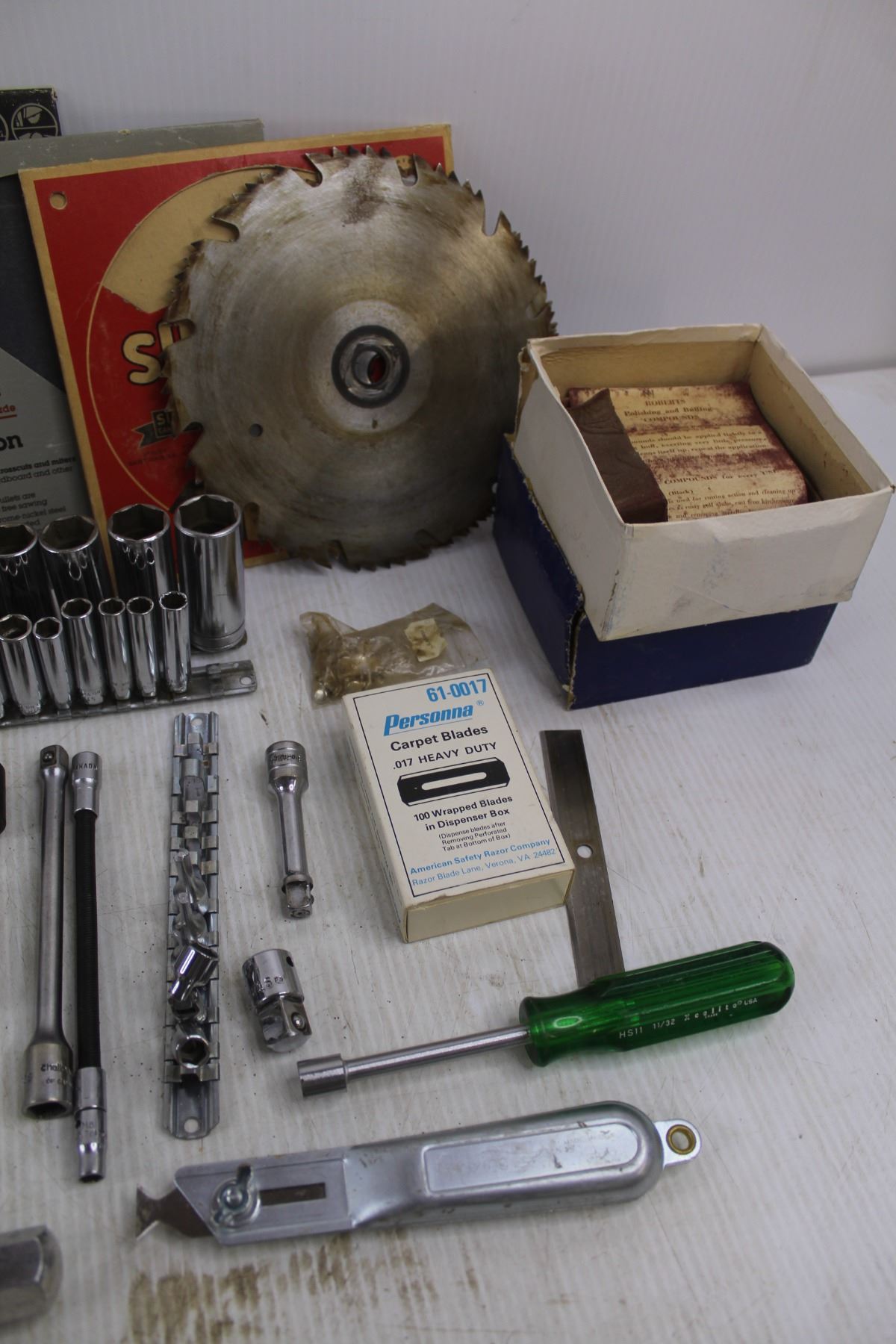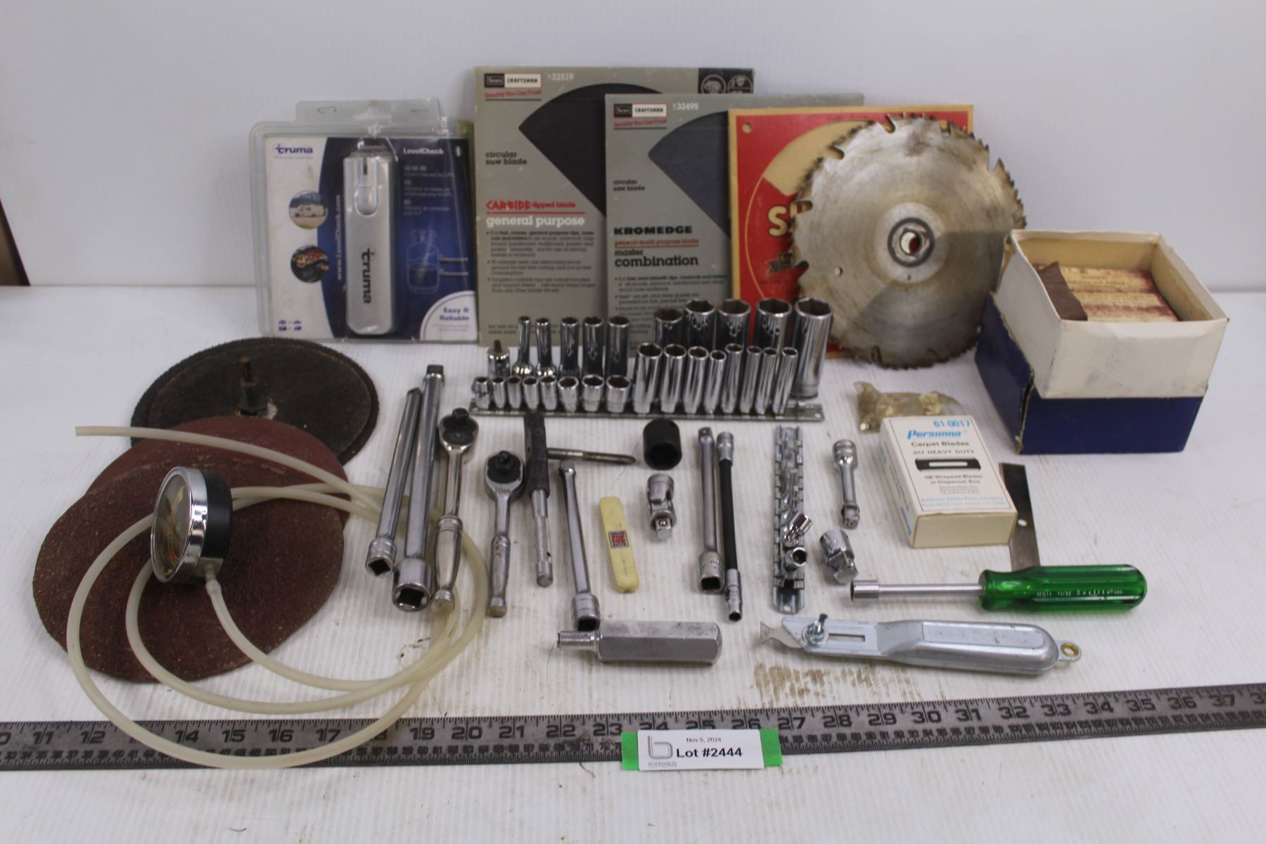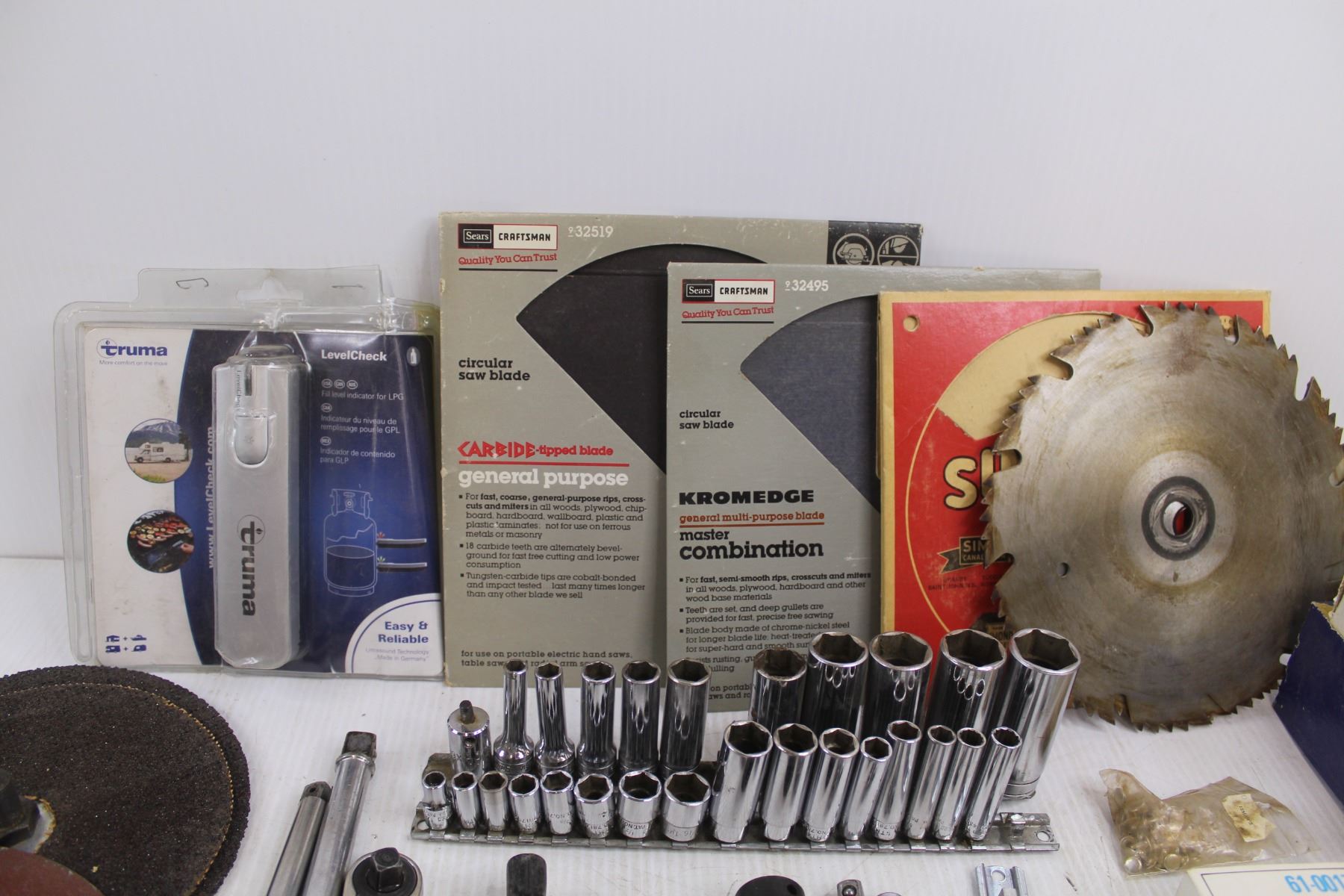 Trauma Level Check, Assorted Saw Blades, Assorted Sanding Disks, Assorted Ratchets & Sockets, Carpet Blades - As Is, Misc.